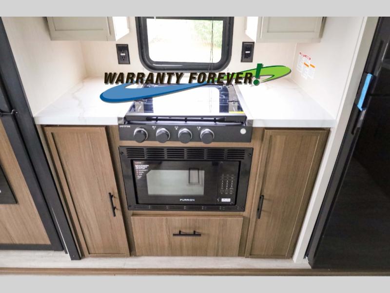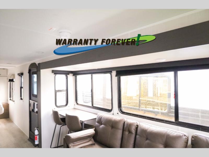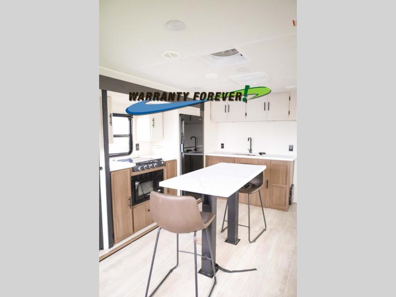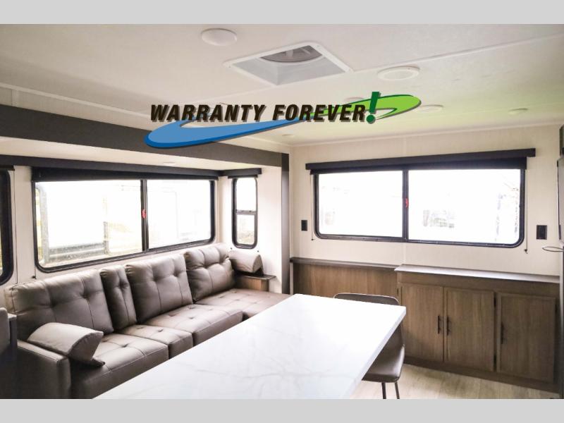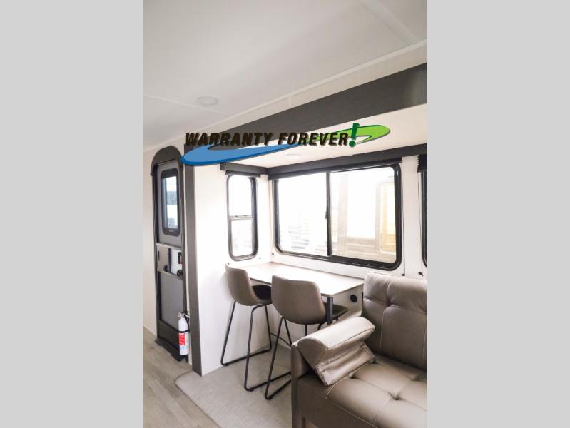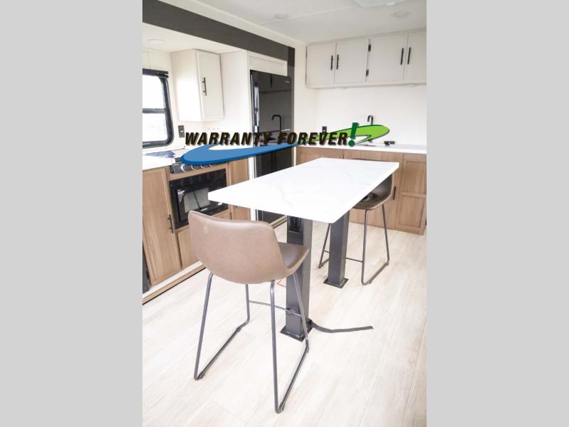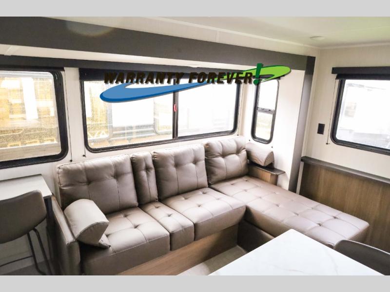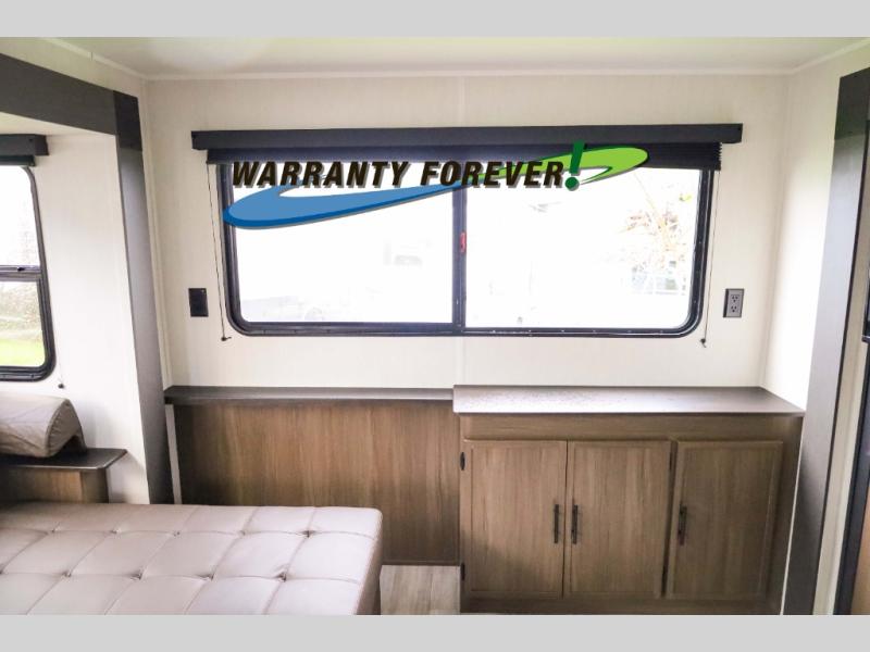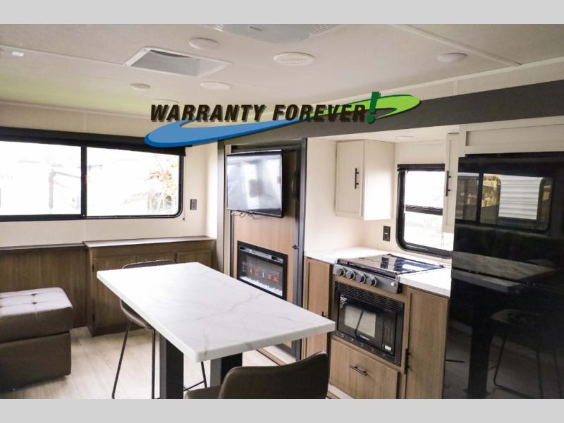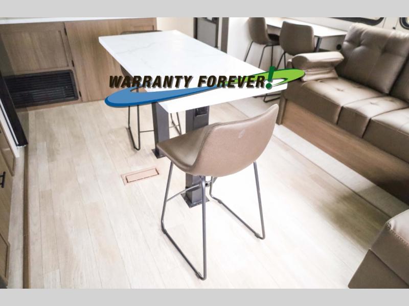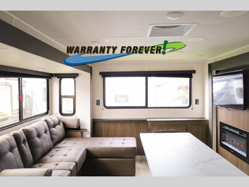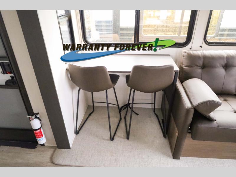 There is ample space to move about in this travel trailer thanks to the dual opposing slides! Here, you'll find an L-shaped sofa with a chaise lounge in direct view of TV and fireplace. There is also a hidden pantry behind the TV for snacks and movies! The center farm table includes four stools so you can gather around for meal times, and the desk with a chair will provide a place for you to get some work done if needed. This unit features a full bath towards the front private bedroom for easy access at night, and you're sure to get a great night's rest on the camp king bed!