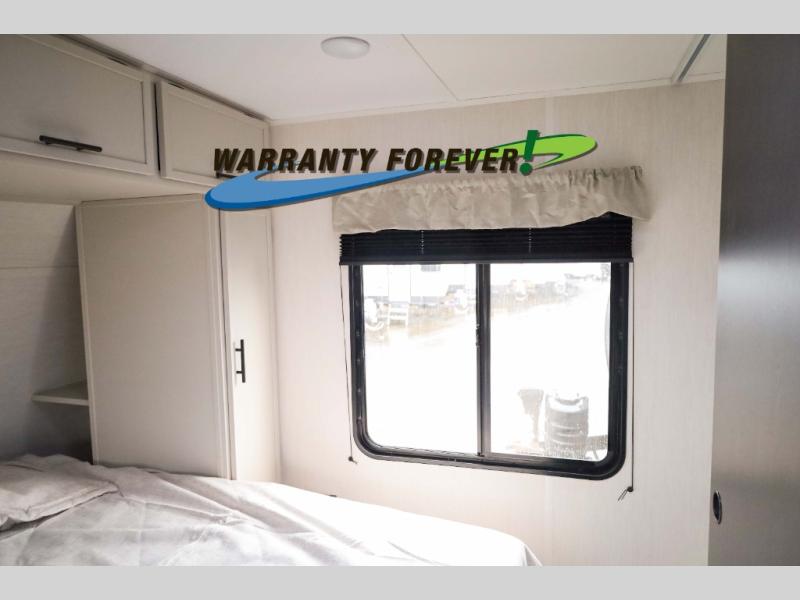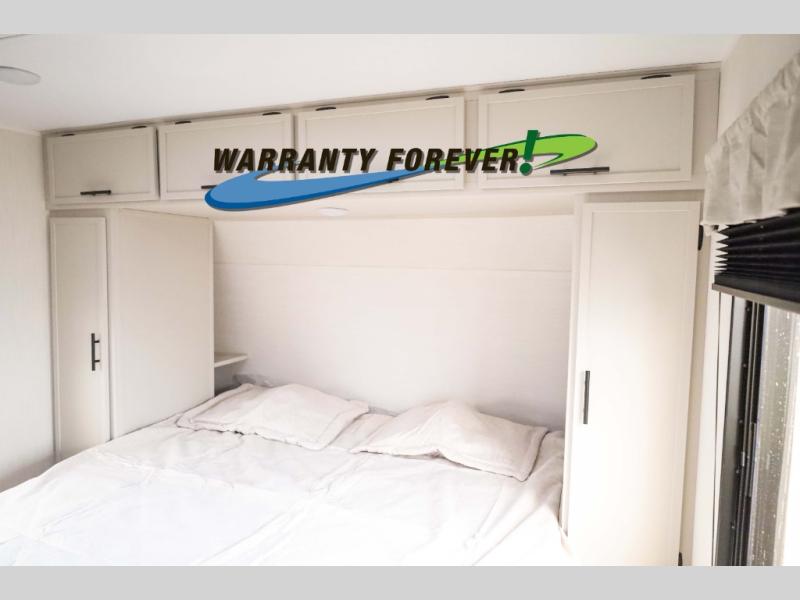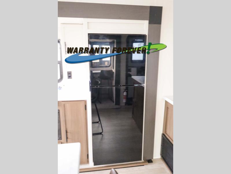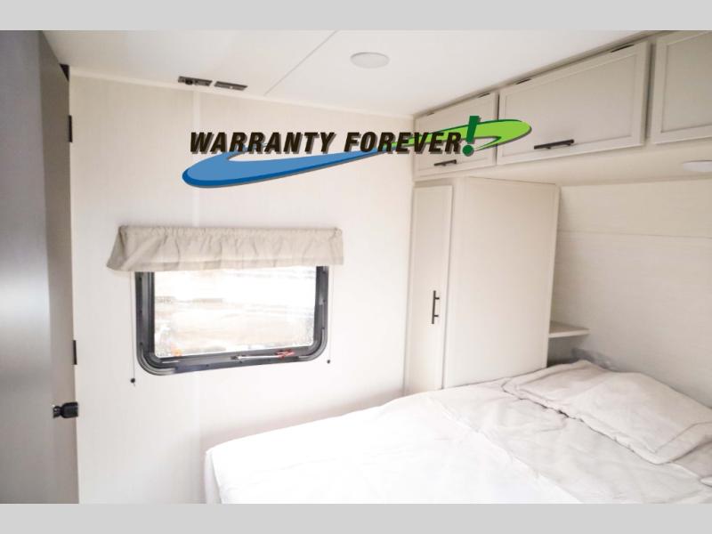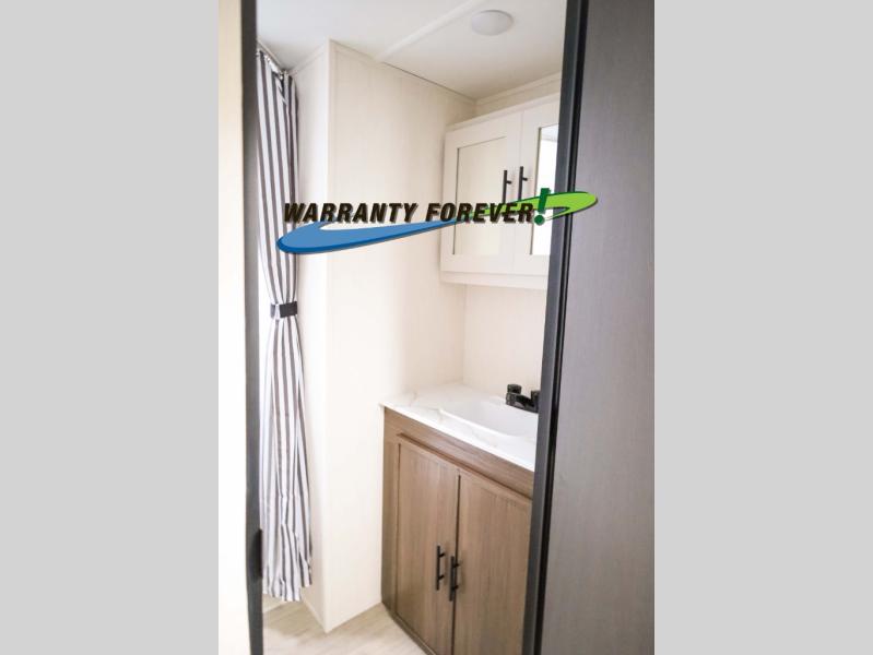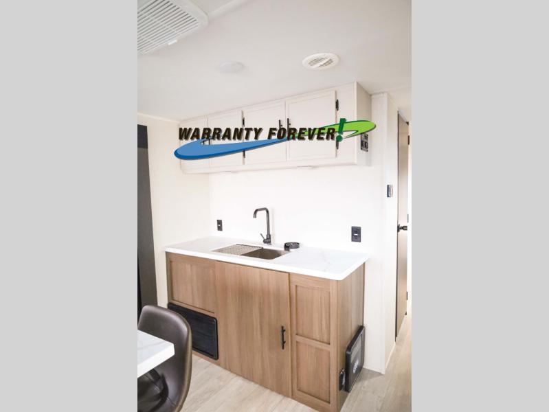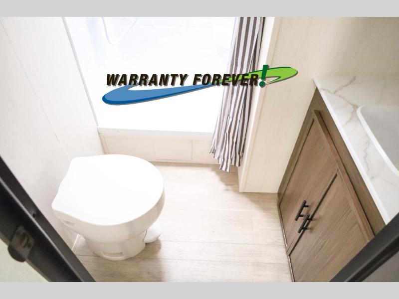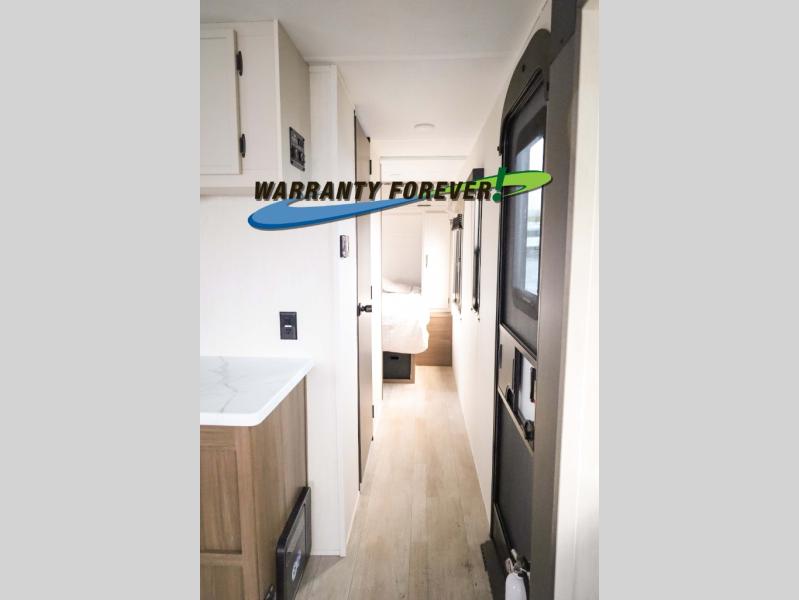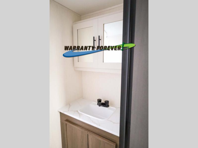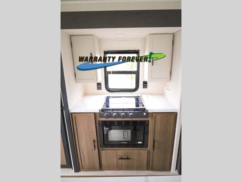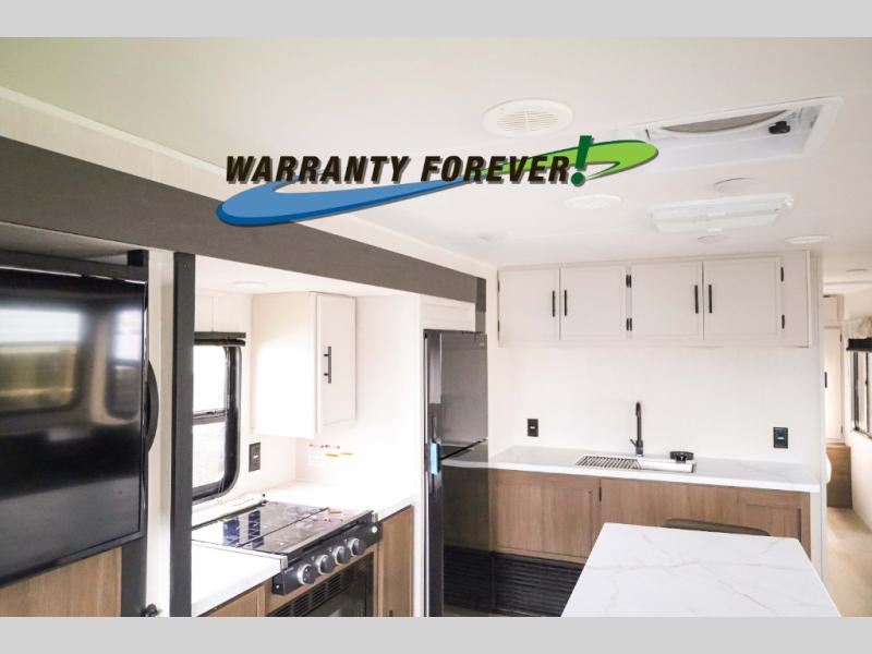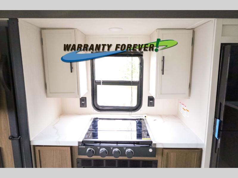 There is ample space to move about in this travel trailer thanks to the dual opposing slides! Here, you'll find an L-shaped sofa with a chaise lounge in direct view of TV and fireplace. There is also a hidden pantry behind the TV for snacks and movies! The center farm table includes four stools so you can gather around for meal times, and the desk with a chair will provide a place for you to get some work done if needed. This unit features a full bath towards the front private bedroom for easy access at night, and you're sure to get a great night's rest on the camp king bed!