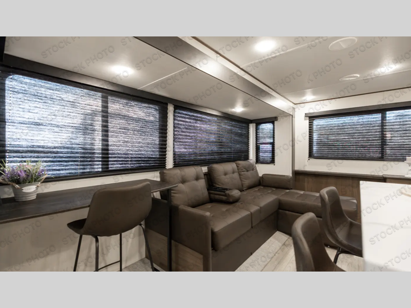 There is ample space to move about in this travel trailer thanks to the dual opposing slides! Here, you'll find an L-shaped sofa with a chaise lounge in direct view of TV and fireplace. There is also a hidden pantry behind the TV for snacks and movies! The center farm table includes four stools so you can gather around for meal times, and the desk with a chair will provide a place for you to get some work done if needed. This unit features a full bath towards the front private bedroom for easy access at night, and you're sure to get a great night's rest on the camp king bed!