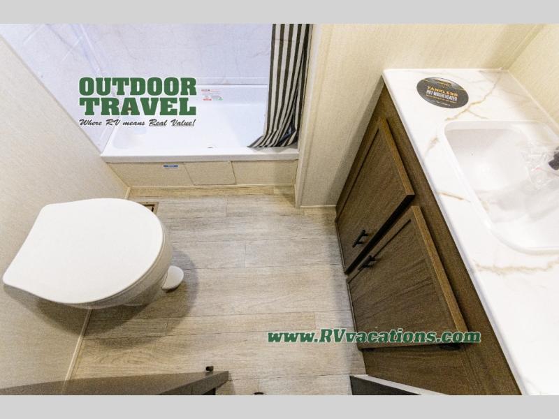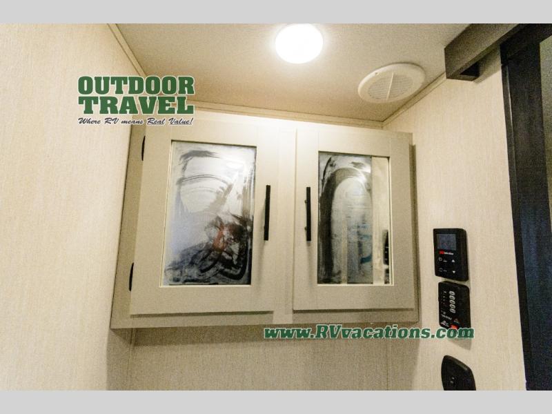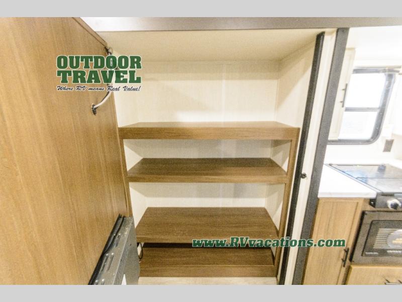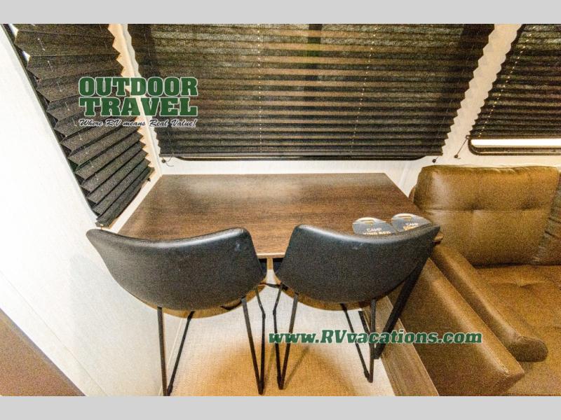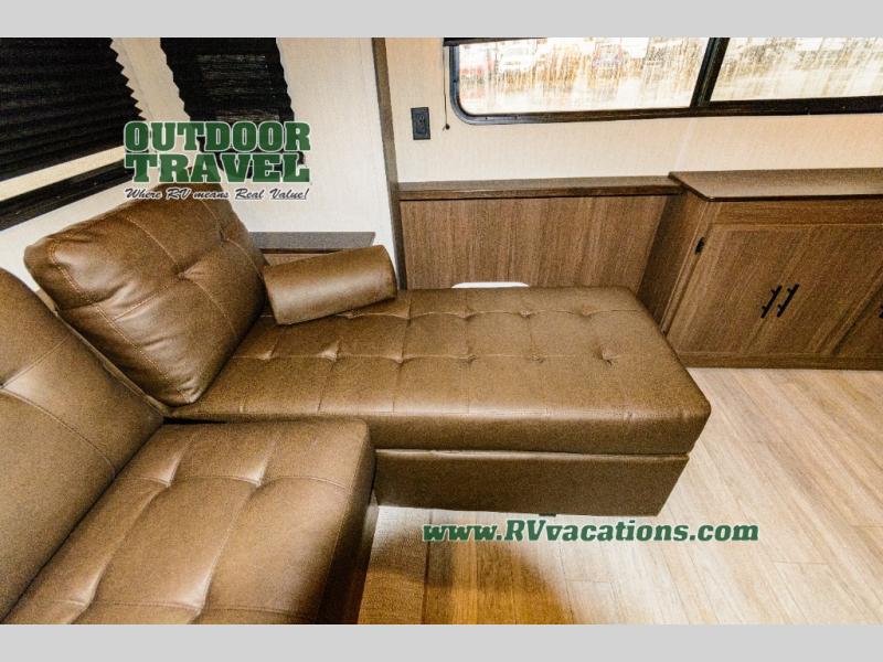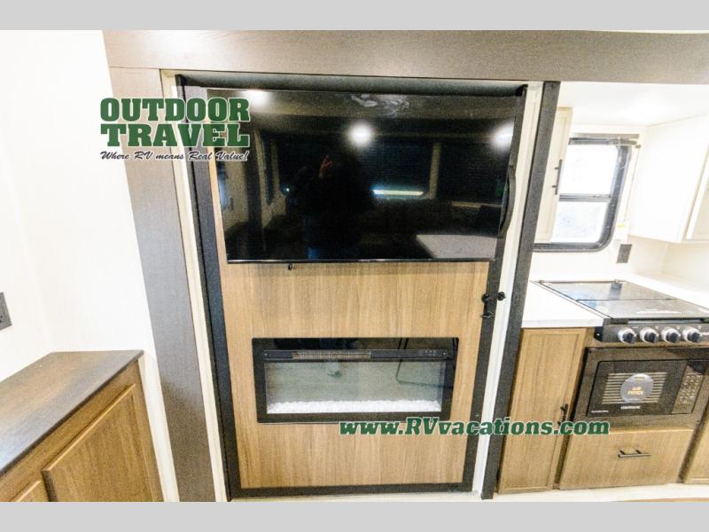 There is ample space to move about in this travel trailer thanks to the dual opposing slides! Here, you'll find an L-shaped sofa with a chaise lounge in direct view of TV and fireplace. There is also a hidden pantry behind the TV for snacks and movies! The center farm table includes four stools so you can gather around for meal times, and the desk with a chair will provide a place for you to get some work done if needed. This unit features a full bath towards the front private bedroom for easy access at night, and you're sure to get a great night's rest on the camp king bed!