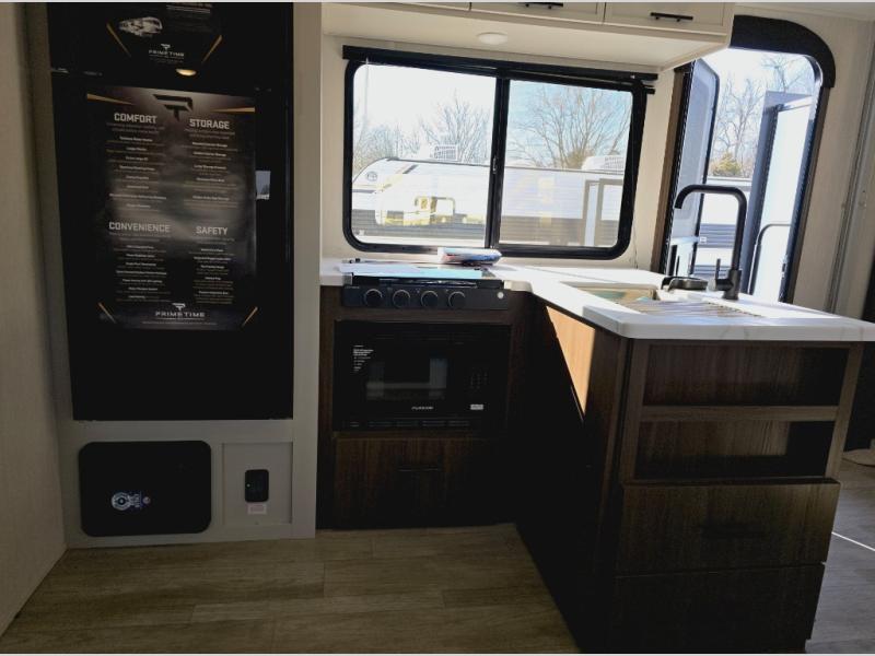 With any Avenger travel trailer by Prime Time RV, you will find innovation, a solid build, and comfort at every turn. Each model is built with Tuff Coat on the exterior metal, a fully enclosed underbelly, and a PVC roof membrane to help extend the life of your trailer. You will also find automotive name badging on the exterior, along with an exterior shower, front rail LED light strips, plus an XL padded entry grab handle to name a few conveniences. There are plenty of storage spaces inside, as well as Congoleum flooring and woven PVC marine grade slide out flooring, a designer shower surround, and seamless pressed countertops. You are sure to appreciate the onboard water filtration system, tankless water heater, plus 30K BTU furnace and 15K ducted A/C to help keep you comfortable.