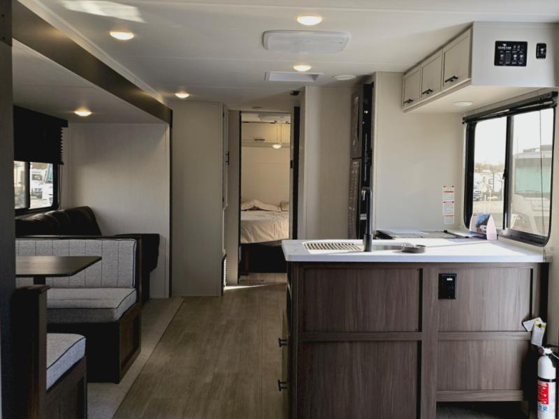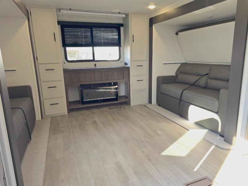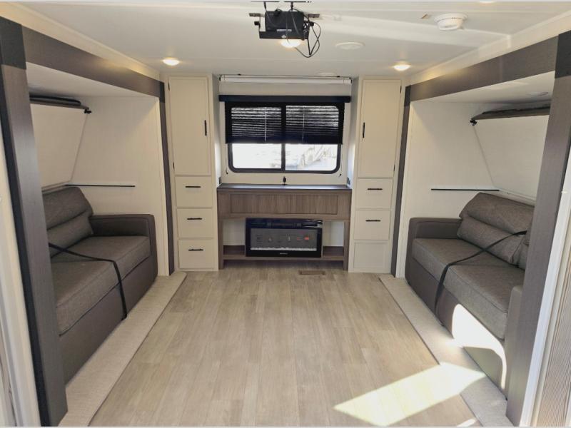 The whole gang will love camping in this spacious travel trailer that can sleep nine to ten people! The rear bunkhouse features dual opposing slides with hide-a-bed sofas and hinged bunk beds, plus a hidden desk, fireplace, and projector for movie nights! You'll appreciate your own space up front in the private bedroom, complete with a camp king bed and storage space. Everyone can meet in the combined kitchen and living area as the chef of your group makes breakfast in the fully equipped kitchen. There is a sofa and booth dinette here for seating space, or you can take your plate outdoors to sit under the power awning. And the outdoor refrigerator is sure to come in handy when you want another cold drink!