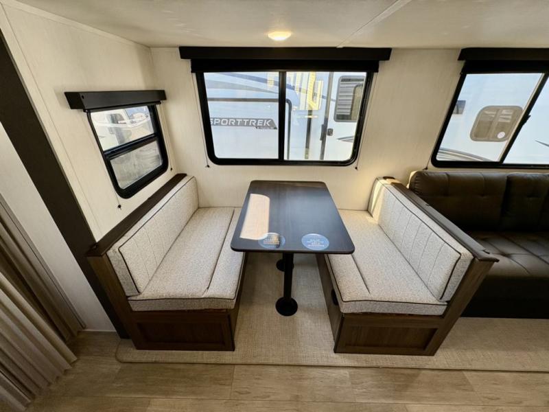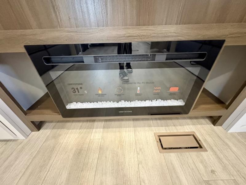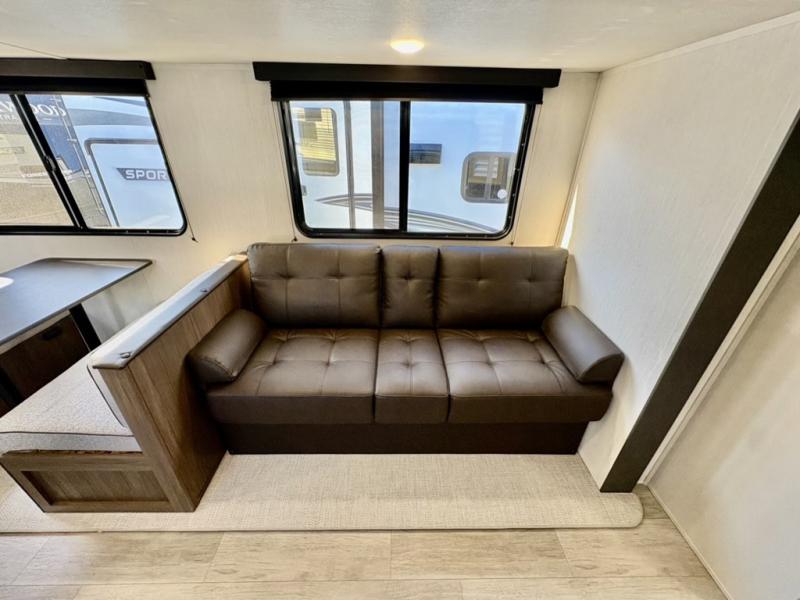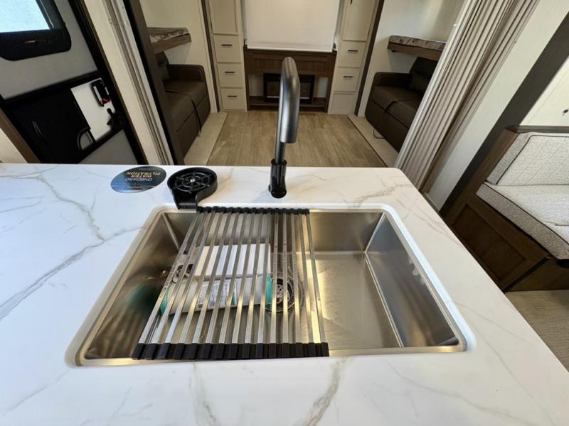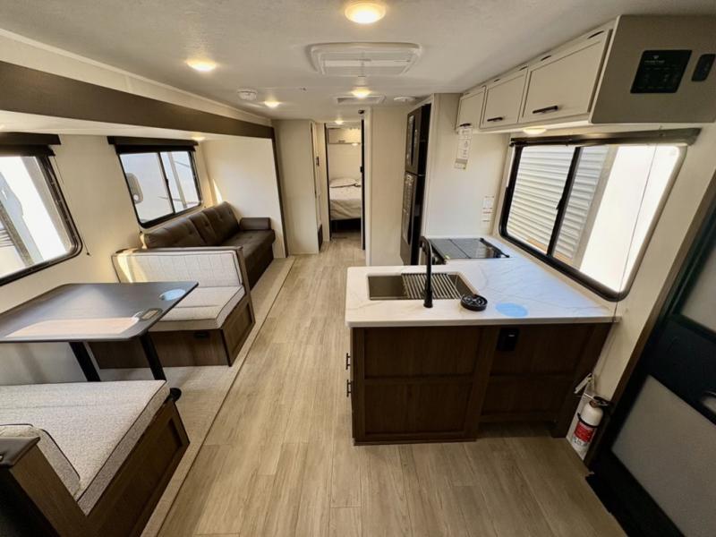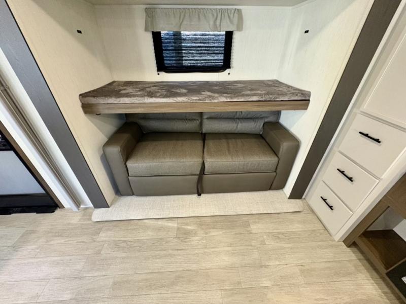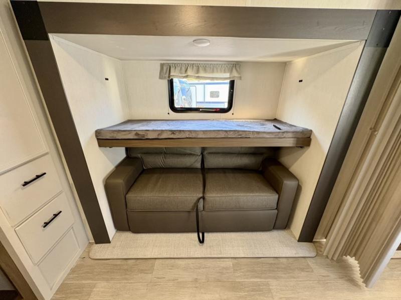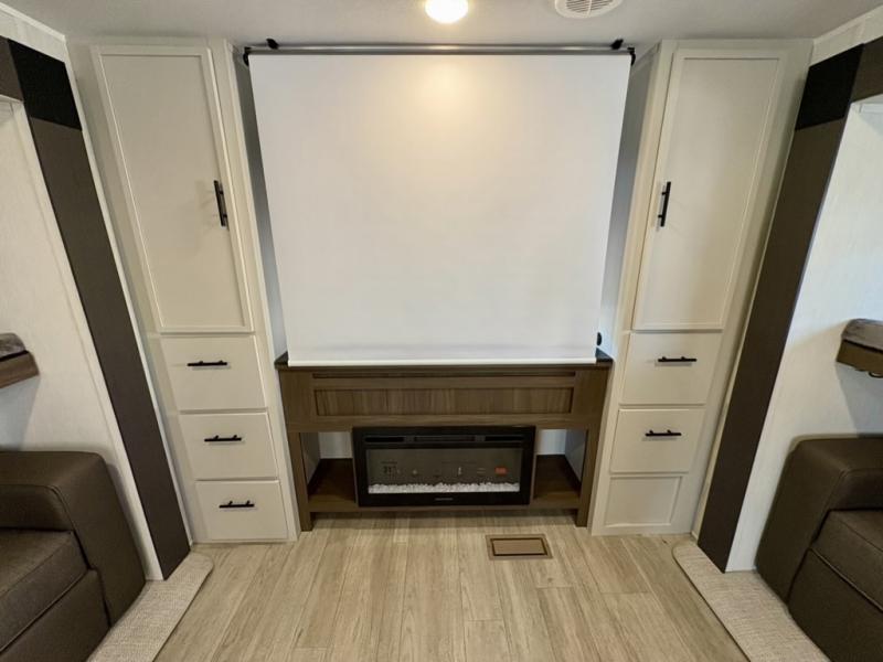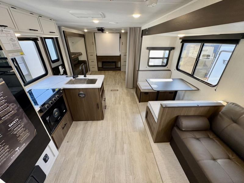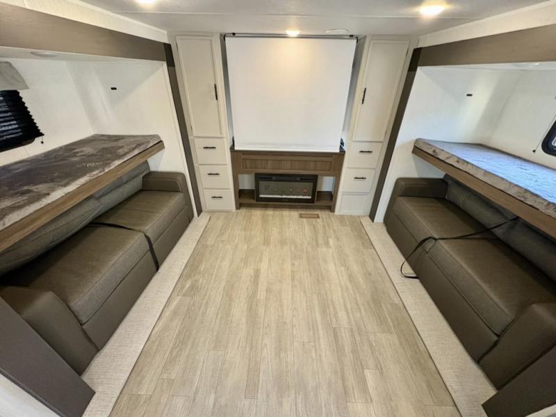 The whole gang will love camping in this spacious travel trailer that can sleep nine to ten people! The rear bunkhouse features dual opposing slides with hide-a-bed sofas and hinged bunk beds, plus a hidden desk, fireplace, and projector for movie nights! You'll appreciate your own space up front in the private bedroom, complete with a camp king bed and storage space. Everyone can meet in the combined kitchen and living area as the chef of your group makes breakfast in the fully equipped kitchen. There is a sofa and booth dinette here for seating space, or you can take your plate outdoors to sit under the power awning. And the outdoor refrigerator is sure to come in handy when you want another cold drink!