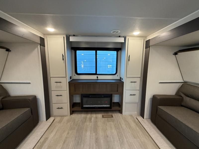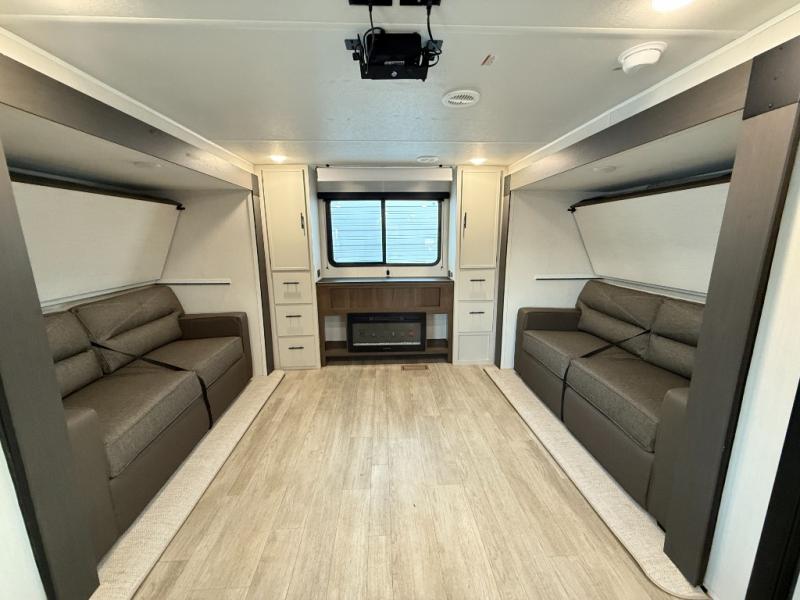 The whole gang will love camping in this spacious travel trailer that can sleep nine to ten people! The rear bunkhouse features dual opposing slides with hide-a-bed sofas and hinged bunk beds, plus a hidden desk, fireplace, and projector for movie nights! You'll appreciate your own space up front in the private bedroom, complete with a camp king bed and storage space. Everyone can meet in the combined kitchen and living area as the chef of your group makes breakfast in the fully equipped kitchen. There is a sofa and booth dinette here for seating space, or you can take your plate outdoors to sit under the power awning. And the outdoor refrigerator is sure to come in handy when you want another cold drink!