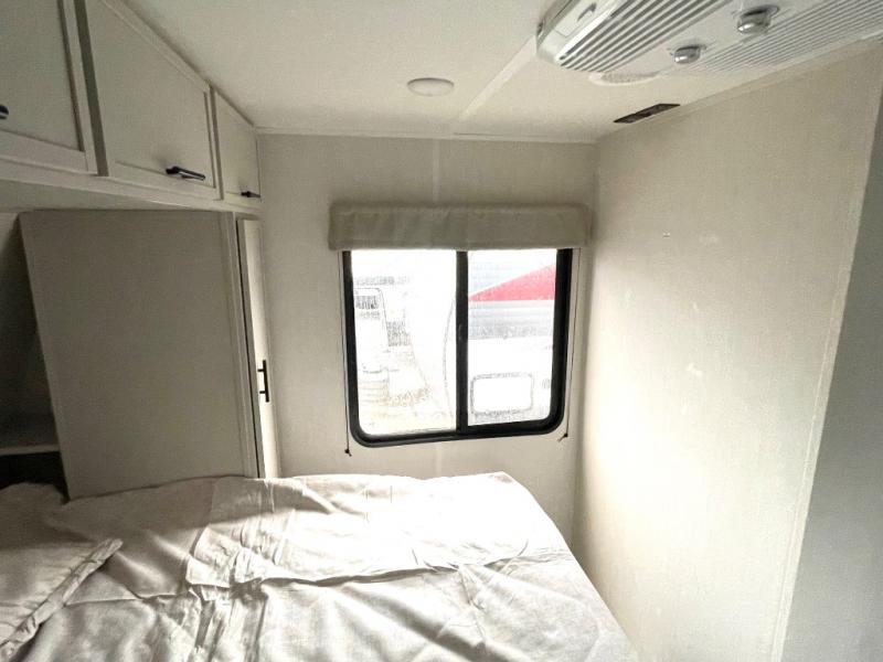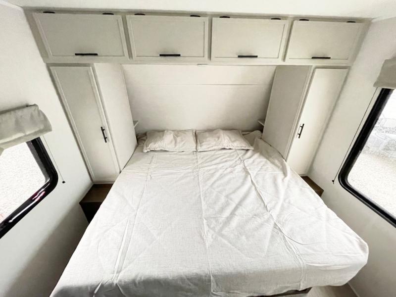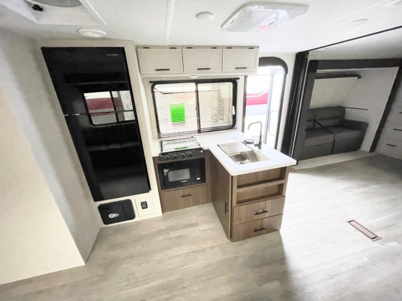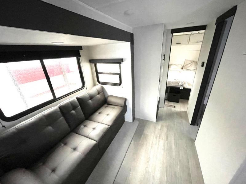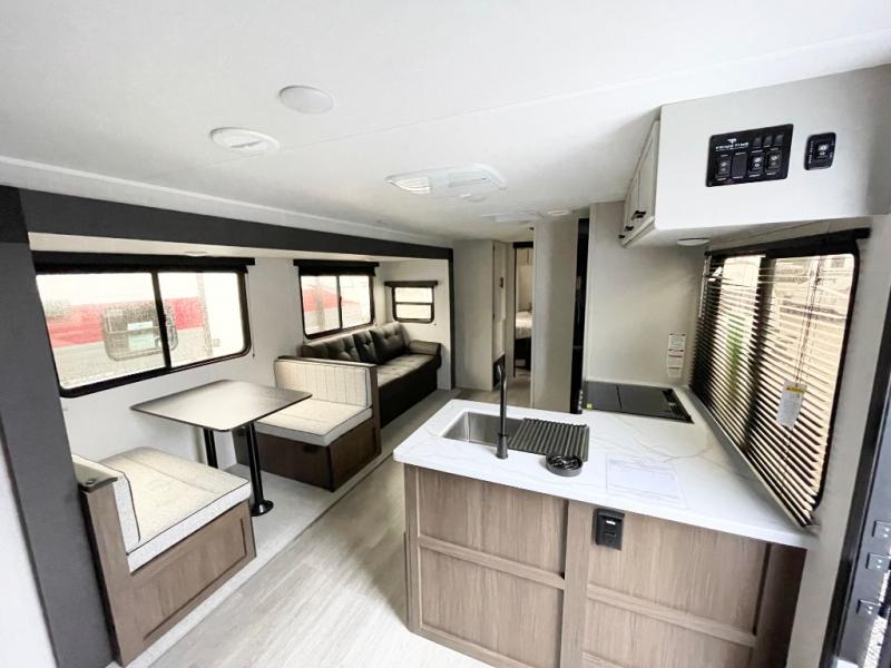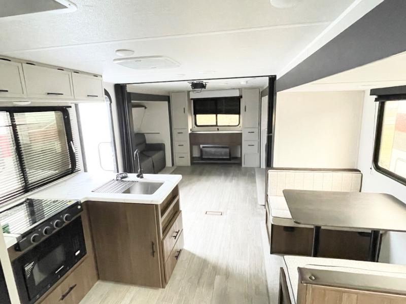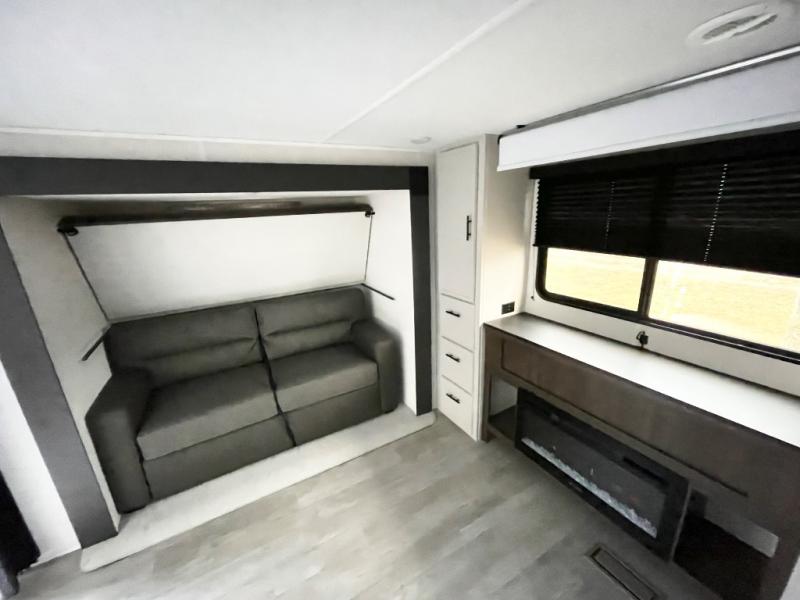 The whole gang will love camping in this spacious travel trailer that can sleep nine to ten people! The rear bunkhouse features dual opposing slides with hide-a-bed sofas and hinged bunk beds, plus a hidden desk, fireplace, and projector for movie nights! You'll appreciate your own space up front in the private bedroom, complete with a camp king bed and storage space. Everyone can meet in the combined kitchen and living area as the chef of your group makes breakfast in the fully equipped kitchen. There is a sofa and booth dinette here for seating space, or you can take your plate outdoors to sit under the power awning. And the outdoor refrigerator is sure to come in handy when you want another cold drink!