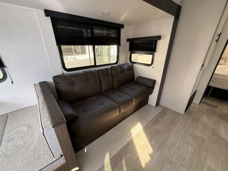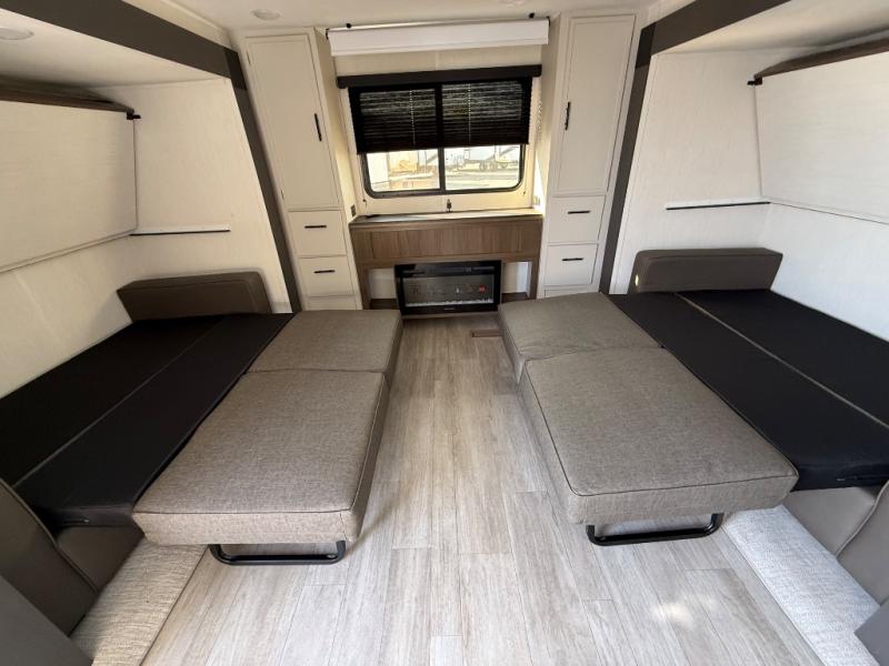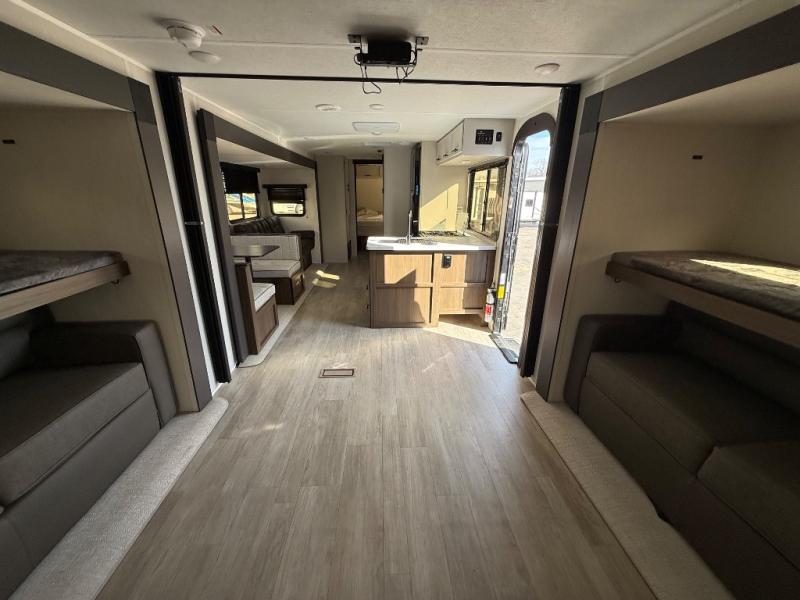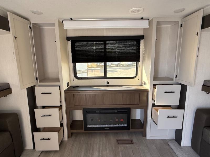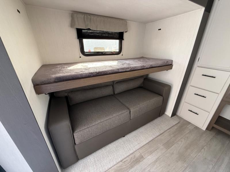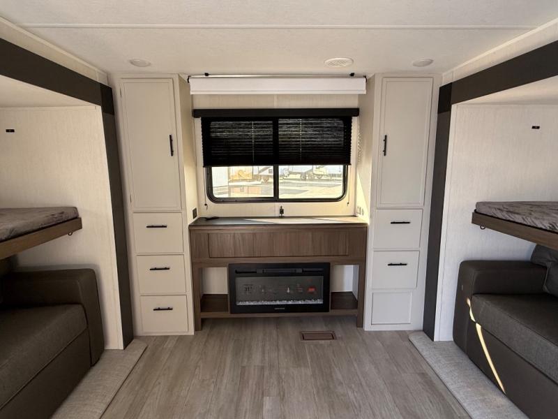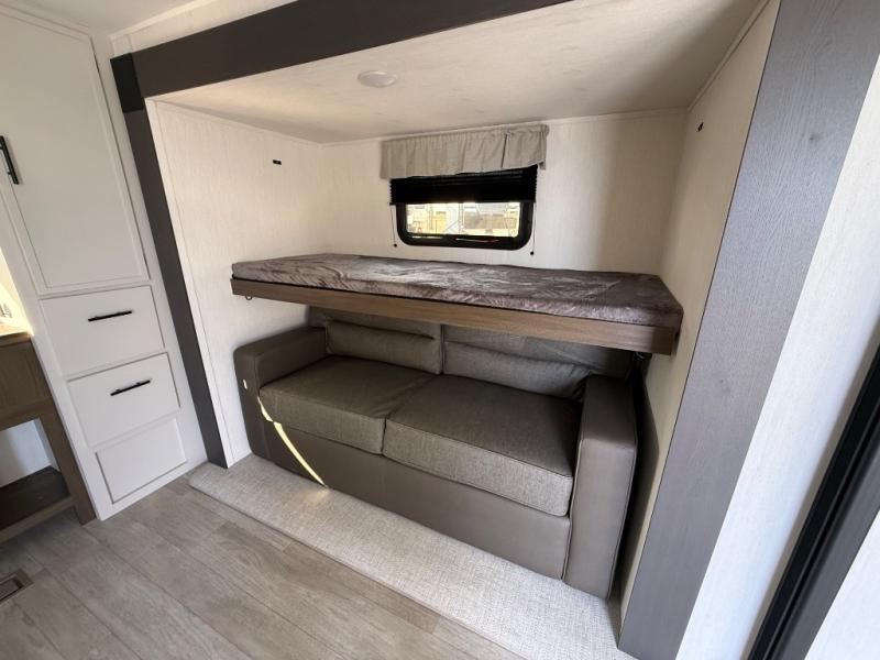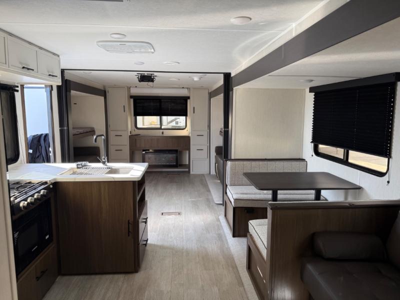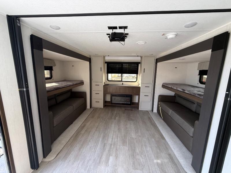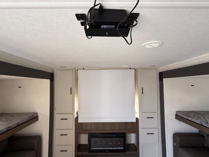 The whole gang will love camping in this spacious travel trailer that can sleep nine to ten people! The rear bunkhouse features dual opposing slides with hide-a-bed sofas and hinged bunk beds, plus a hidden desk, fireplace, and projector for movie nights! You'll appreciate your own space up front in the private bedroom, complete with a camp king bed and storage space. Everyone can meet in the combined kitchen and living area as the chef of your group makes breakfast in the fully equipped kitchen. There is a sofa and booth dinette here for seating space, or you can take your plate outdoors to sit under the power awning. And the outdoor refrigerator is sure to come in handy when you want another cold drink!