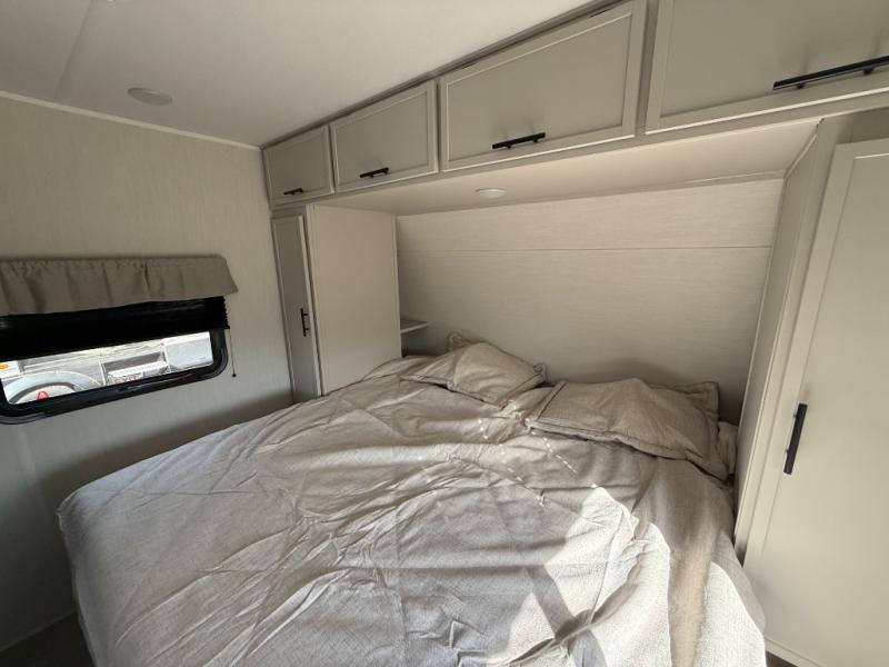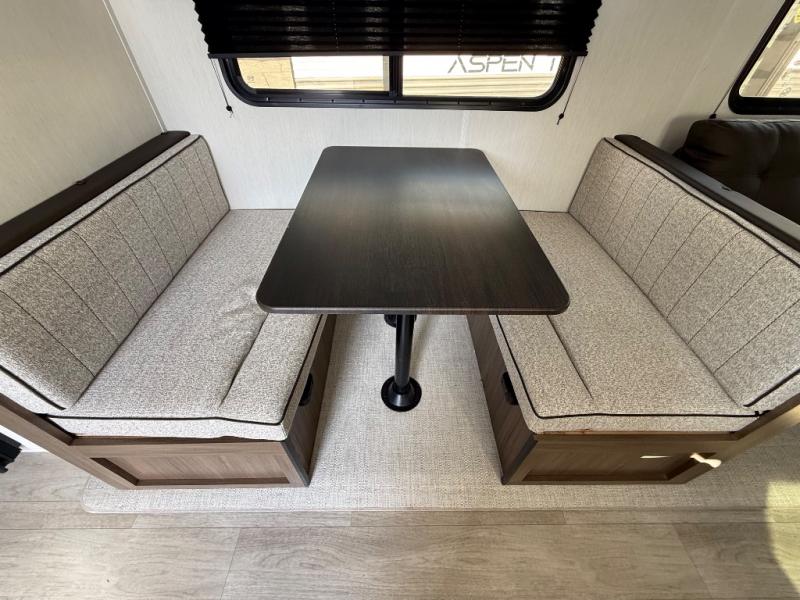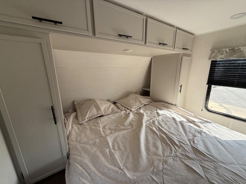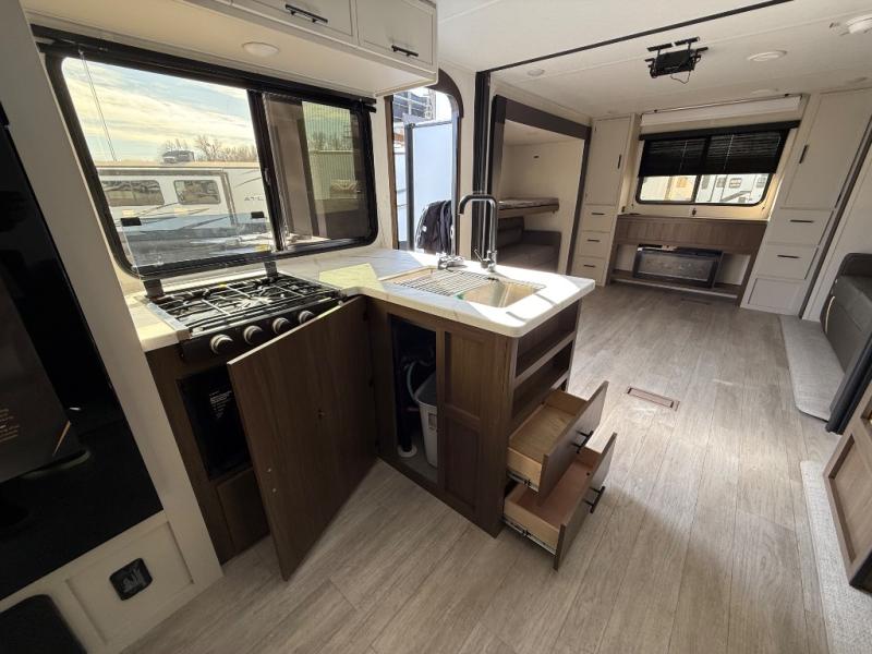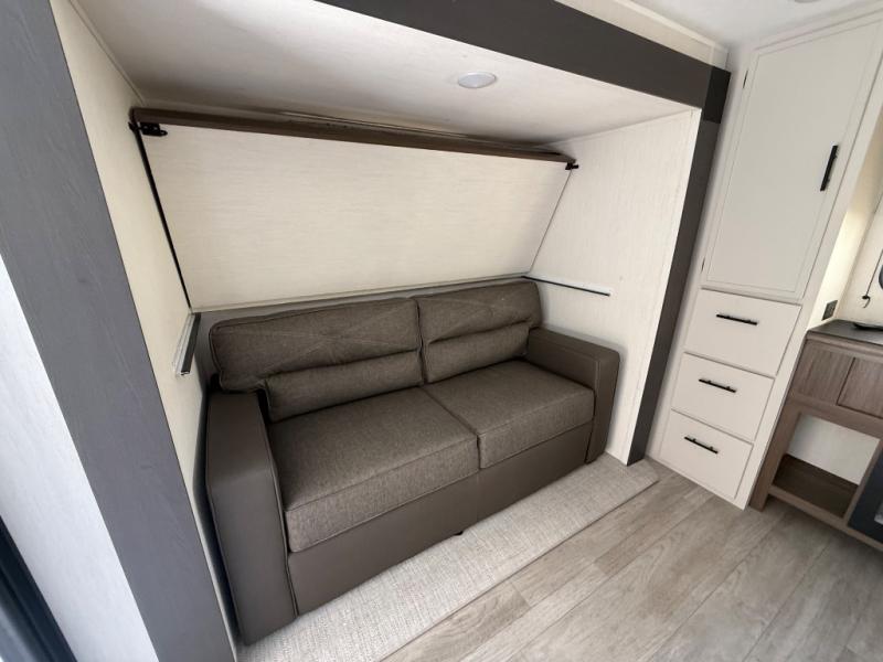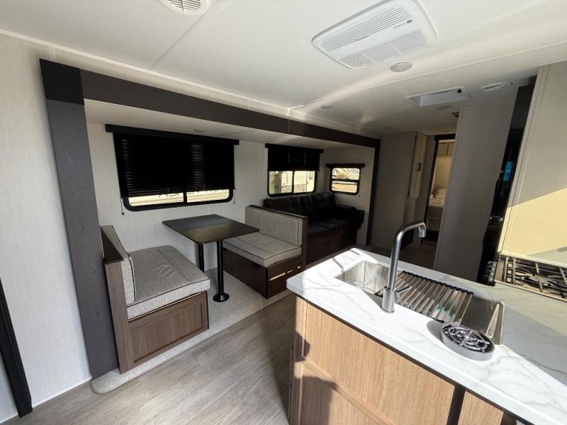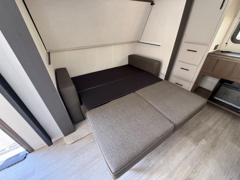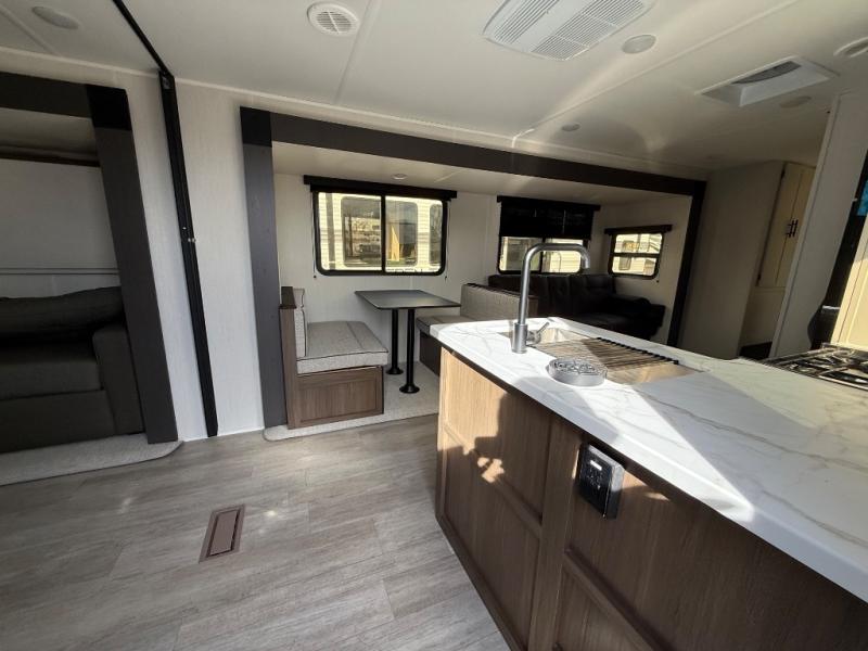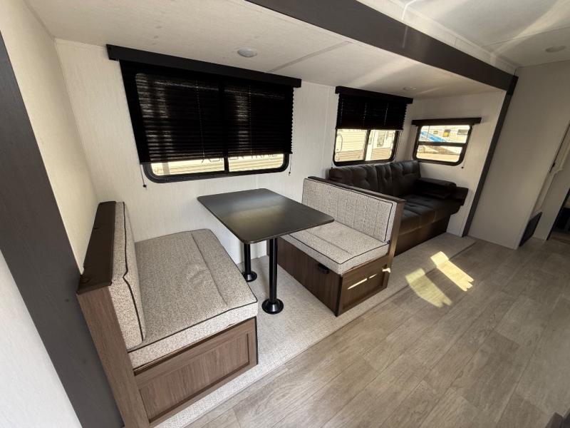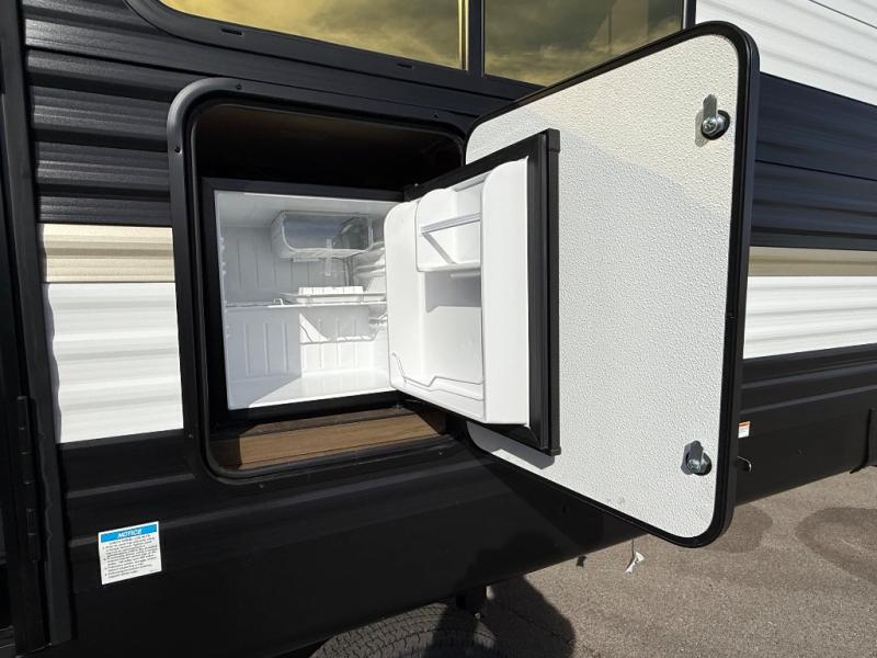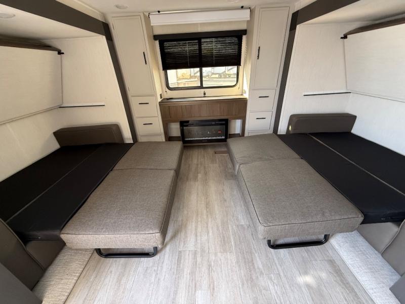 The whole gang will love camping in this spacious travel trailer that can sleep nine to ten people! The rear bunkhouse features dual opposing slides with hide-a-bed sofas and hinged bunk beds, plus a hidden desk, fireplace, and projector for movie nights! You'll appreciate your own space up front in the private bedroom, complete with a camp king bed and storage space. Everyone can meet in the combined kitchen and living area as the chef of your group makes breakfast in the fully equipped kitchen. There is a sofa and booth dinette here for seating space, or you can take your plate outdoors to sit under the power awning. And the outdoor refrigerator is sure to come in handy when you want another cold drink!