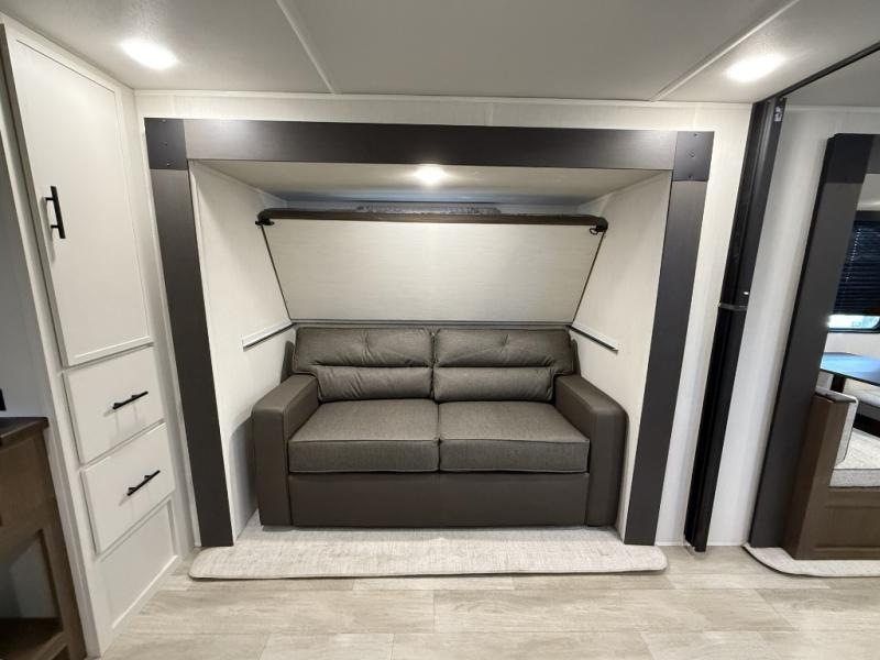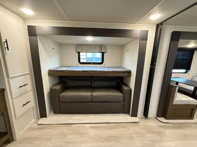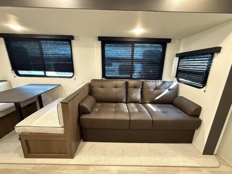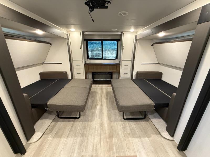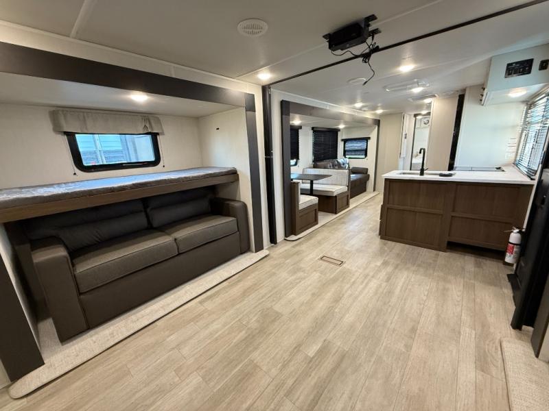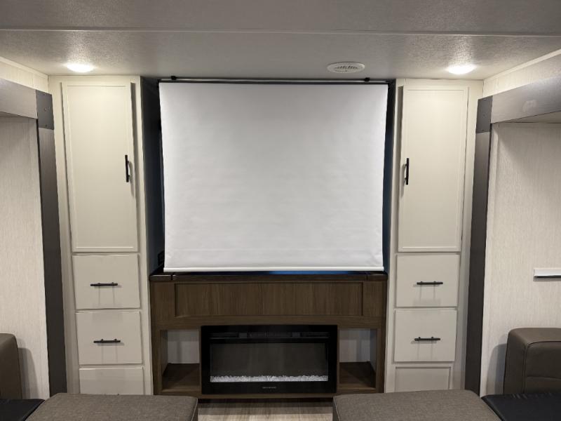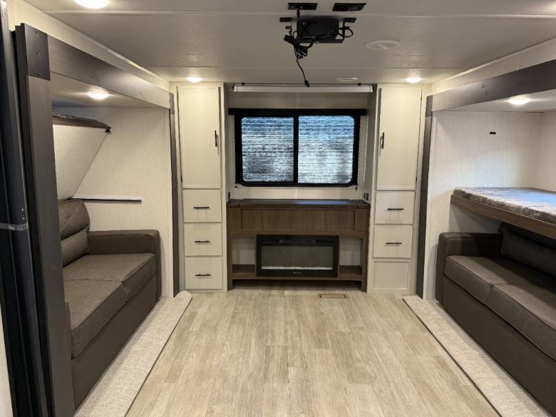 The whole gang will love camping in this spacious travel trailer that can sleep nine to ten people! The rear bunkhouse features dual opposing slides with hide-a-bed sofas and hinged bunk beds, plus a hidden desk, fireplace, and projector for movie nights! You'll appreciate your own space up front in the private bedroom, complete with a camp king bed and storage space. Everyone can meet in the combined kitchen and living area as the chef of your group makes breakfast in the fully equipped kitchen. There is a sofa and booth dinette here for seating space, or you can take your plate outdoors to sit under the power awning. And the outdoor refrigerator is sure to come in handy when you want another cold drink!