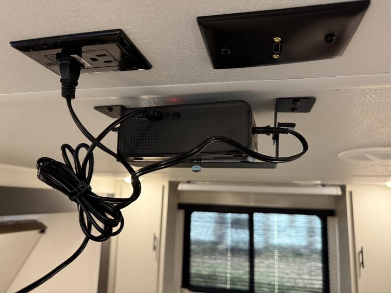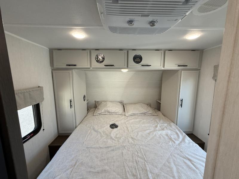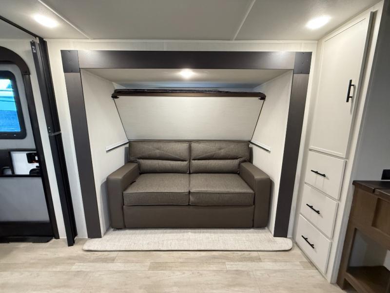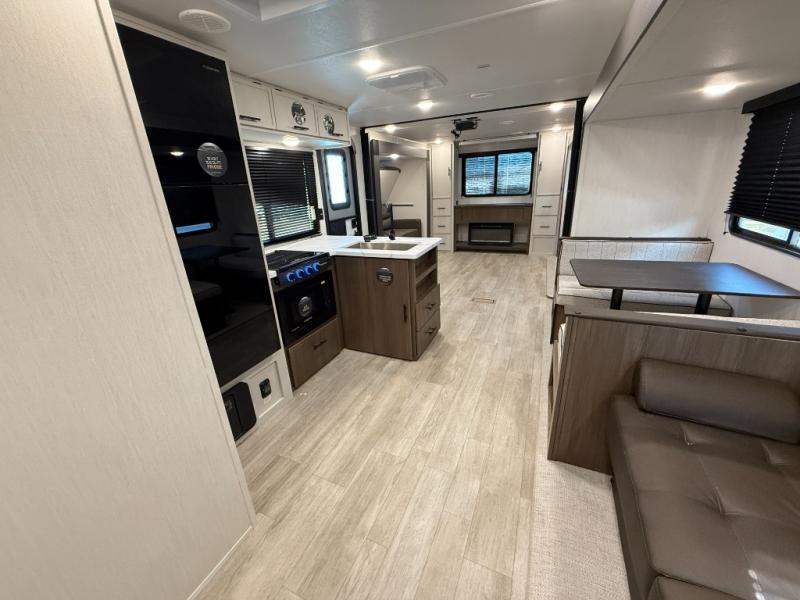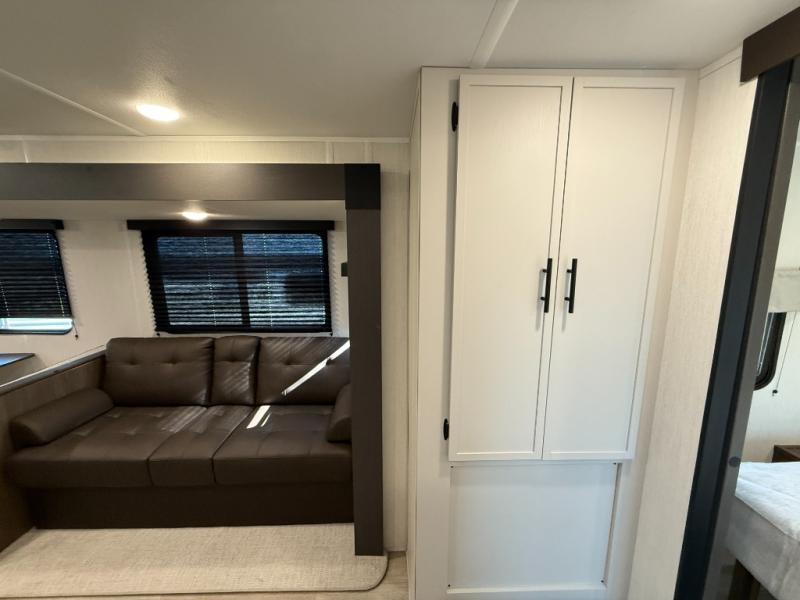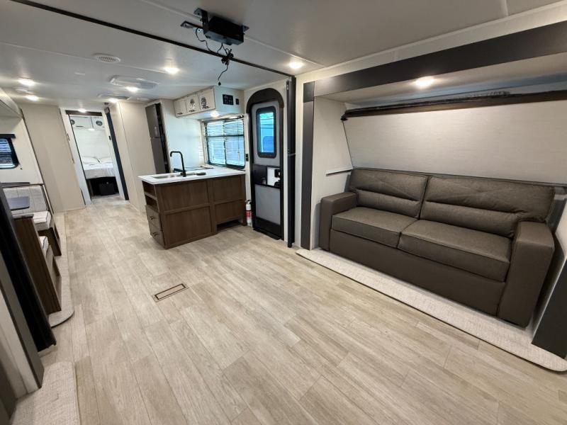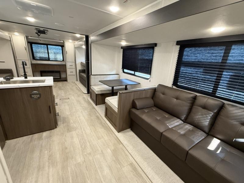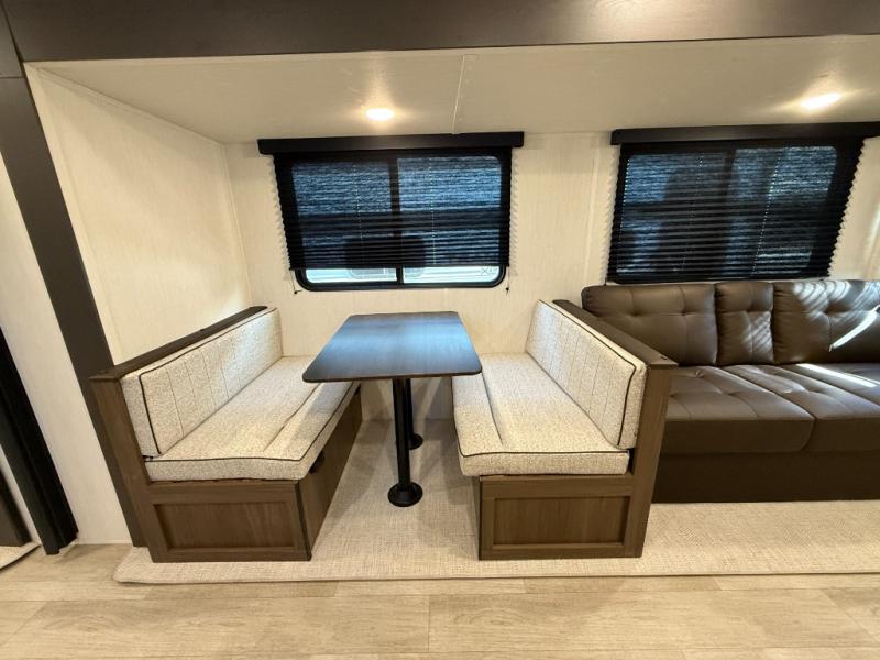The whole gang will love camping in this spacious travel trailer that can sleep nine to ten people! The rear bunkhouse features dual opposing slides with hide-a-bed sofas and hinged bunk beds, plus a hidden desk, fireplace, and projector for movie nights! You'll appreciate your own space up front in the private bedroom, complete with a camp king bed and storage space. Everyone can meet in the combined kitchen and living area as the chef of your group makes breakfast in the fully equipped kitchen. There is a sofa and booth dinette here for seating space, or you can take your plate outdoors to sit under the power awning. And the outdoor refrigerator is sure to come in handy when you want another cold drink!