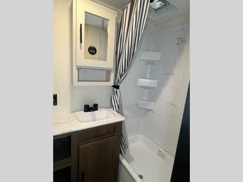With any Avenger travel trailer by Prime Time RV, you will find innovation, a solid build, and comfort at every turn. Each model is built with Tuff Coat on the exterior metal, a fully enclosed underbelly, and a PVC roof membrane to help extend the life of your trailer. You will also find automotive name badging on the exterior, along with an exterior shower, front rail LED light strips, plus an XL padded entry grab handle to name a few conveniences. There are plenty of storage spaces inside, as well as Congoleum flooring and woven PVC marine grade slide out flooring, a designer shower surround, and seamless pressed countertops. You are sure to appreciate the onboard water filtration system, tankless water heater, plus 30K BTU furnace and 15K ducted A/C to help keep you comfortable.