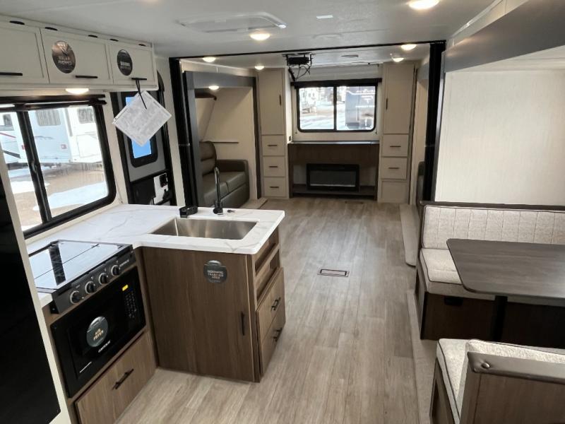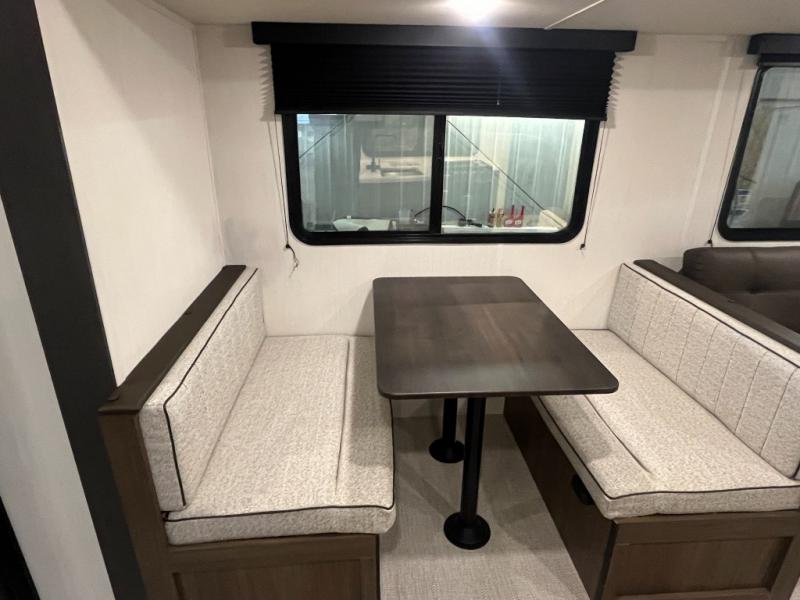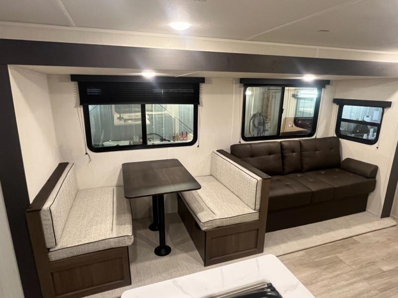 The whole gang will love camping in this spacious travel trailer that can sleep nine to ten people! The rear bunkhouse features dual opposing slides with hide-a-bed sofas and hinged bunk beds, plus a hidden desk, fireplace, and projector for movie nights! You'll appreciate your own space up front in the private bedroom, complete with a camp king bed and storage space. Everyone can meet in the combined kitchen and living area as the chef of your group makes breakfast in the fully equipped kitchen. There is a sofa and booth dinette here for seating space, or you can take your plate outdoors to sit under the power awning. And the outdoor refrigerator is sure to come in handy when you want another cold drink!