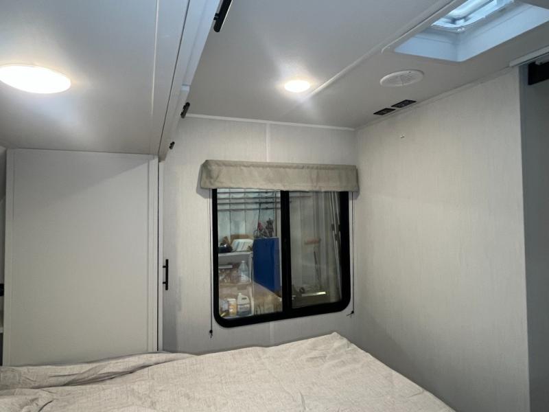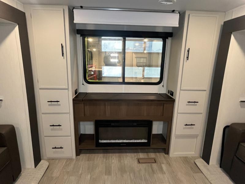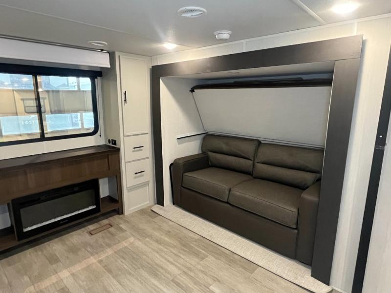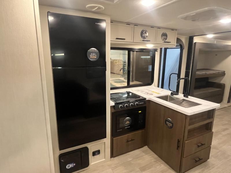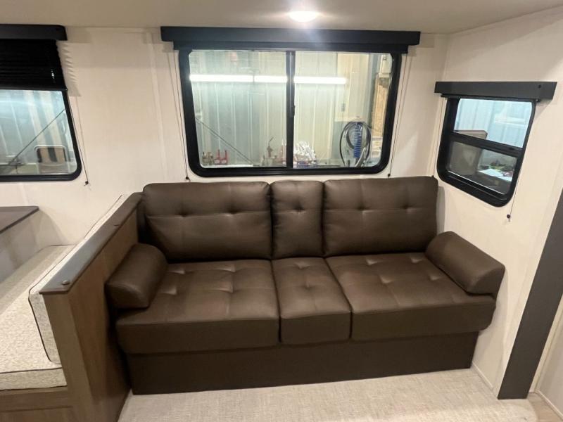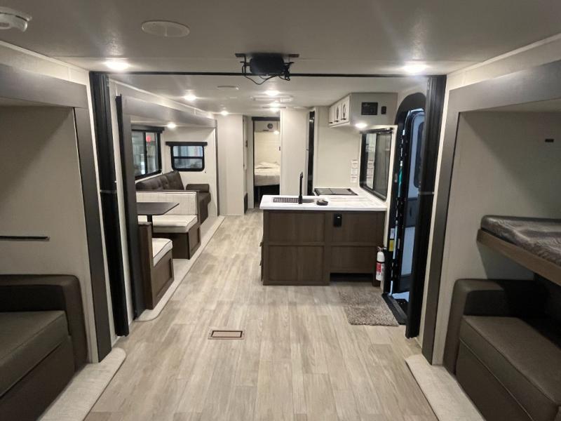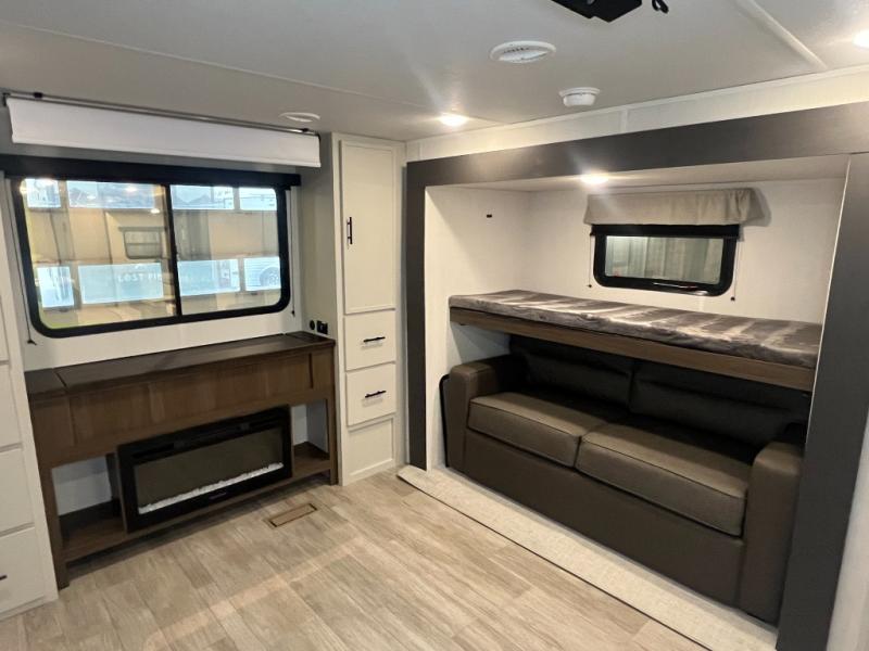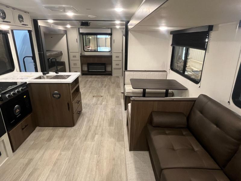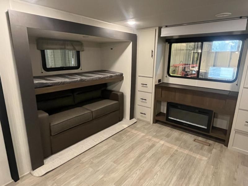 The whole gang will love camping in this spacious travel trailer that can sleep nine to ten people! The rear bunkhouse features dual opposing slides with hide-a-bed sofas and hinged bunk beds, plus a hidden desk, fireplace, and projector for movie nights! You'll appreciate your own space up front in the private bedroom, complete with a camp king bed and storage space. Everyone can meet in the combined kitchen and living area as the chef of your group makes breakfast in the fully equipped kitchen. There is a sofa and booth dinette here for seating space, or you can take your plate outdoors to sit under the power awning. And the outdoor refrigerator is sure to come in handy when you want another cold drink!