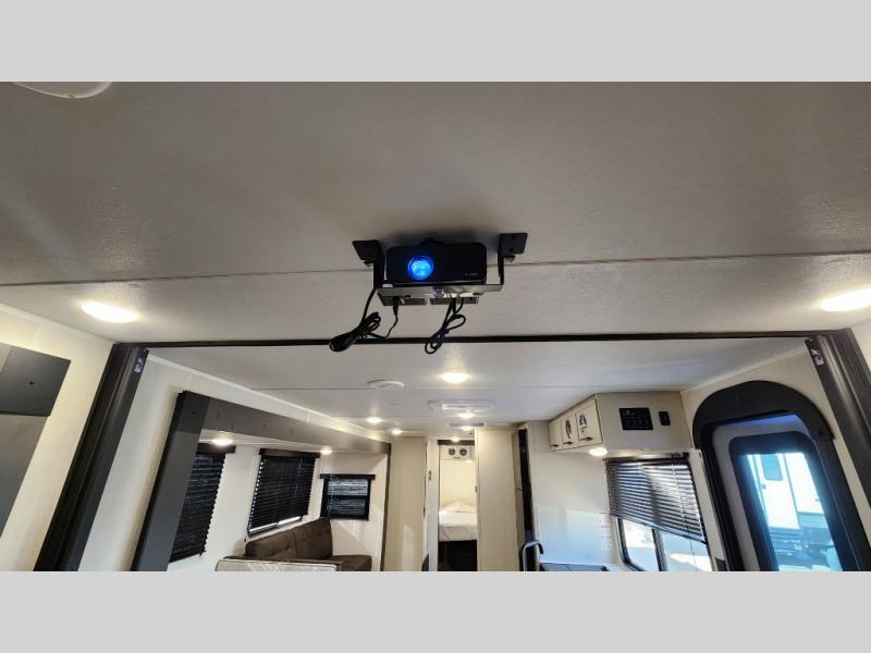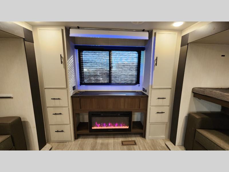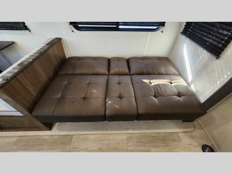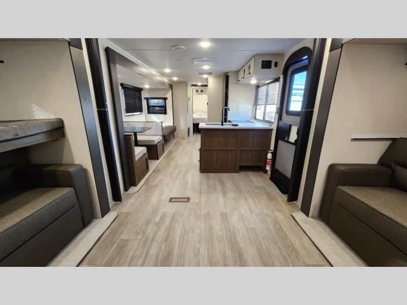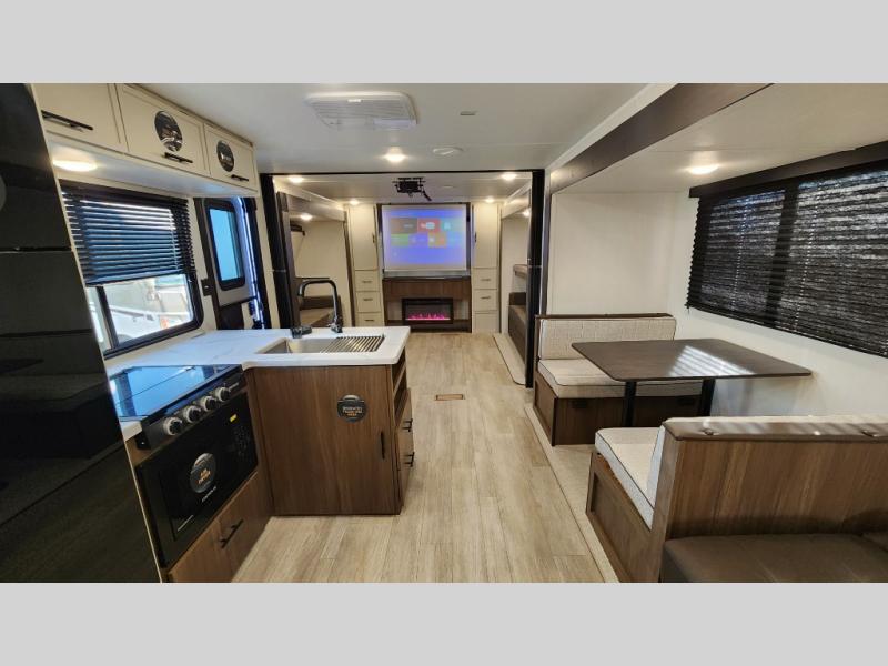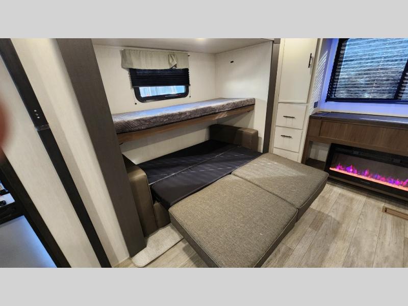 The whole gang will love camping in this spacious travel trailer that can sleep nine to ten people! The rear bunkhouse features dual opposing slides with hide-a-bed sofas and hinged bunk beds, plus a hidden desk, fireplace, and projector for movie nights! You'll appreciate your own space up front in the private bedroom, complete with a camp king bed and storage space. Everyone can meet in the combined kitchen and living area as the chef of your group makes breakfast in the fully equipped kitchen. There is a sofa and booth dinette here for seating space, or you can take your plate outdoors to sit under the power awning. And the outdoor refrigerator is sure to come in handy when you want another cold drink!
