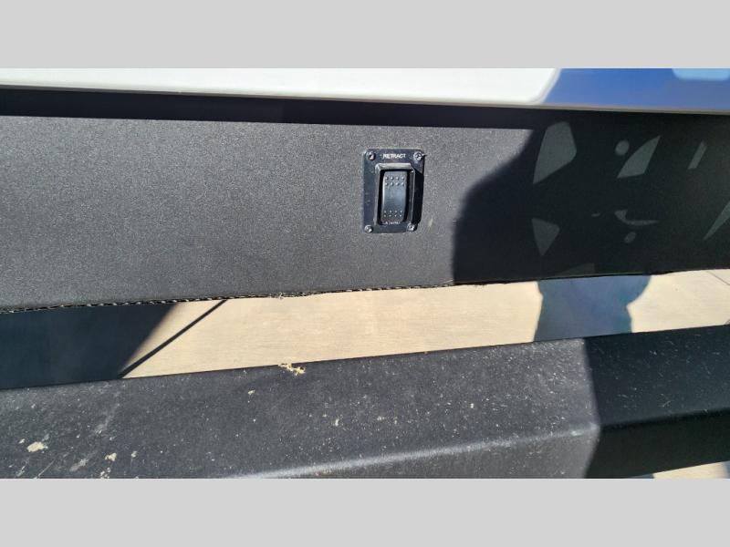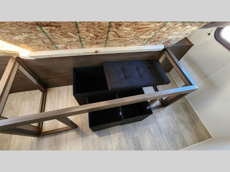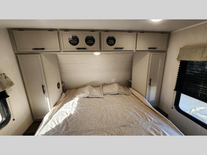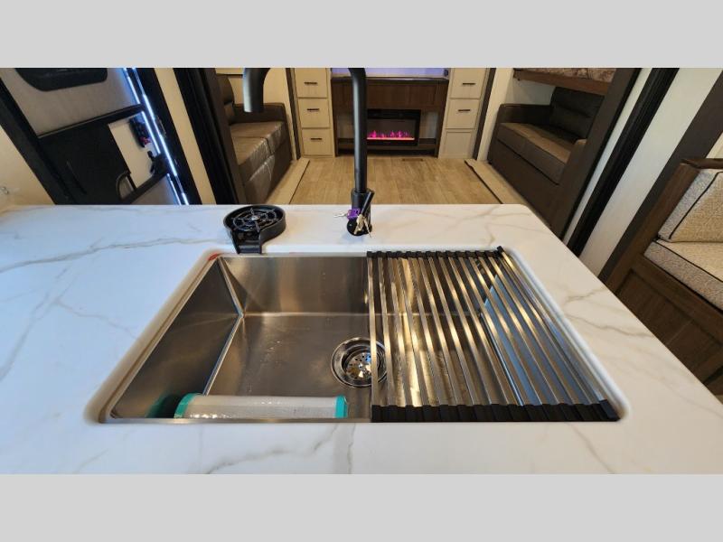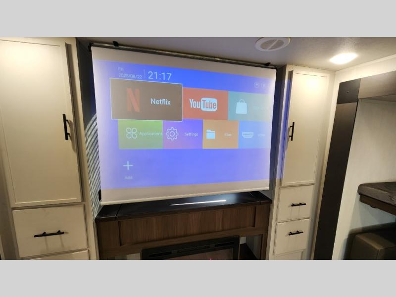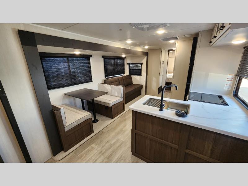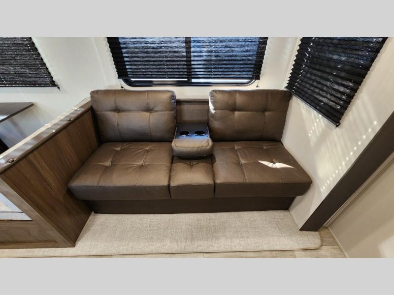 The whole gang will love camping in this spacious travel trailer that can sleep nine to ten people! The rear bunkhouse features dual opposing slides with hide-a-bed sofas and hinged bunk beds, plus a hidden desk, fireplace, and projector for movie nights! You'll appreciate your own space up front in the private bedroom, complete with a camp king bed and storage space. Everyone can meet in the combined kitchen and living area as the chef of your group makes breakfast in the fully equipped kitchen. There is a sofa and booth dinette here for seating space, or you can take your plate outdoors to sit under the power awning. And the outdoor refrigerator is sure to come in handy when you want another cold drink!