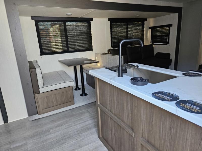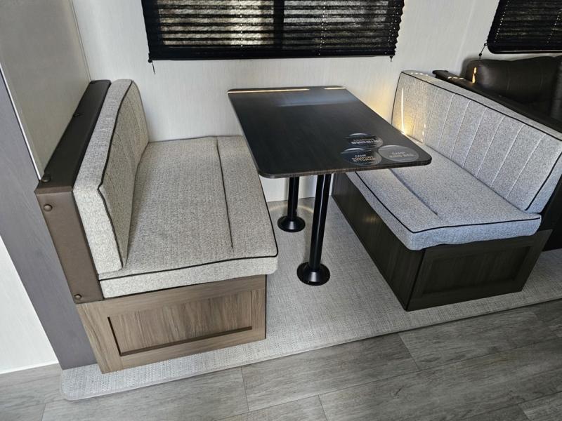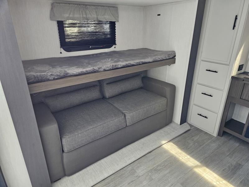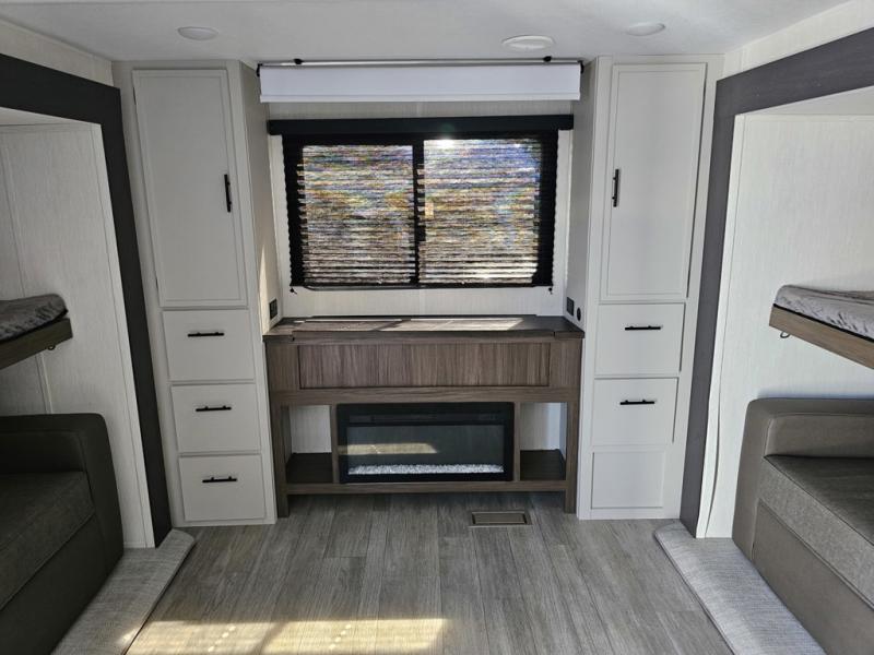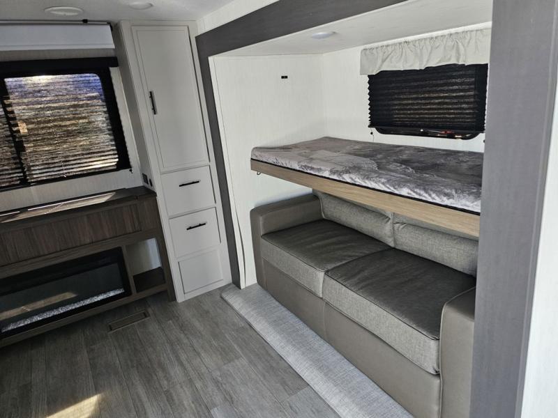 The whole gang will love camping in this spacious travel trailer that can sleep nine to ten people! The rear bunkhouse features dual opposing slides with hide-a-bed sofas and hinged bunk beds, plus a hidden desk, fireplace, and projector for movie nights! You'll appreciate your own space up front in the private bedroom, complete with a camp king bed and storage space. Everyone can meet in the combined kitchen and living area as the chef of your group makes breakfast in the fully equipped kitchen. There is a sofa and booth dinette here for seating space, or you can take your plate outdoors to sit under the power awning. And the outdoor refrigerator is sure to come in handy when you want another cold drink!