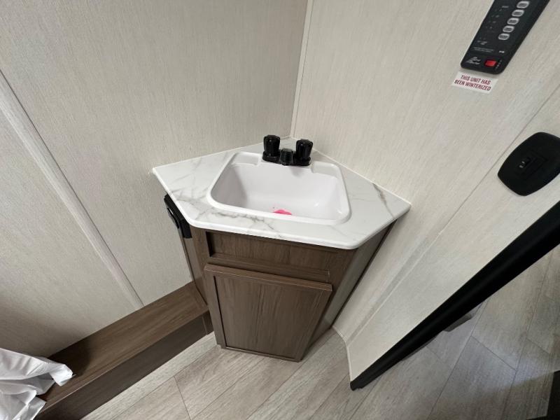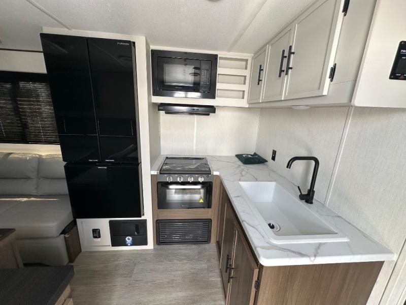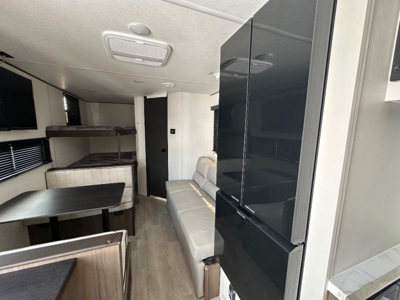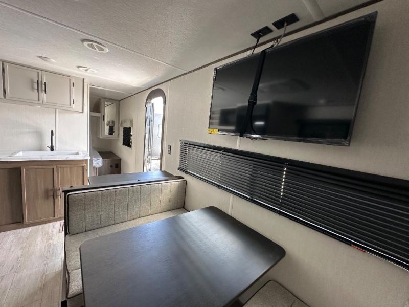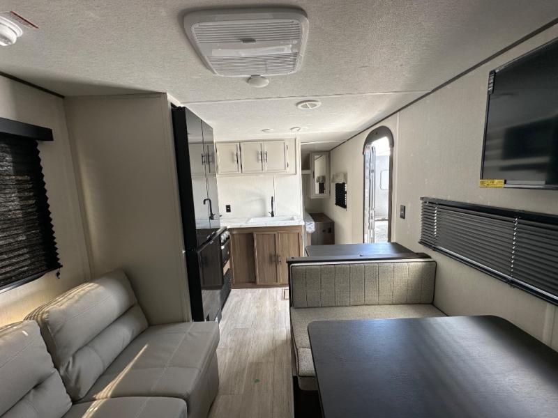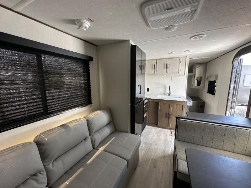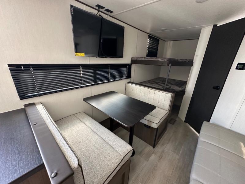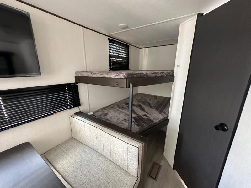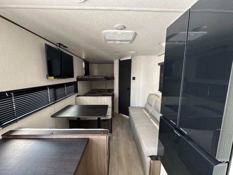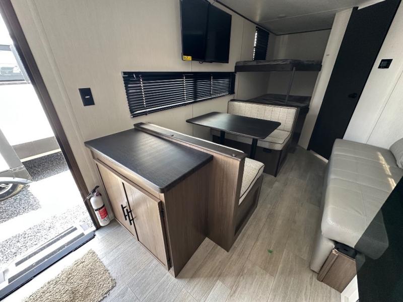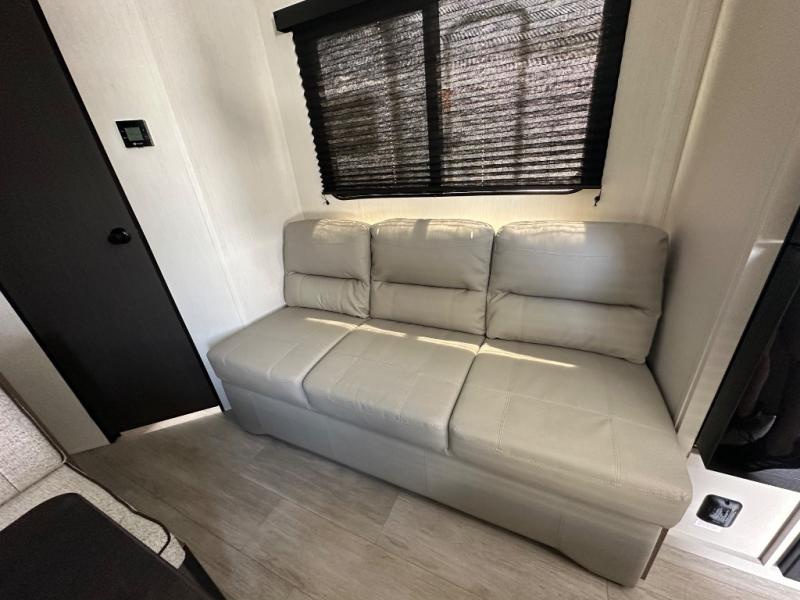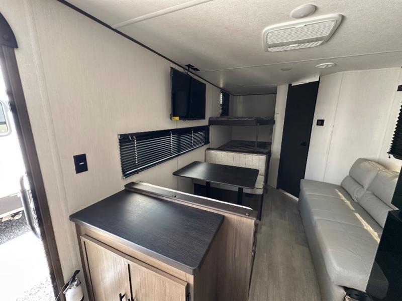 The whole family can go camping in this travel trailer! This trailer offers sleeping accommodations for up to eight because of the double-size bunk beds, the booth dinette, the sofa and the queen bed. There is a rear corner full bathroom with a medicine cabinet to store personal belongings. You will find full kitchen amenities inside, as well as an outdoor kitchen where you can watch the kids play while making dinner. The front private bedroom offers a place to retreat and relax after a fun day of playing at the beach!