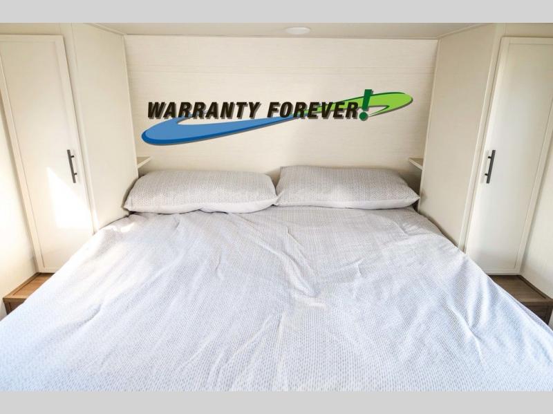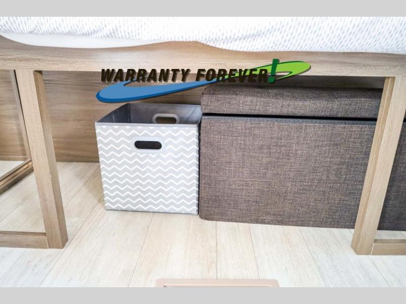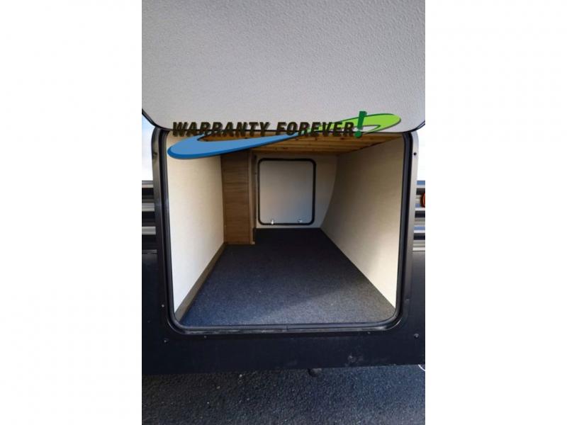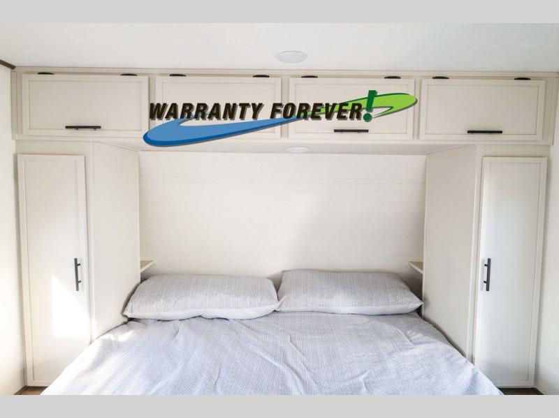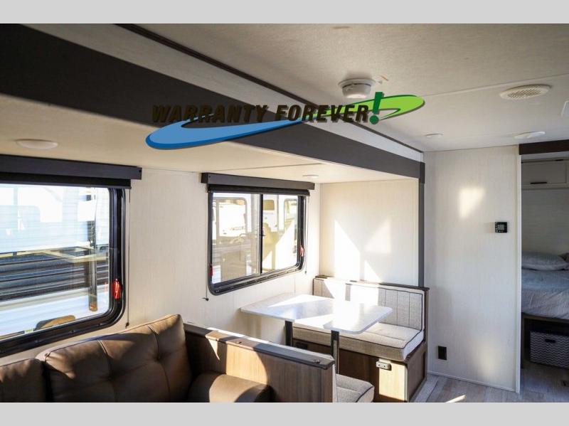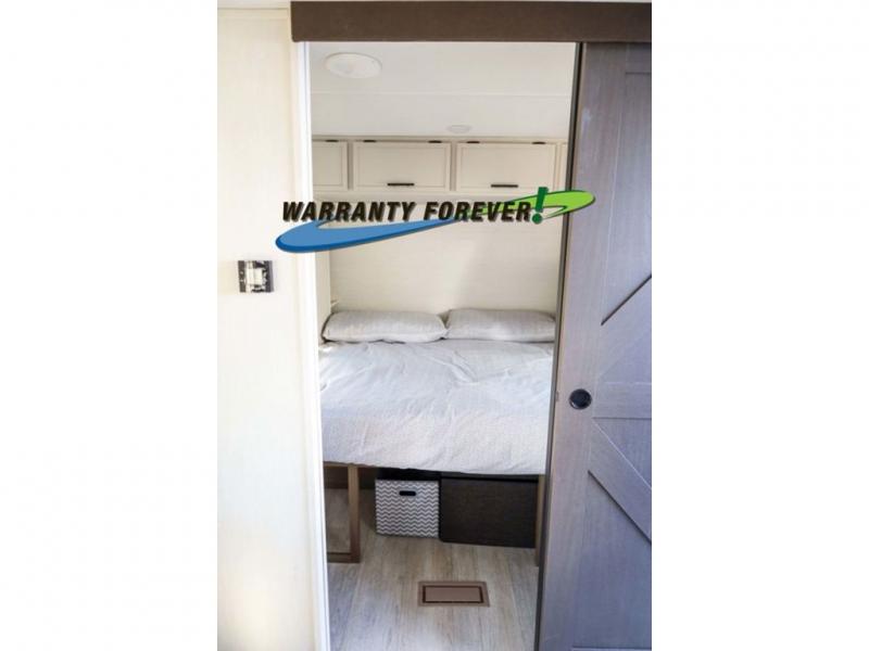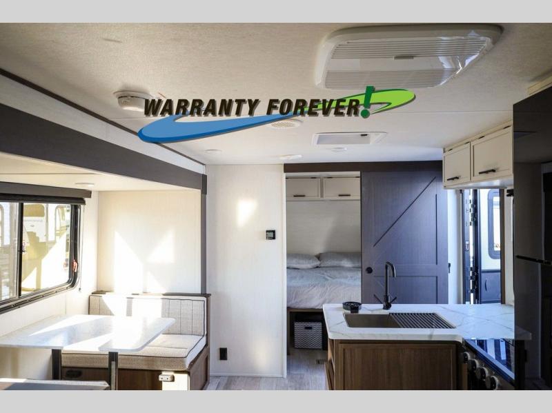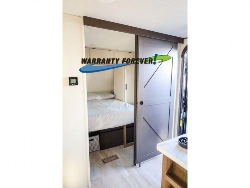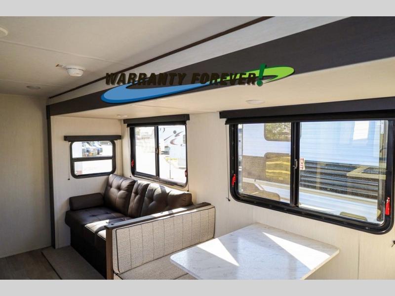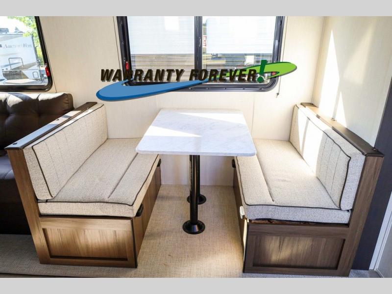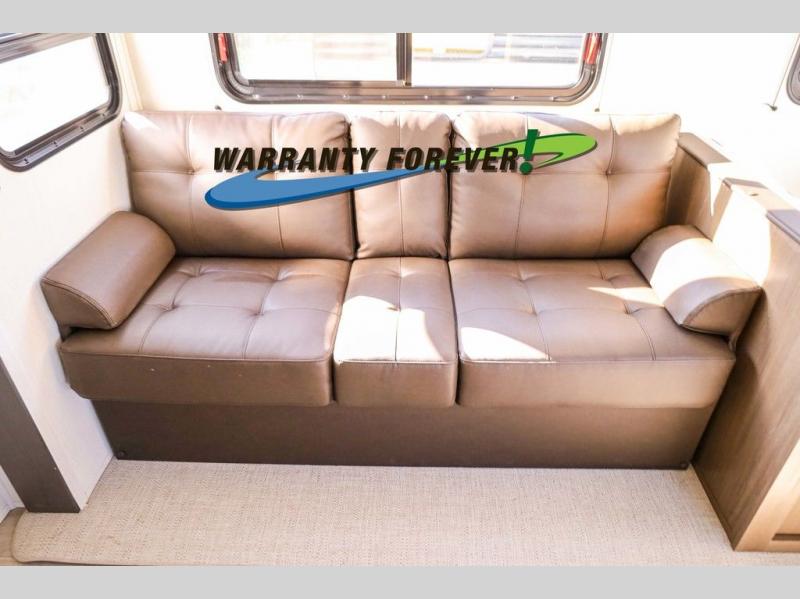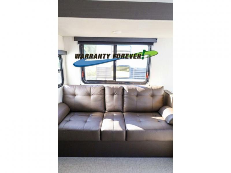 Looking for a trailer that houses everyone? This trailer offers lots of sleeping choices with a set of double-size bunks, a queen bed and furniture that doubles as sleeping space! You will also appreciate the added interior space thanks to the large slide in the living area that features a booth dinette and sofa. Up front, there is a private bedroom where you can retreat to at night away from the bunks in the back, and the bedroom features ample storage with dual wardrobes and an overhead shelf for your things.