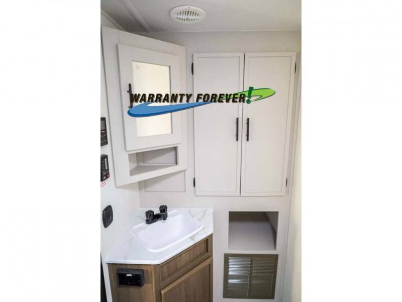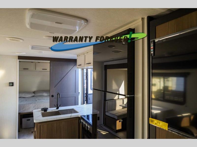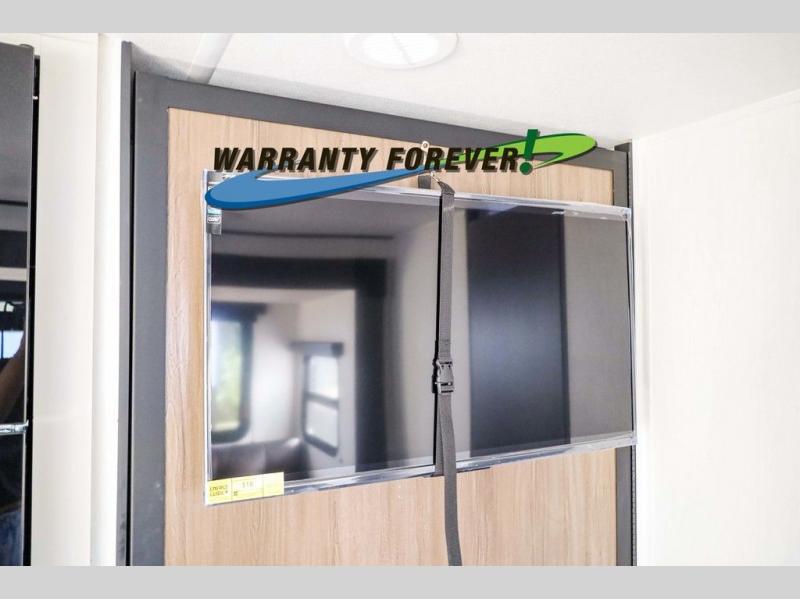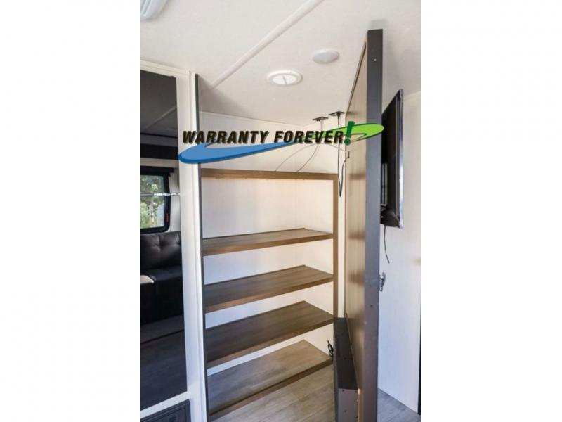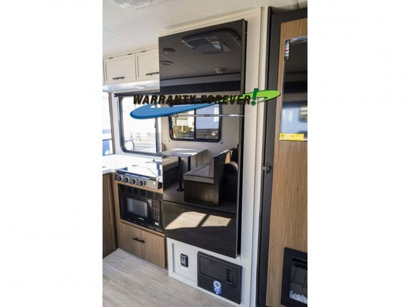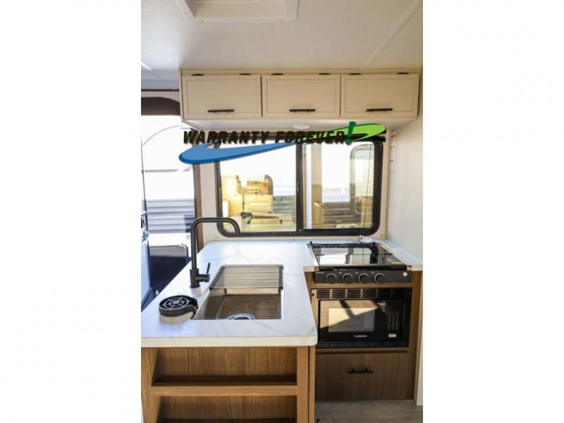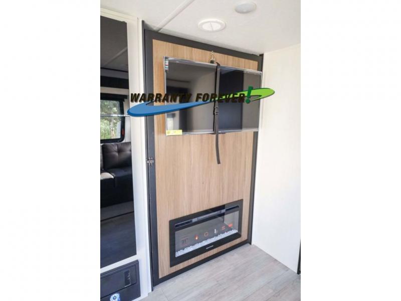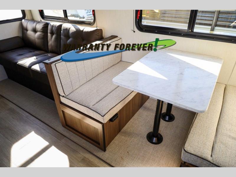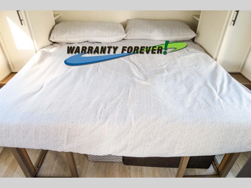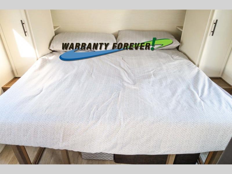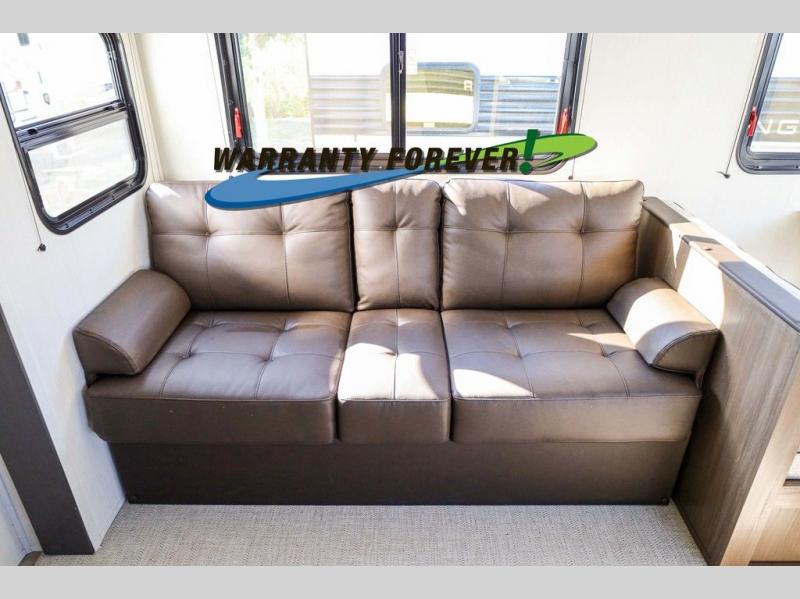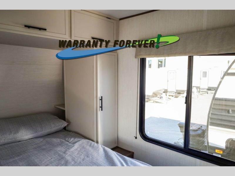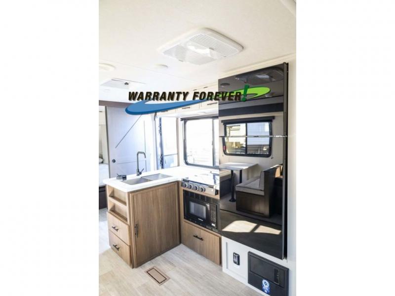 Looking for a trailer that houses everyone? This trailer offers lots of sleeping choices with a set of double-size bunks, a queen bed and furniture that doubles as sleeping space! You will also appreciate the added interior space thanks to the large slide in the living area that features a booth dinette and sofa. Up front, there is a private bedroom where you can retreat to at night away from the bunks in the back, and the bedroom features ample storage with dual wardrobes and an overhead shelf for your things.