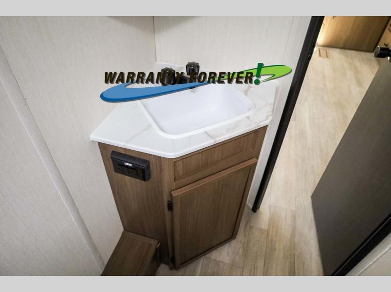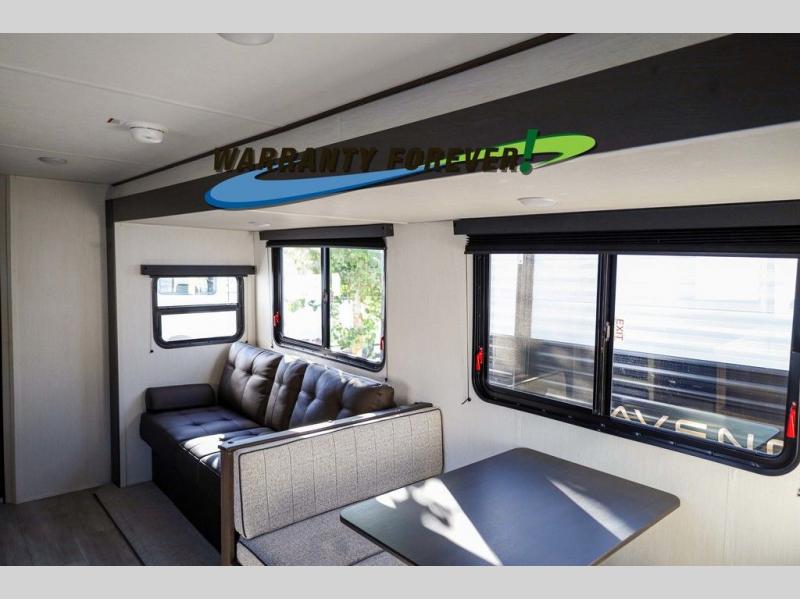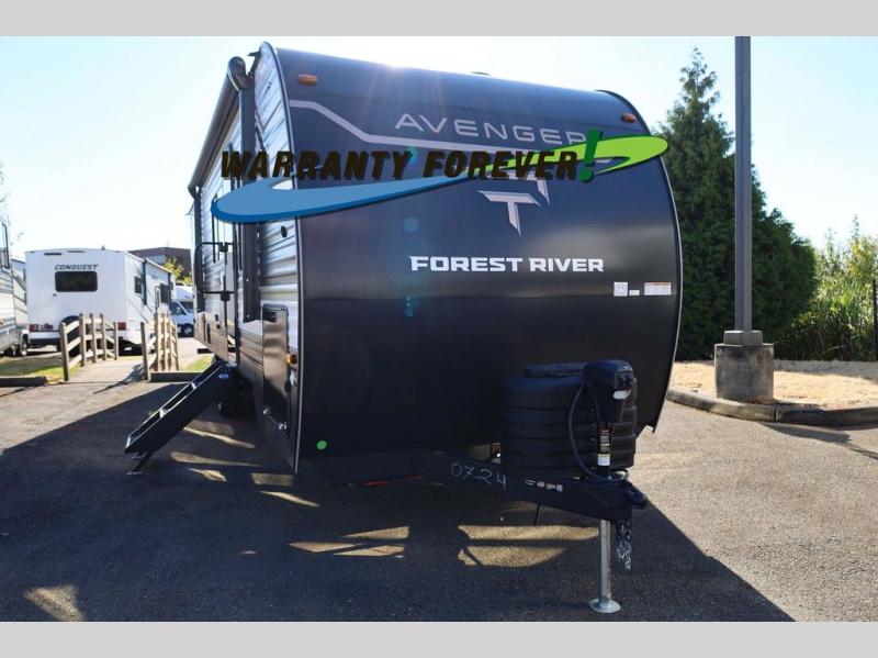 With any Avenger LE travel trailer by Prime Time RV you will enjoy at-home comforts while at the campground! Durable construction begins with an enclosed and heated underbelly, a one-piece roof membrane, and diamond plate front rock guard for added protection against debris during transport. There are also locking magnetic latches on the baggage doors, fully vented windows throughout, four stabilizer jacks, plus solar prep if you want the option to go off-grid. The interior will have you feeling right at home with residential extended ball bearing drawer glides, seamless Carefree Congoleum flooring, an XL single basin kitchen sink, and shower pans in all models that will make it easy to get in and out of the bath. Some of the convenient appliances and equipment you will appreciate are the 15,000 BTU A/C, 12V high-capacity water pump, Slim Profile range hood, and the Winegard 360+ antenna with Wi-Fi prep!