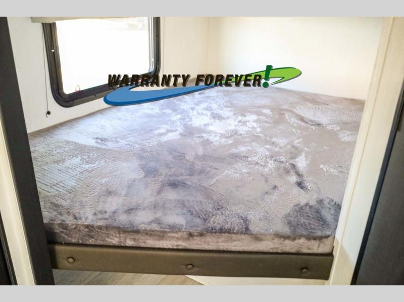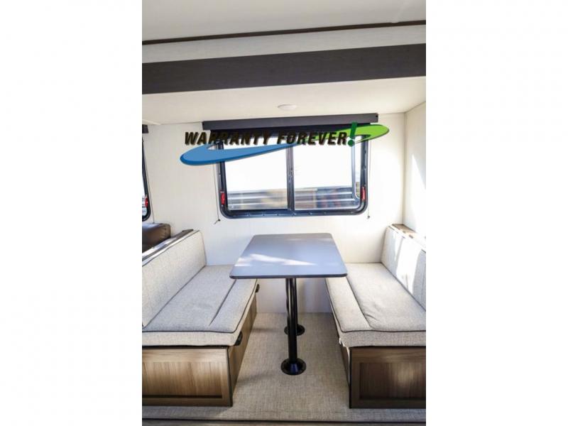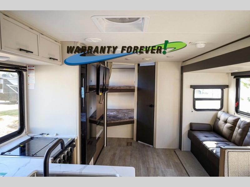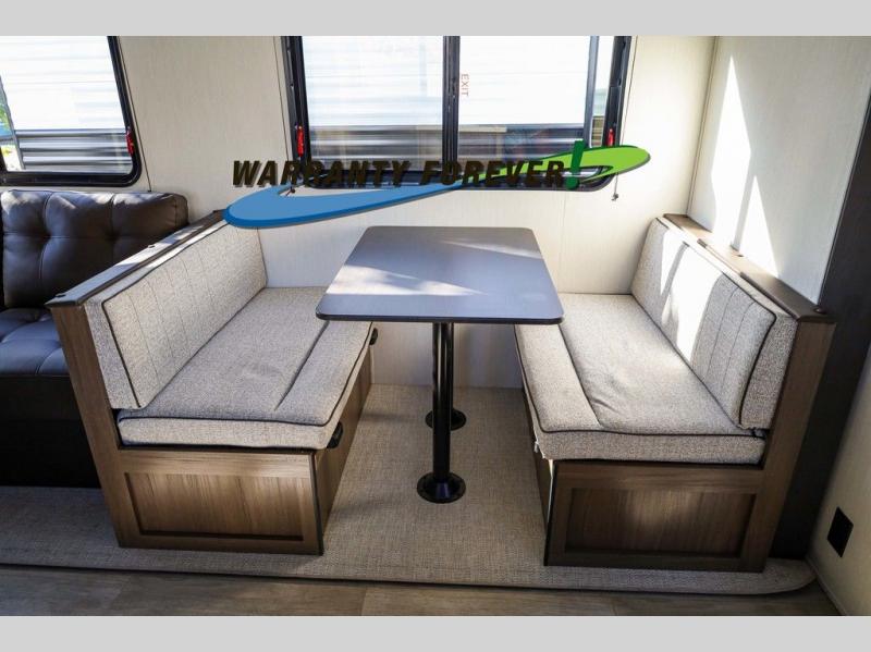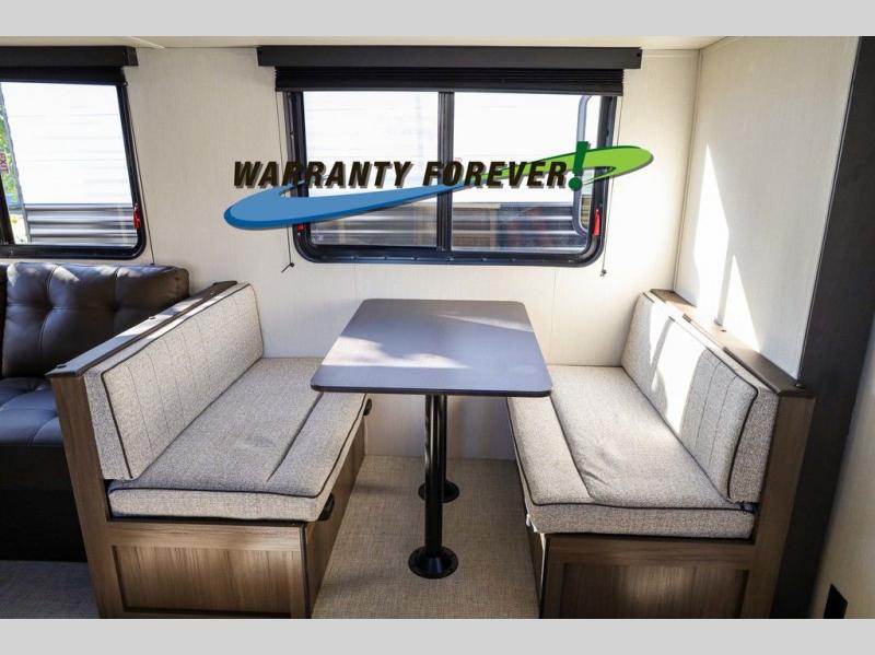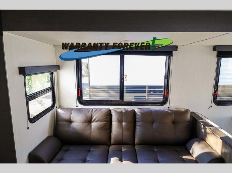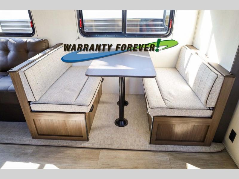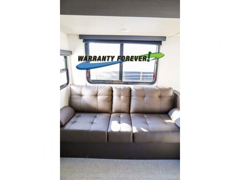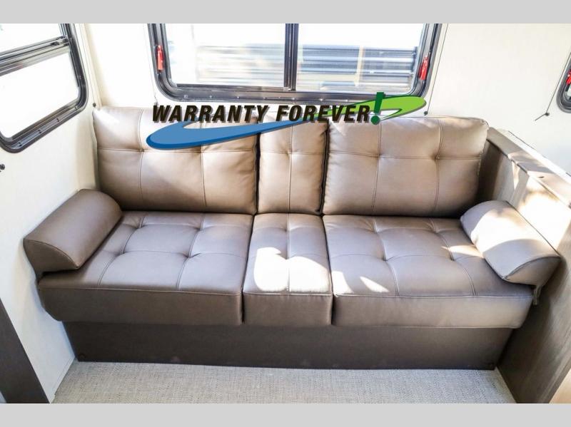Looking for a trailer that houses everyone? This trailer offers lots of sleeping choices with a set of double-size bunks, a queen bed and furniture that doubles as sleeping space! You will also appreciate the added interior space thanks to the large slide in the living area that features a booth dinette and sofa. Up front, there is a private bedroom where you can retreat to at night away from the bunks in the back, and the bedroom features ample storage with dual wardrobes and an overhead shelf for your things.