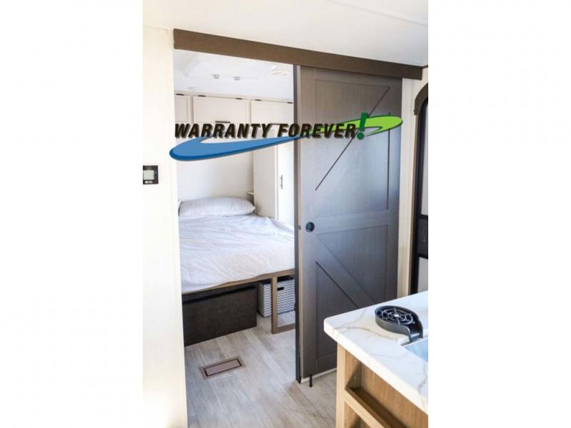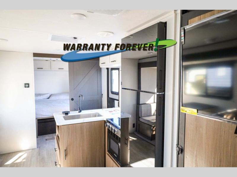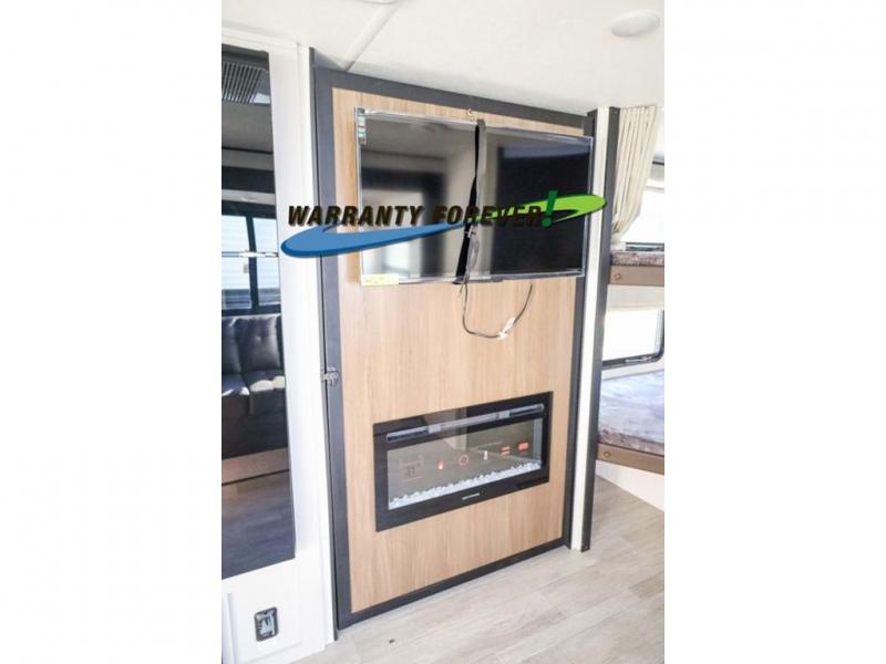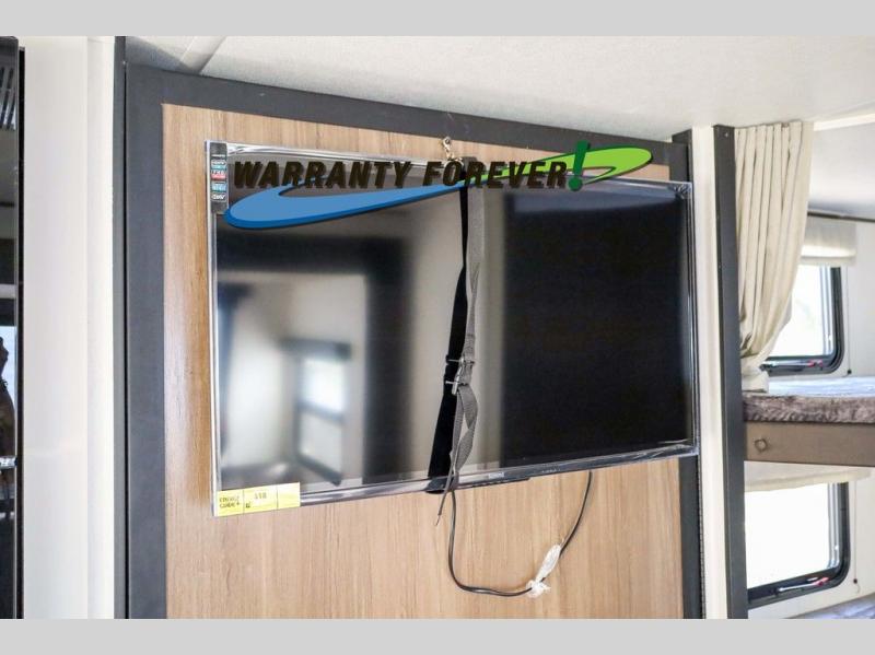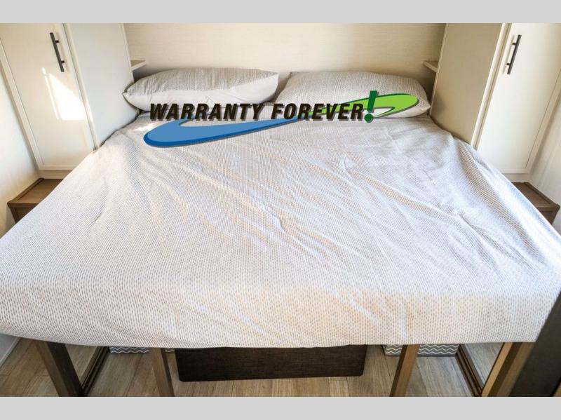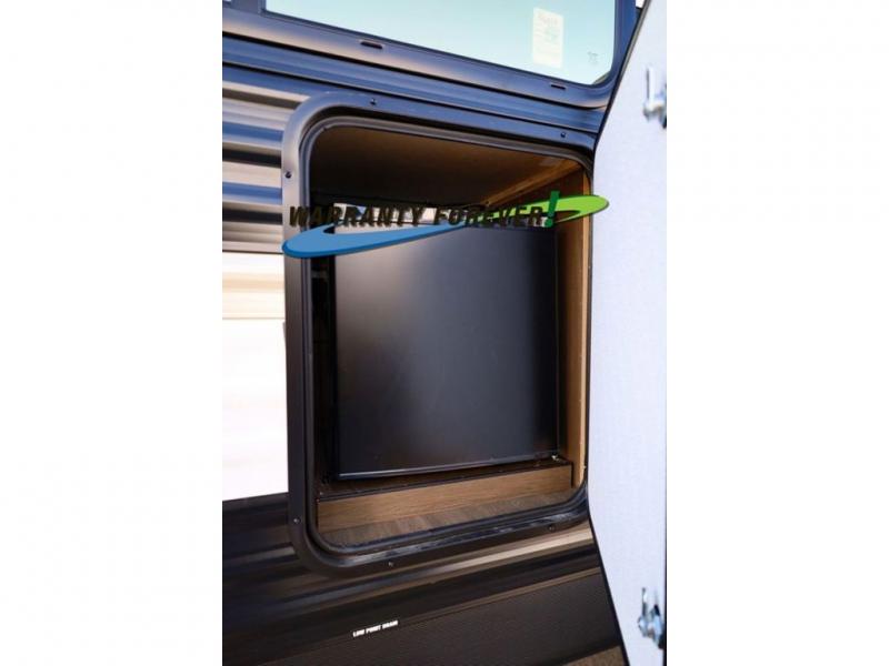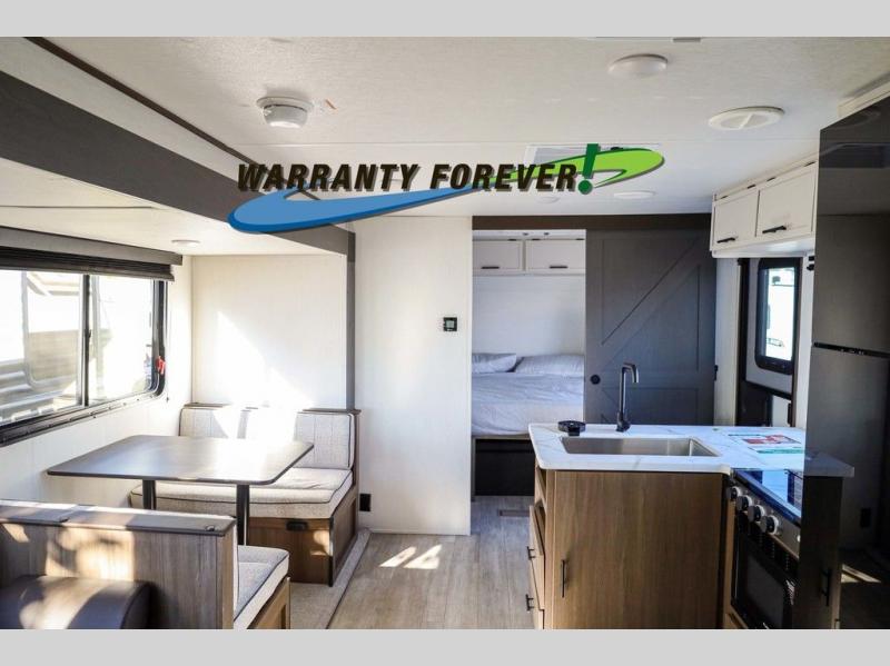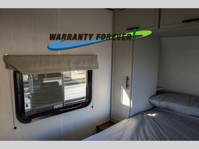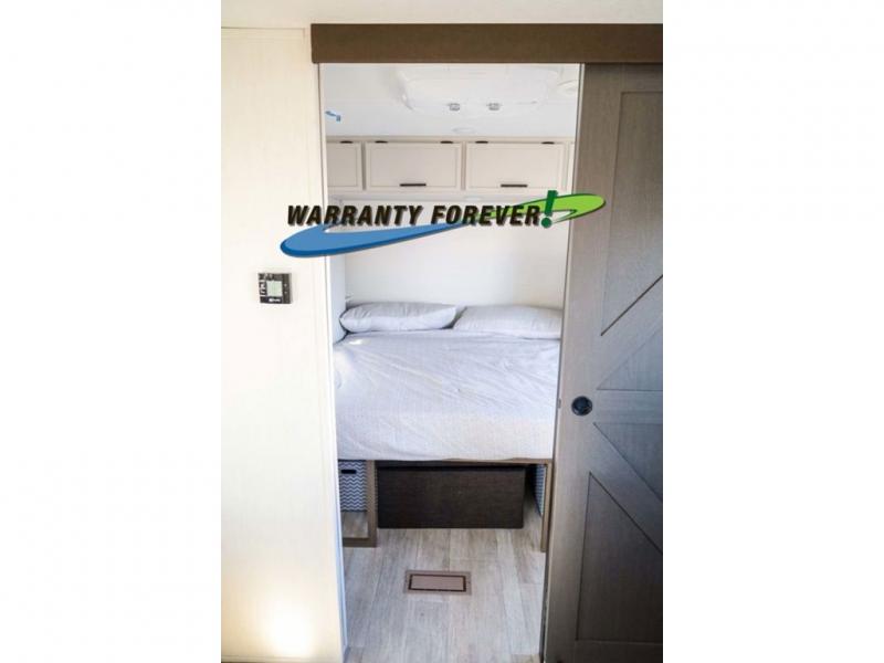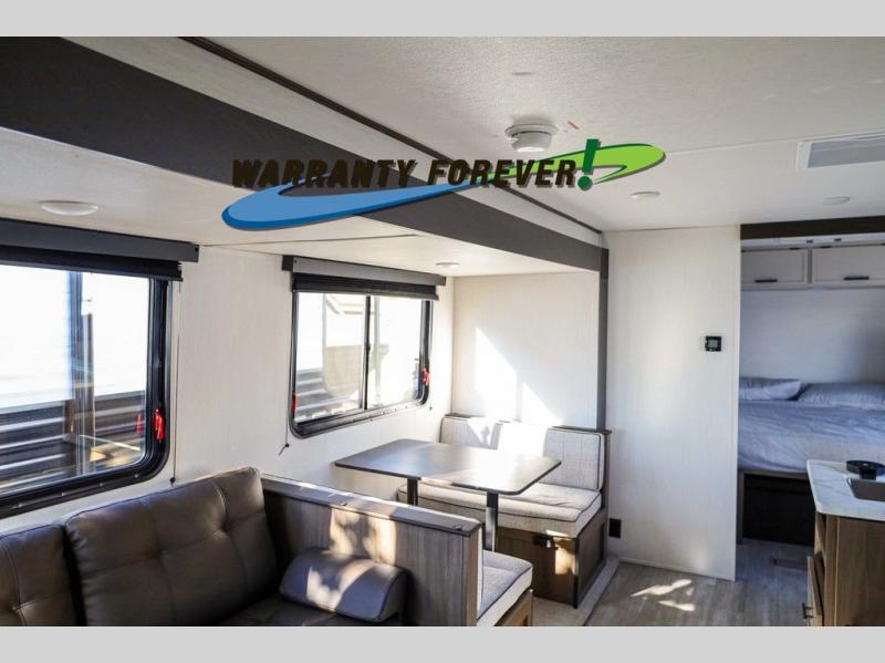Looking for a trailer that houses everyone? This trailer offers lots of sleeping choices with a set of double-size bunks, a queen bed and furniture that doubles as sleeping space! You will also appreciate the added interior space thanks to the large slide in the living area that features a booth dinette and sofa. Up front, there is a private bedroom where you can retreat to at night away from the bunks in the back, and the bedroom features ample storage with dual wardrobes and an overhead shelf for your things.