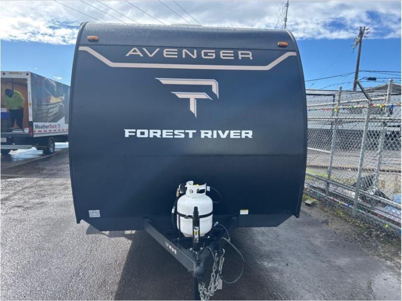 Each Avenger LT travel trailer by Prime Time features automotive grade exterior graphics, gold reflective windows, a smooth metal front, and a fully walkable 7'6"-wide roof, plus rear electric stabilizer jacks, a bumper with spare tire, exterior storage, a power awning, exterior 110V outlets, and a battery disconnect to make campsite setup easier. Inside, you’ll find seamless pressed countertops, blackout shades, a storage dinette, cozy camp queen beds with teddy bear bunk mats, and a bedside table with 110V outlets and USB ports, while the roof-mount 10K thermostat-controlled A/C, direct dump furnace, and tankless on-demand water heater help keep you comfortable in changing weather.