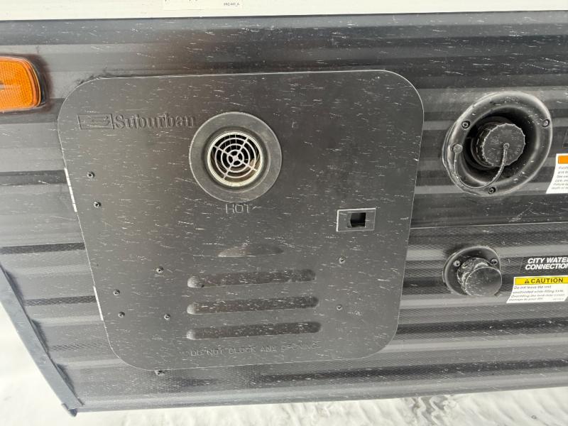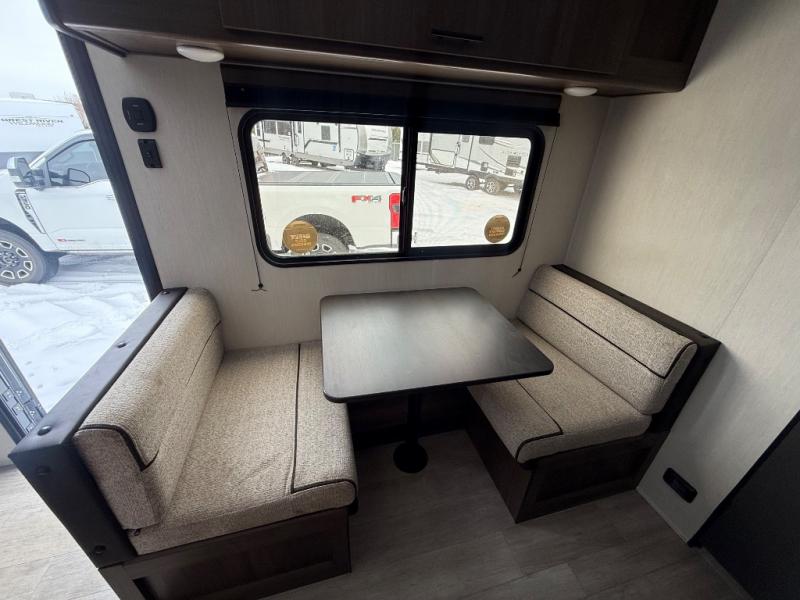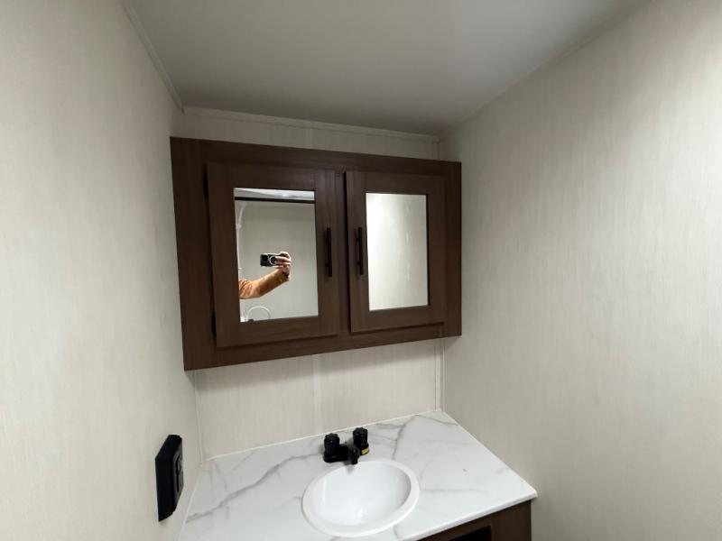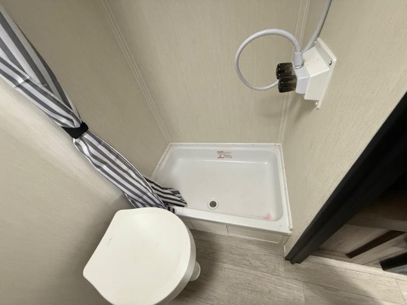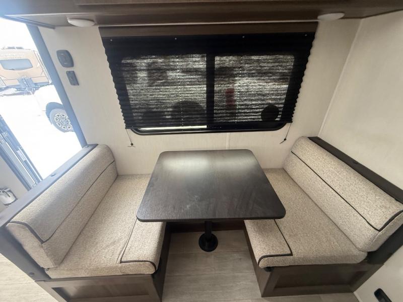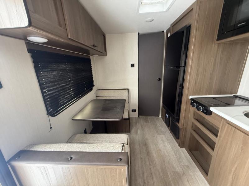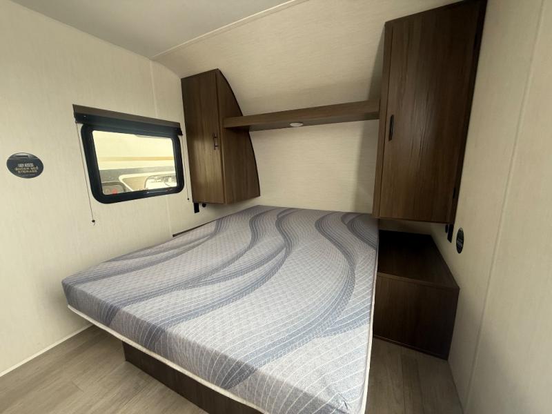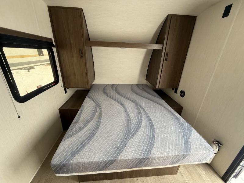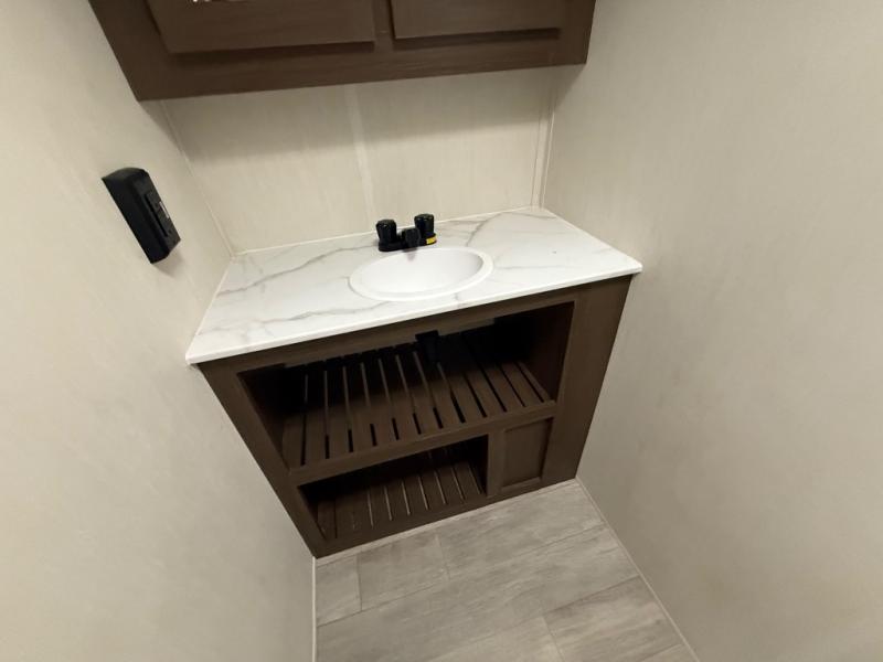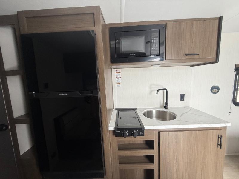You'll love spending time outdoors with the power awning. When you get tired from your day of hiking, relax on the front camp queen bed with plenty of storage such as overhead cabinets to place your clothing and such. And you'll appreciate the farmhouse sink to clean after you cook with the two-burner cooktop.