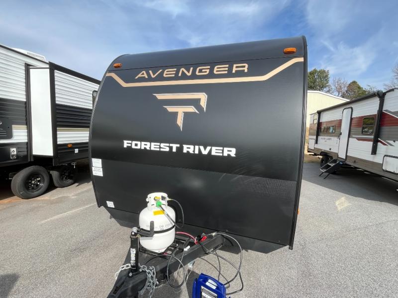 Each Avenger LT travel trailer by Prime Time features automotive grade exterior graphics, gold reflective windows, a smooth metal front, and a fully walkable 7'6"-wide roof, plus rear electric stabilizer jacks, a bumper with spare tire, exterior storage, a power awning, exterior 110V outlets, and a battery disconnect to make campsite setup easier. Inside, you’ll find seamless pressed countertops, blackout shades, a storage dinette, cozy camp queen beds with teddy bear bunk mats, and a bedside table with 110V outlets and USB ports, while the roof-mount 10K thermostat-controlled A/C, direct dump furnace, and tankless on-demand water heater help keep you comfortable in changing weather.