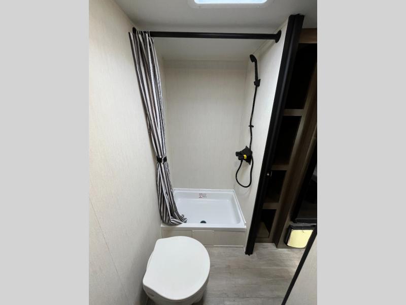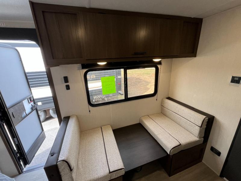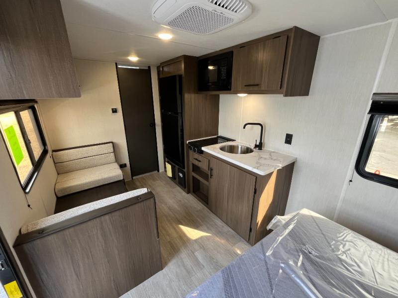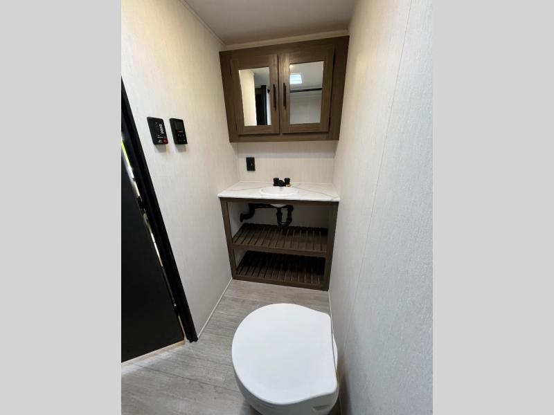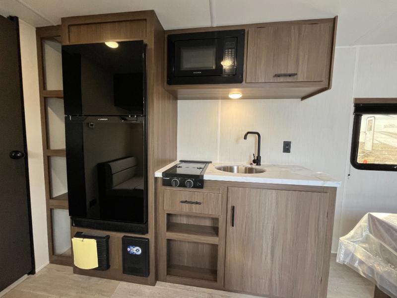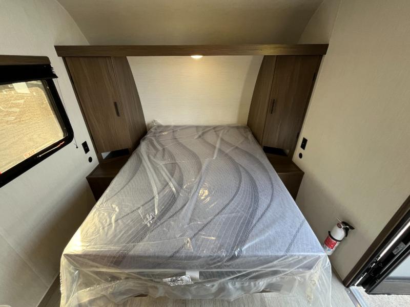 You'll love spending time outdoors with the power awning. When you get tired from your day of hiking, relax on the front camp queen bed with plenty of storage such as overhead cabinets to place your clothing and such. And you'll appreciate the farmhouse sink to clean after you cook with the two-burner cooktop.