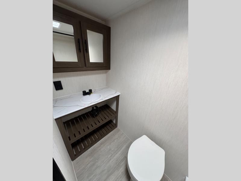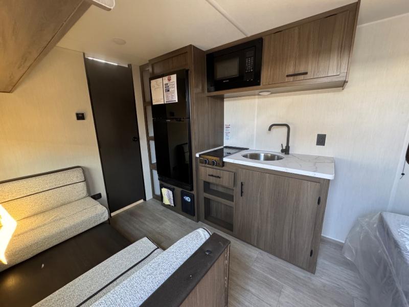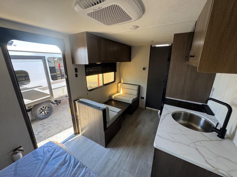 You'll love spending time outdoors with the power awning. When you get tired from your day of hiking, relax on the front camp queen bed with plenty of storage such as overhead cabinets to place your clothing and such. And you'll appreciate the farmhouse sink to clean after you cook with the two-burner cooktop.