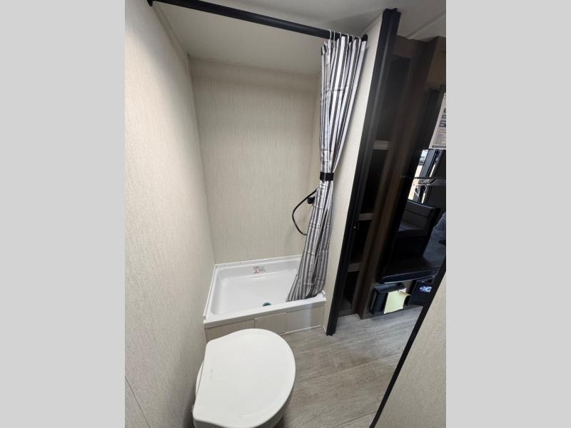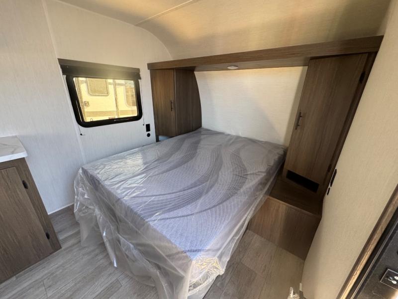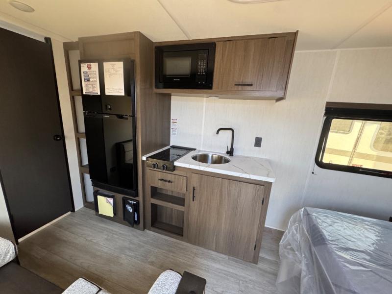 You'll love spending time outdoors with the power awning. When you get tired from your day of hiking, relax on the front camp queen bed with plenty of storage such as overhead cabinets to place your clothing and such. And you'll appreciate the farmhouse sink to clean after you cook with the two-burner cooktop.