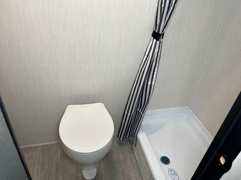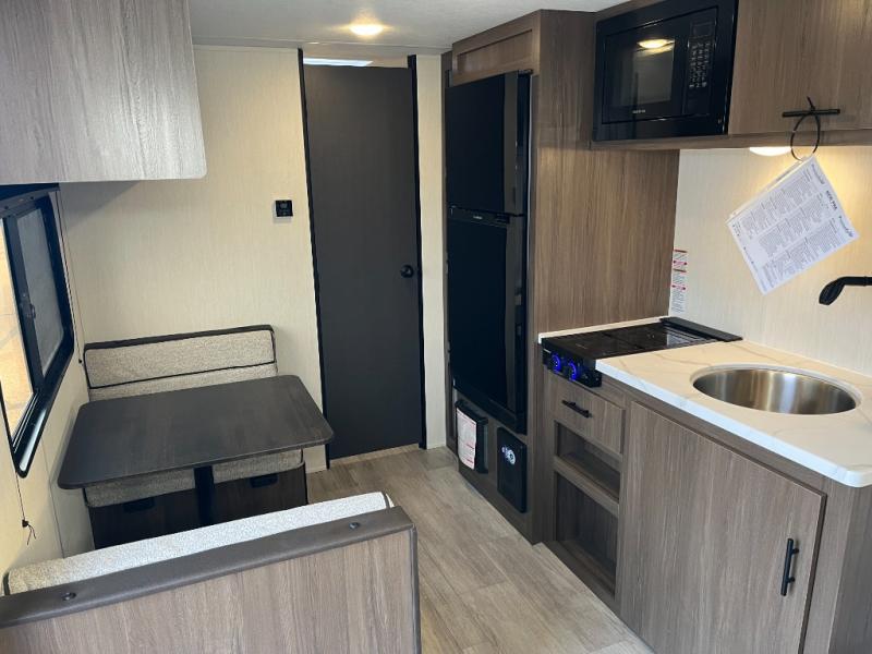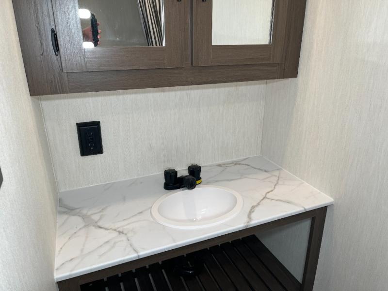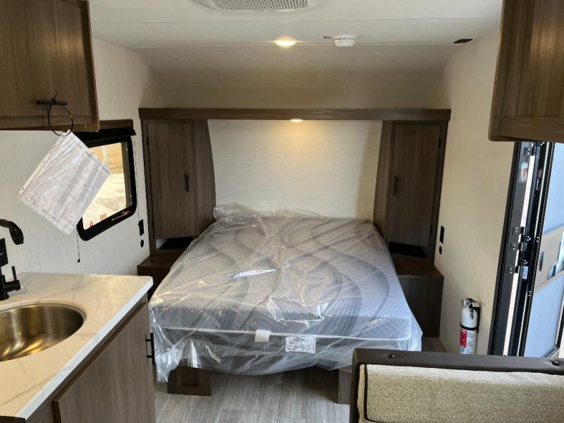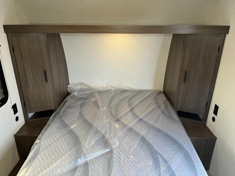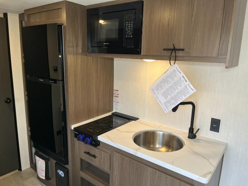 You'll love spending time outdoors with the power awning. When you get tired from your day of hiking, relax on the front camp queen bed with plenty of storage such as overhead cabinets to place your clothing and such. And you'll appreciate the farmhouse sink to clean after you cook with the two-burner cooktop.
