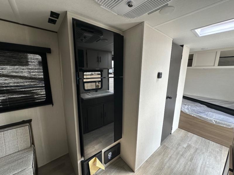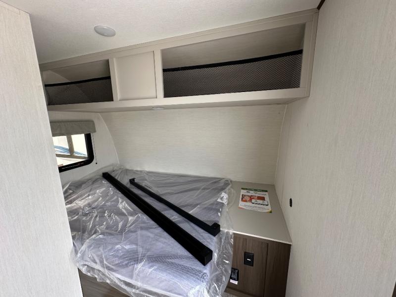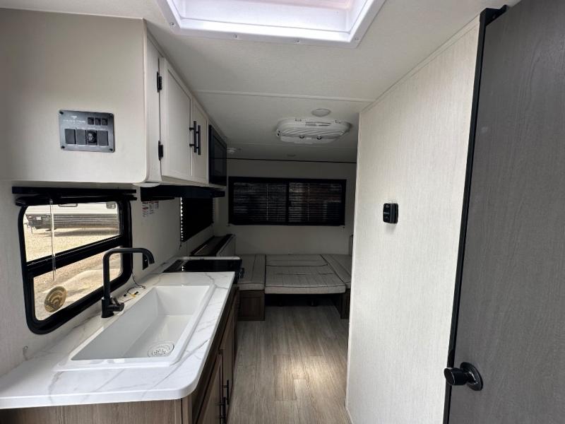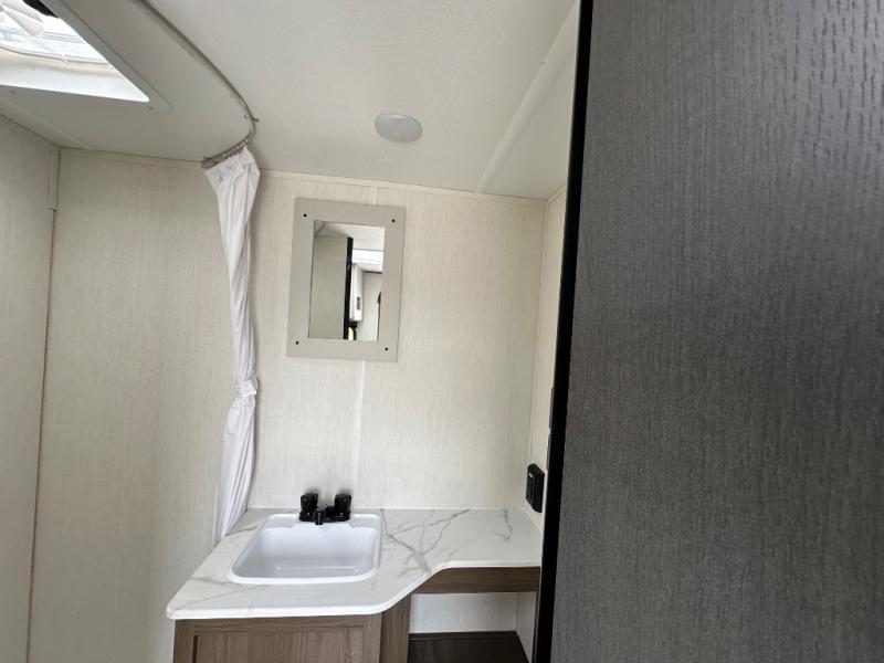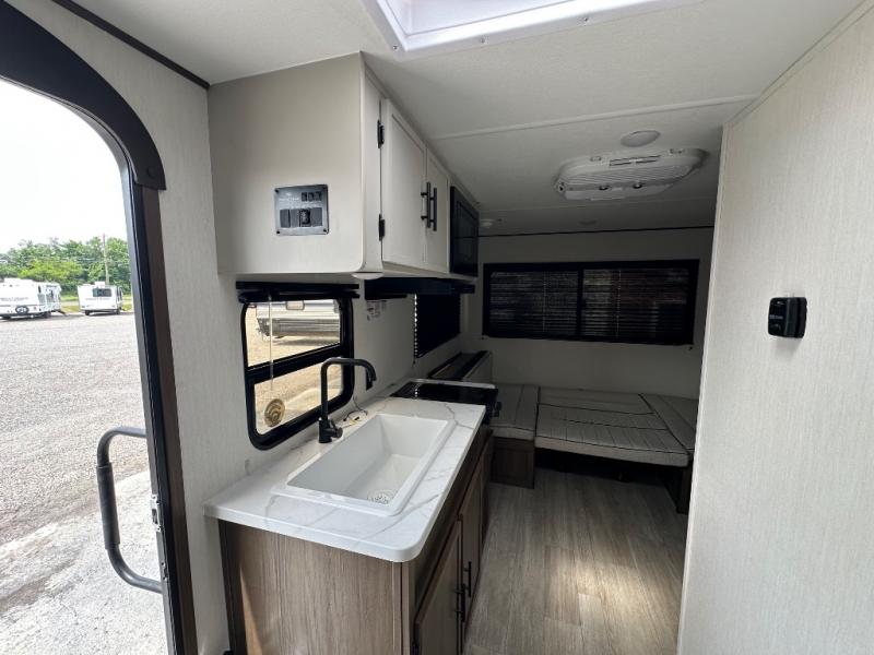 Camping with your friends or family doesn't have to be hard! This easy-to-tow, store and clean up RV allows two to four people to sleep comfortably on the U-shaped dinette along the rear wall with a large window and the front bed with nightstand. The kitchen includes a 10.7 cu. ft. 12V refrigerator, a microwave, plus a two-burner cooktop for preparing meals just like you do at home.