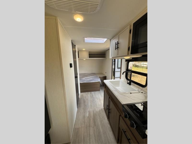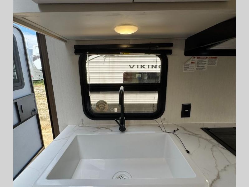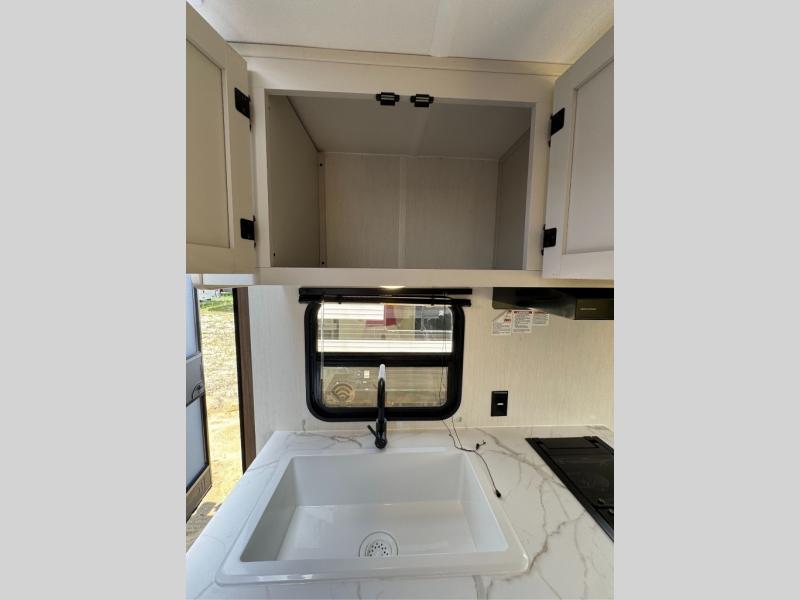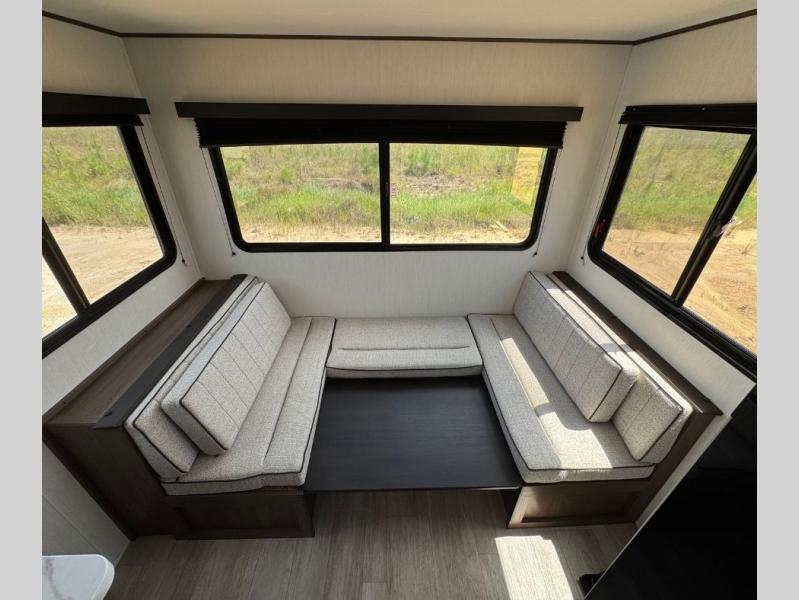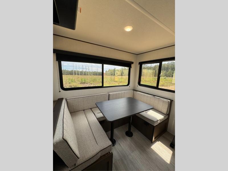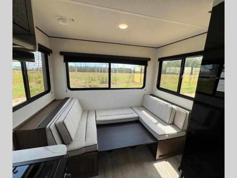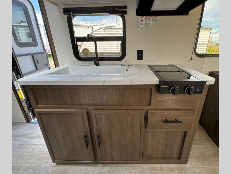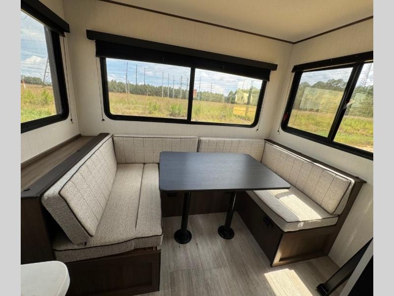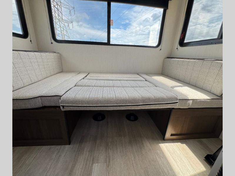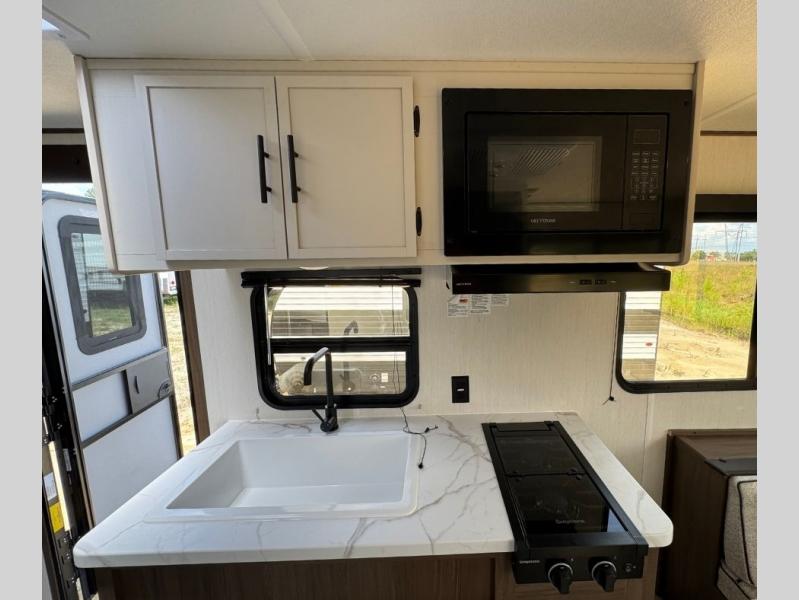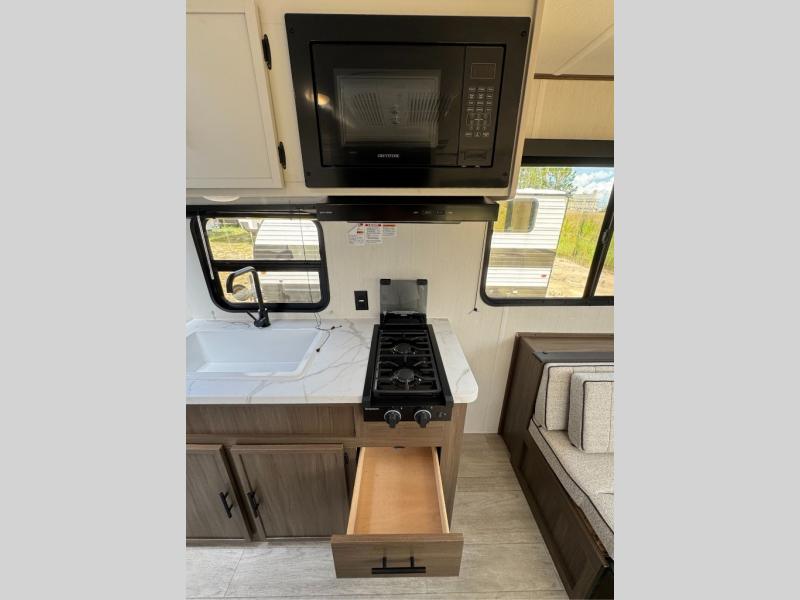 Camping with your friends or family doesn't have to be hard! This easy-to-tow, store and clean up RV allows two to four people to sleep comfortably on the U-shaped dinette along the rear wall with a large window and the front bed with nightstand. The kitchen includes a 10.7 cu. ft. 12V refrigerator, a microwave, plus a two-burner cooktop for preparing meals just like you do at home.