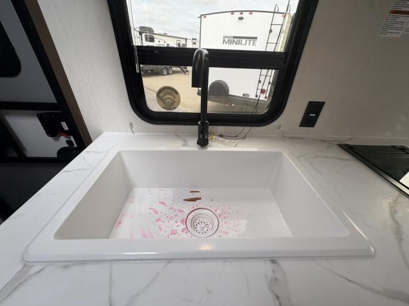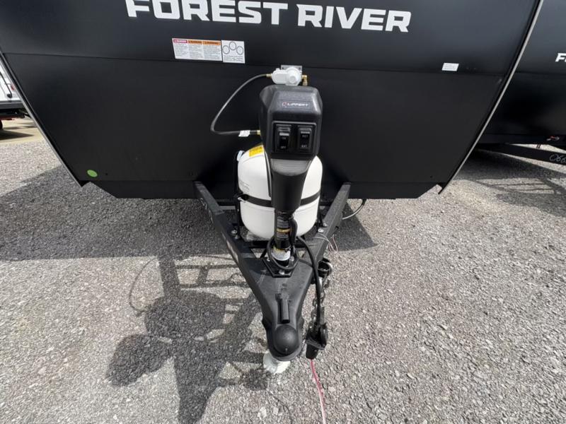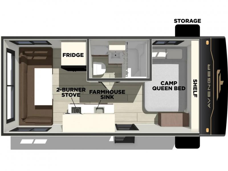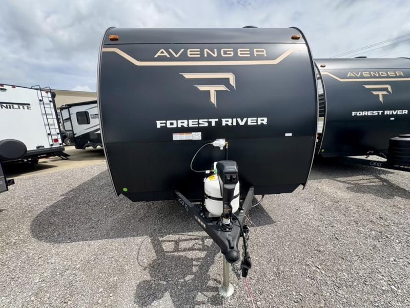 With any Avenger LT travel trailer by Prime Time, the exterior includes an aerodynamic smooth front metal, a front diamond plate for protection on the road, and two stabilizer jacks. There is also exclusive Everlast construction, a PVC roof membrane, and solar prep for the option to go off-grid. The interior offers seamless Carefree Congoleum flooring for easy cleanup and durability, pleated night shades throughout for privacy, a bottle opener, and residential extended ball bearing drawer guides.