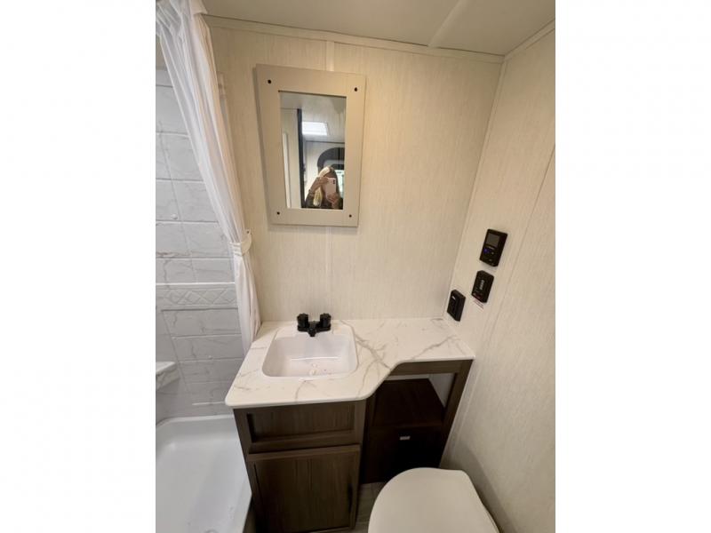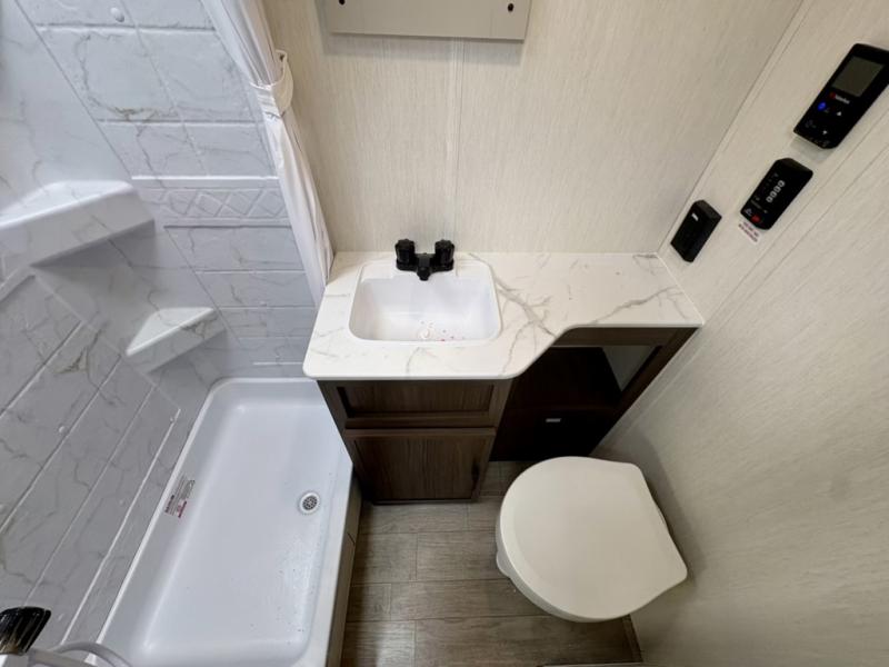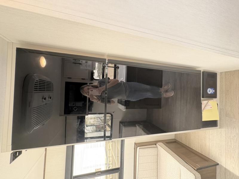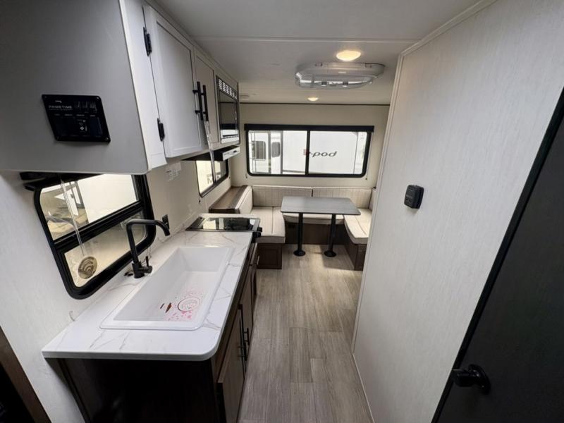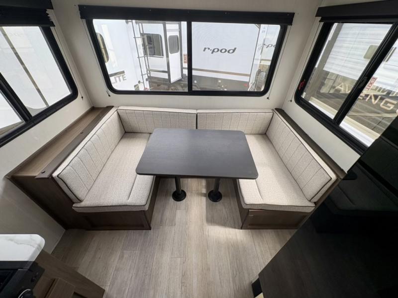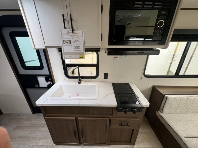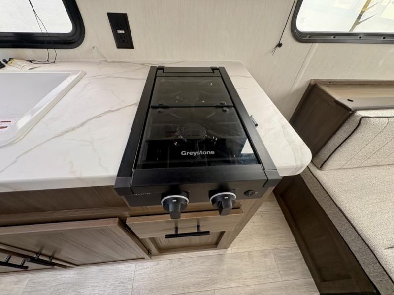 Camping with your friends or family doesn't have to be hard! This easy-to-tow, store and clean up RV allows two to four people to sleep comfortably on the U-shaped dinette along the rear wall with a large window and the front bed with nightstand. The kitchen includes a 10.7 cu. ft. 12V refrigerator, a microwave, plus a two-burner cooktop for preparing meals just like you do at home.