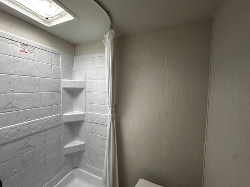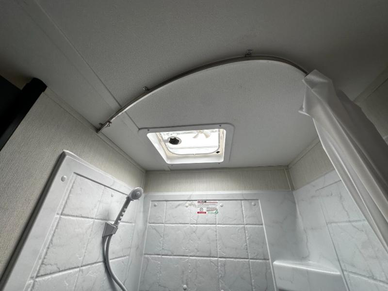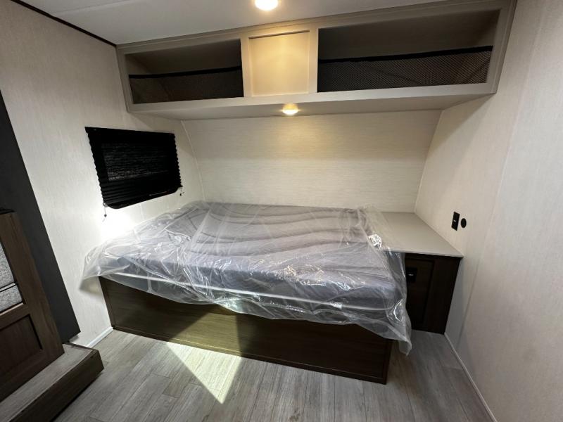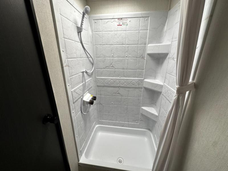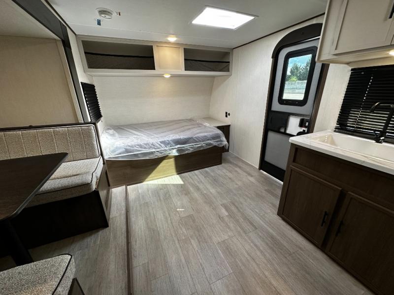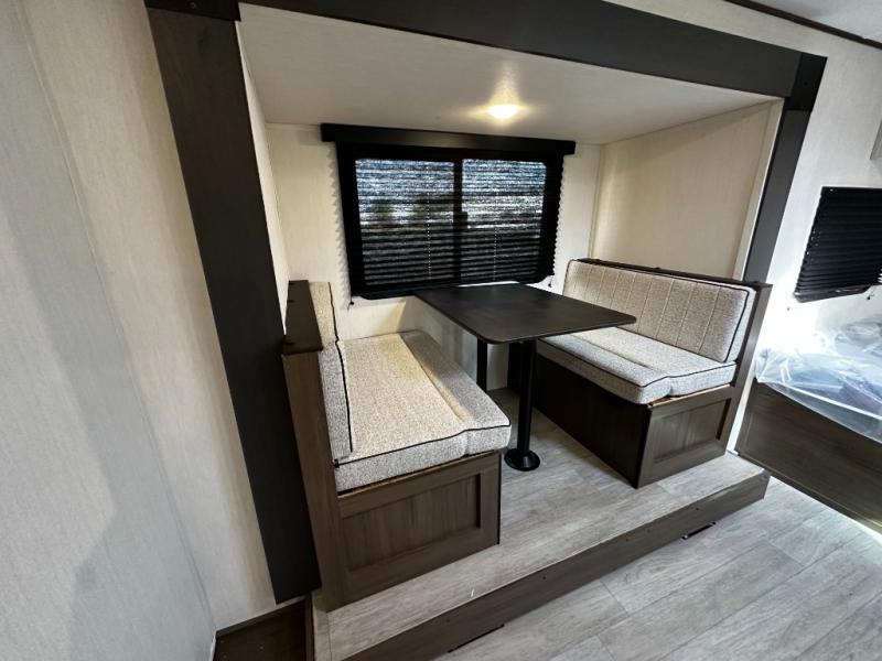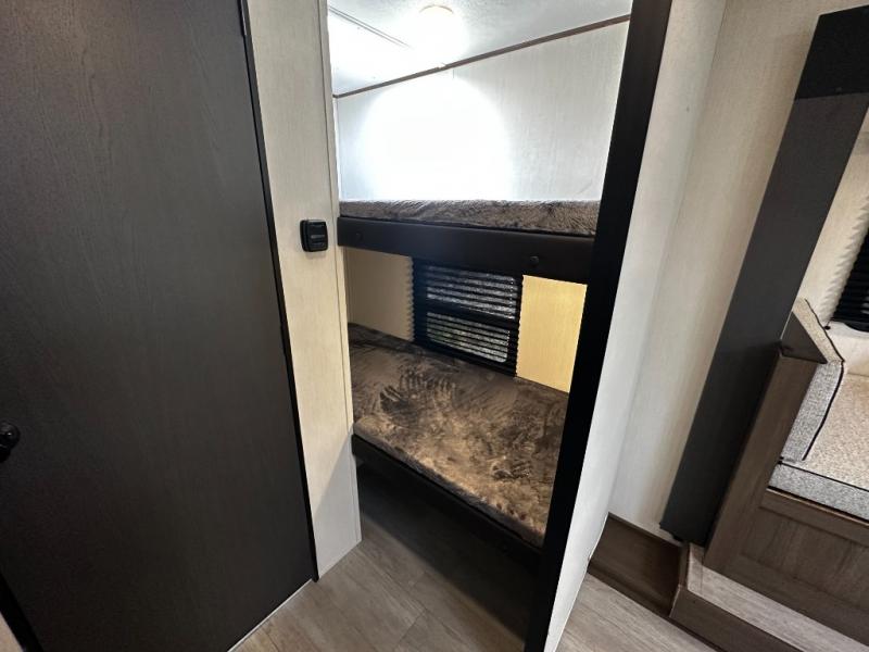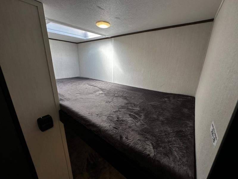 Inside, the Avenger 17BHS maximizes every inch of space with a well-thought-out layout. The rear bunk beds provide cozy sleeping accommodations for kids or guests while keeping the living area open and functional. The front bedroom features a comfortable queen bed with convenient storage, creating a private retreat after a day of outdoor adventures. The dinette offers space for meals, relaxation, or converts into additional sleeping space when needed. The fully equipped kitchen includes modern appliances, ample countertop space, and plenty of cabinetry for easy meal prep. A full bathroom with shower and practical storage ensures comfort and convenience for everyone.