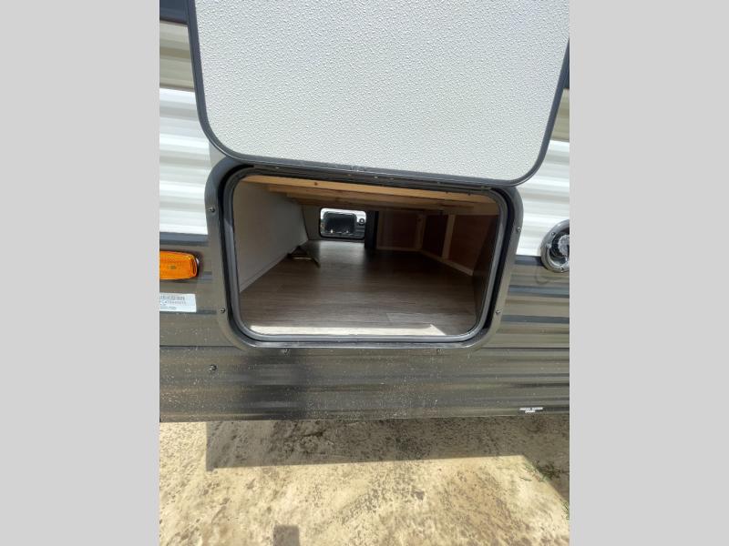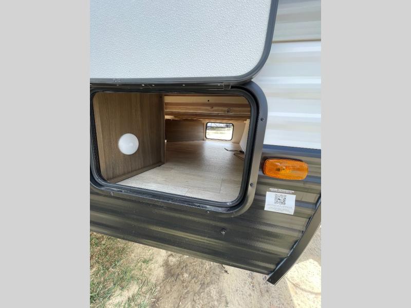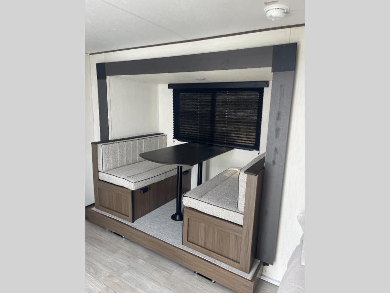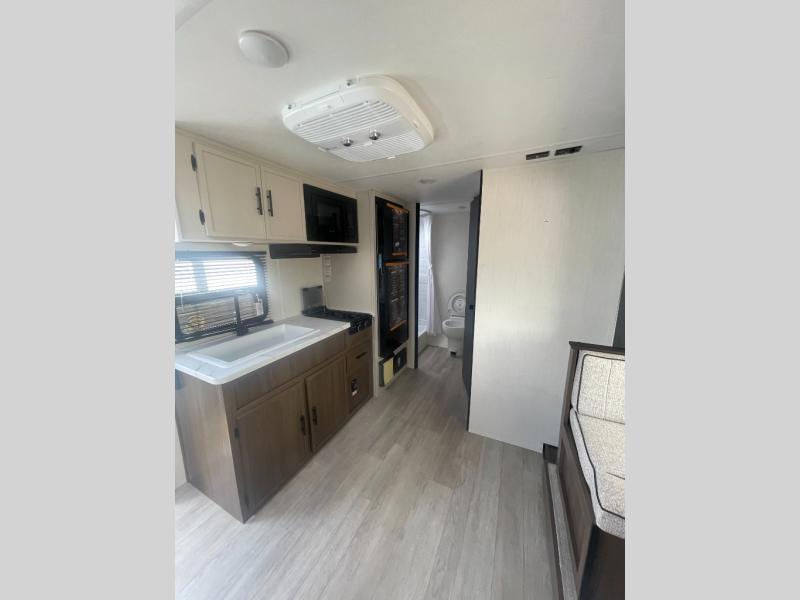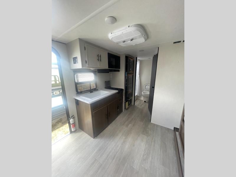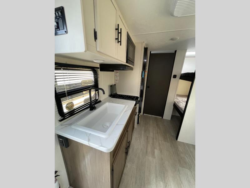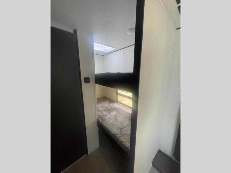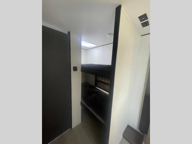 Go hiking, biking or exploring for new places when you have this trailer at the campgrounds! You will find sleeping for five between the rear corner bunk beds, and the front bed with a nightstand for your cellphones and such. And one more can sleep on the dinette slide. You'll be delighted with the kitchen skylight that gives natural lighting as you cook a meal. The LED-lit power awning provides a protected outdoor living area as you visit or make s'mores around the campfire.