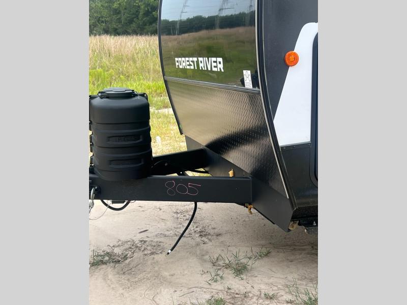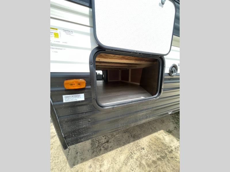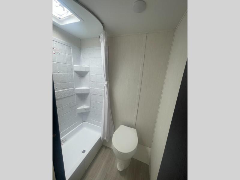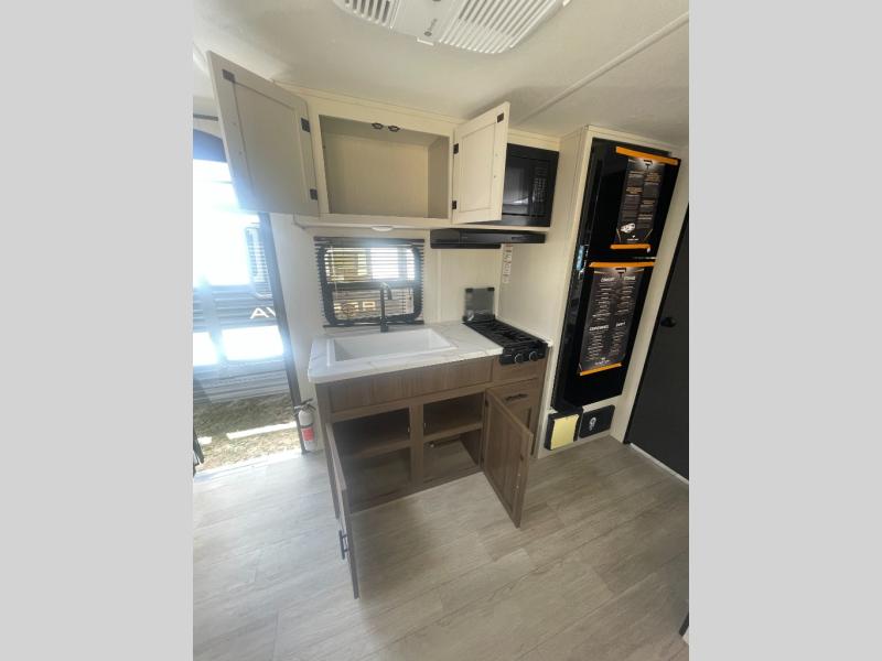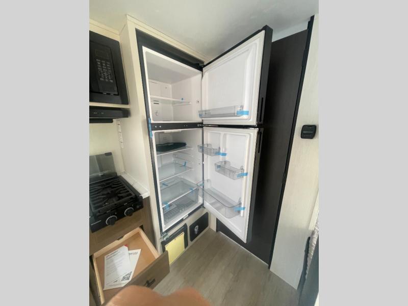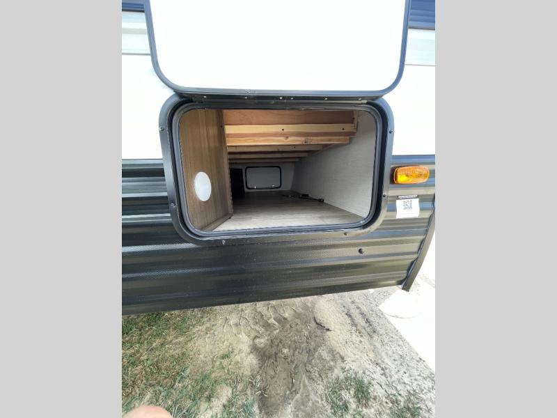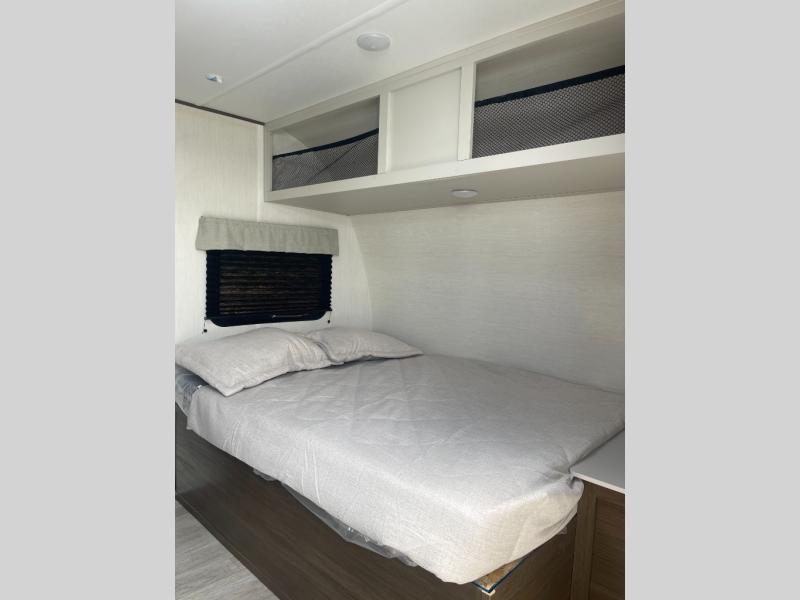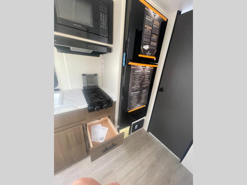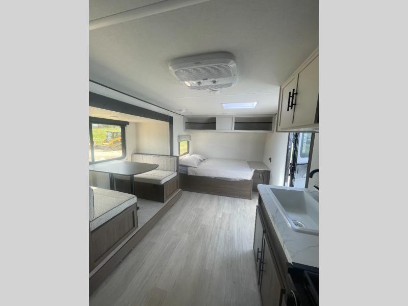 Go hiking, biking or exploring for new places when you have this trailer at the campgrounds! You will find sleeping for five between the rear corner bunk beds, and the front bed with a nightstand for your cellphones and such. And one more can sleep on the dinette slide. You'll be delighted with the kitchen skylight that gives natural lighting as you cook a meal. The LED-lit power awning provides a protected outdoor living area as you visit or make s'mores around the campfire.