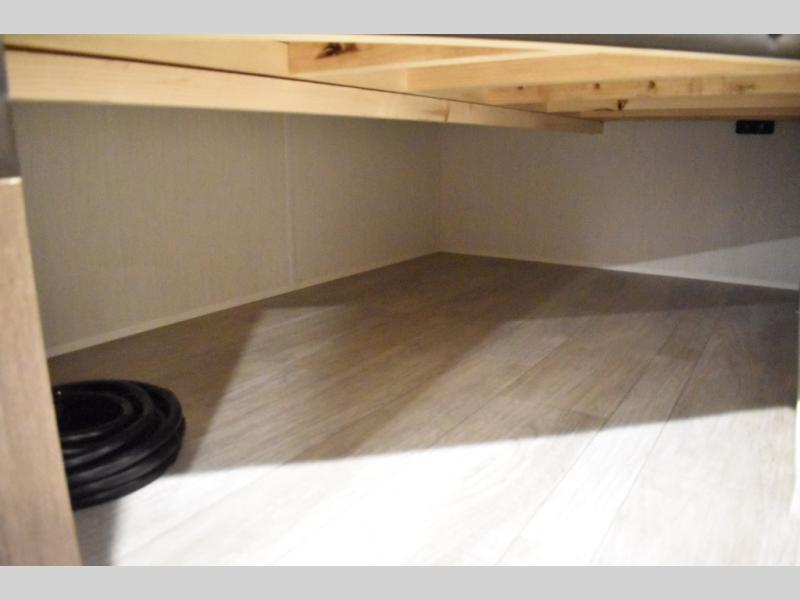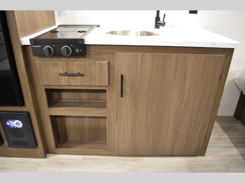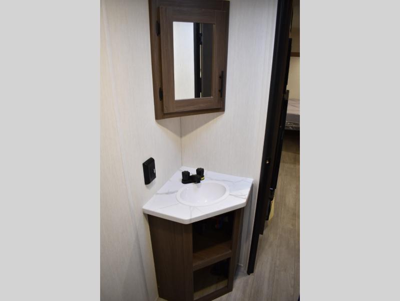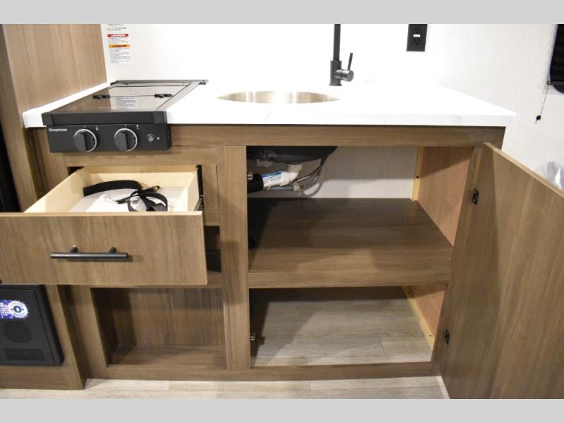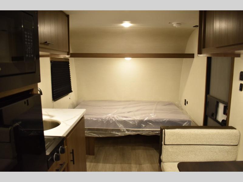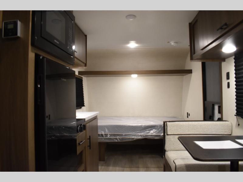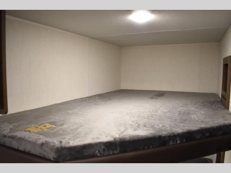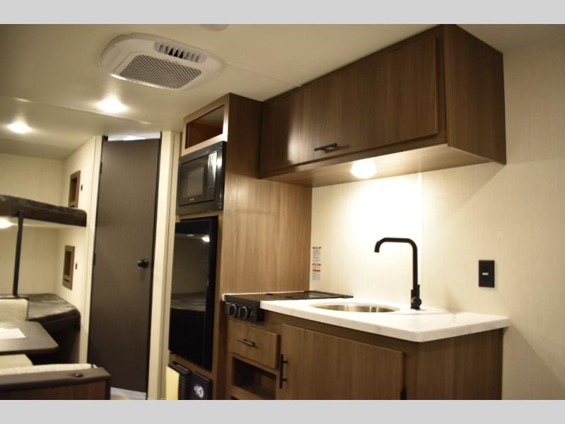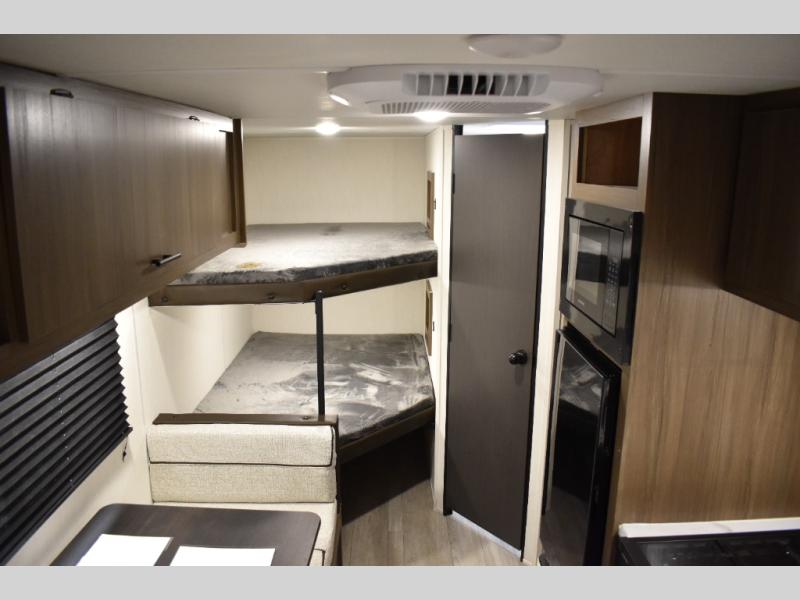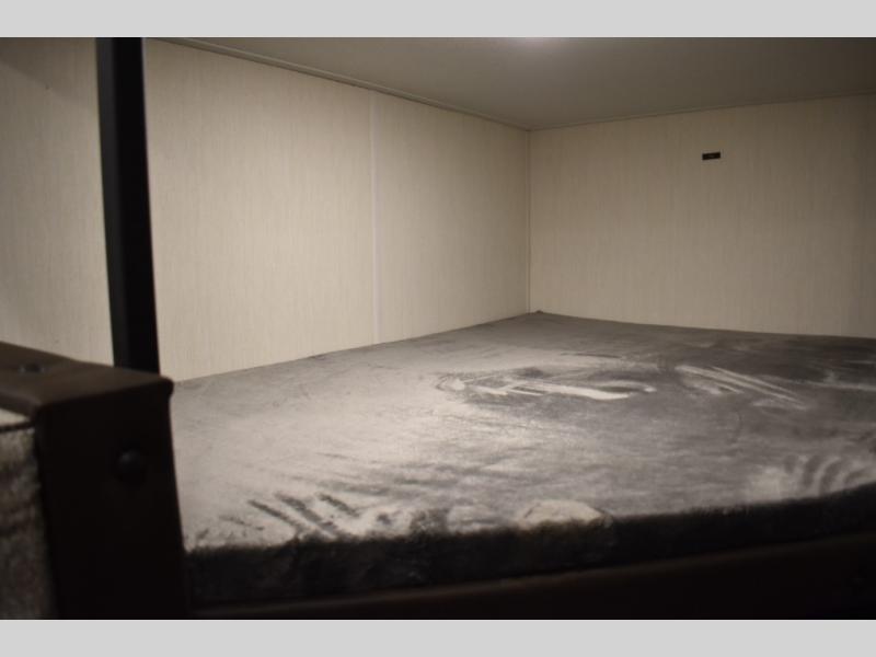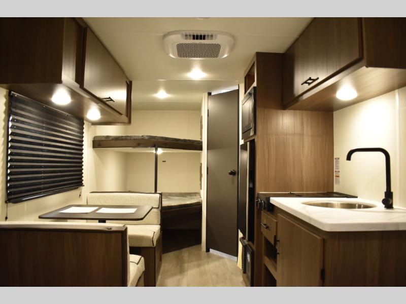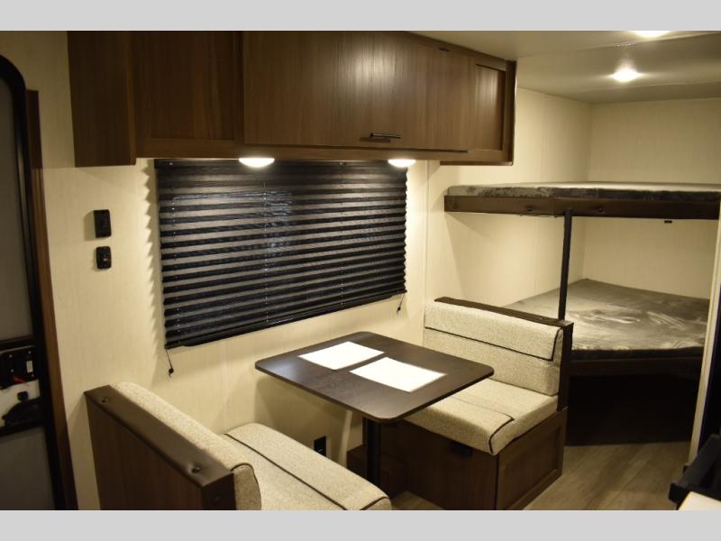 The whole family will love camping in this travel trailer! The kiddos can sleep on the set of bunk beds and you can sleep on the queen bed in the front. They can even invite a friend or two to tag along and sleep on the booth dinette when you aren't using it. Enjoy a meal prepared with the two-burner stove. Everyone can freshen up in the rear corner bathroom with the shower. When packing-up store all of your outdoor gear inside the front exterior storage!