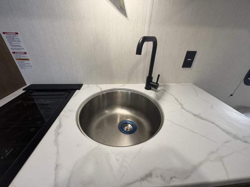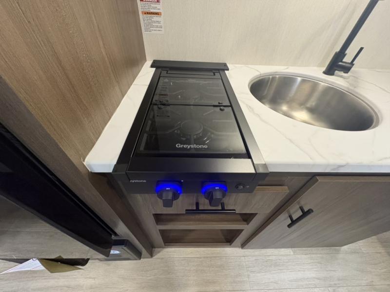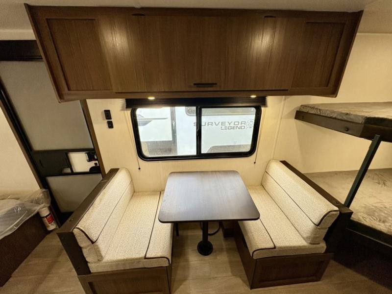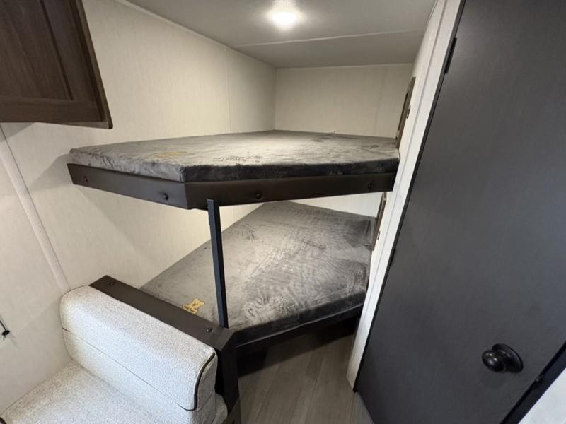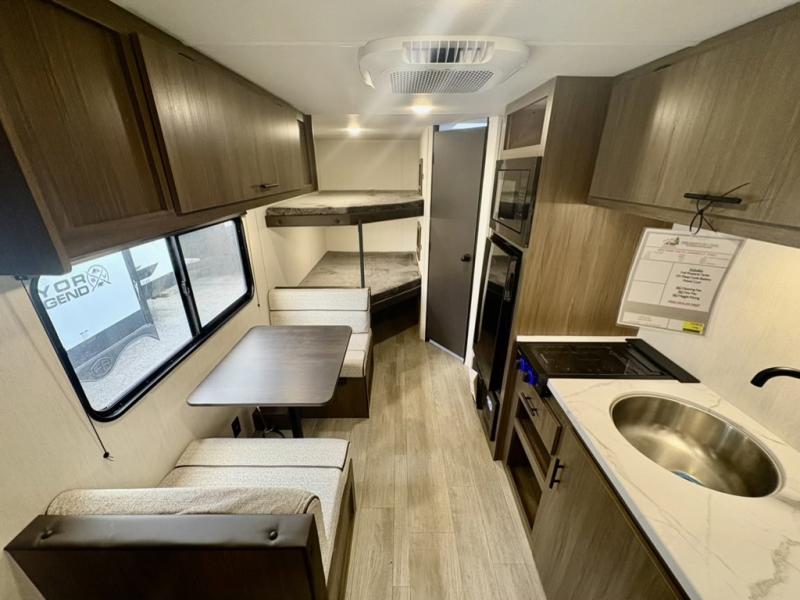 The whole family will love camping in this travel trailer! The kiddos can sleep on the set of bunk beds and you can sleep on the queen bed in the front. They can even invite a friend or two to tag along and sleep on the booth dinette when you aren't using it. Enjoy a meal prepared with the two-burner stove. Everyone can freshen up in the rear corner bathroom with the shower. When packing-up store all of your outdoor gear inside the front exterior storage!