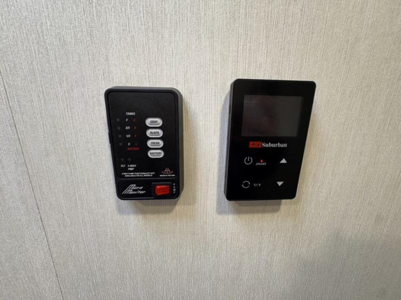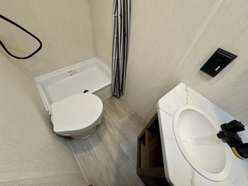 Each Avenger LT travel trailer by Prime Time features automotive grade exterior graphics, gold reflective windows, a smooth metal front, and a fully walkable 7'6"-wide roof, plus rear electric stabilizer jacks, a bumper with spare tire, exterior storage, a power awning, exterior 110V outlets, and a battery disconnect to make campsite setup easier. Inside, you’ll find seamless pressed countertops, blackout shades, a storage dinette, cozy camp queen beds with teddy bear bunk mats, and a bedside table with 110V outlets and USB ports, while the roof-mount 10K thermostat-controlled A/C, direct dump furnace, and tankless on-demand water heater help keep you comfortable in changing weather.
