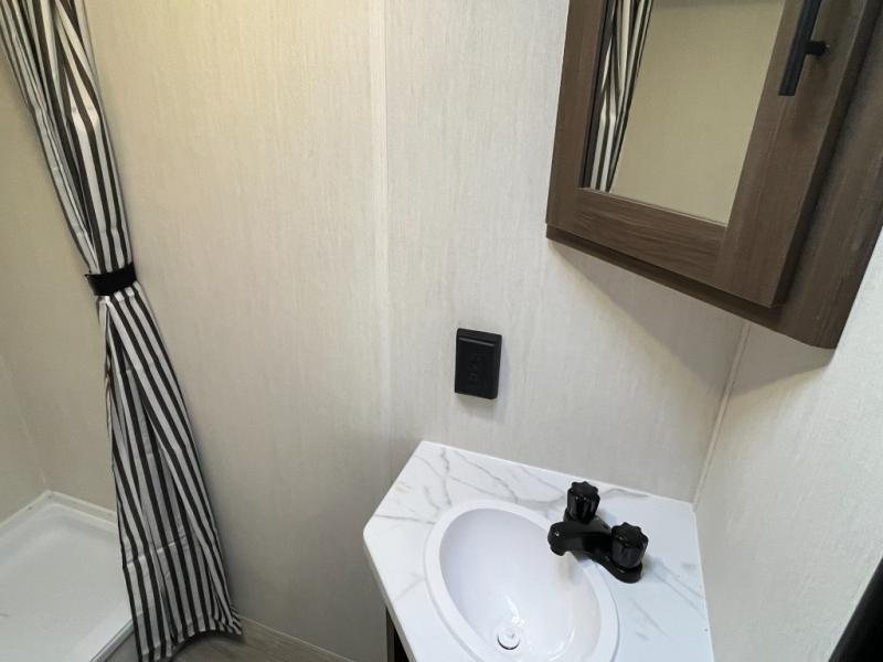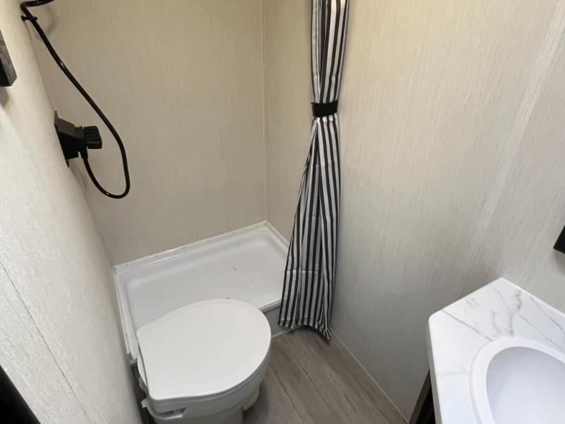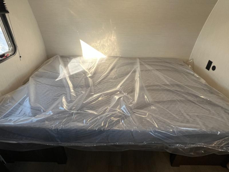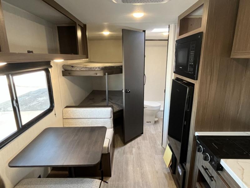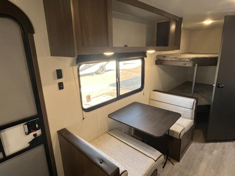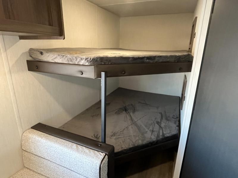 The whole family will love camping in this travel trailer! The kiddos can sleep on the set of bunk beds and you can sleep on the queen bed in the front. They can even invite a friend or two to tag along and sleep on the booth dinette when you aren't using it. Enjoy a meal prepared with the two-burner stove. Everyone can freshen up in the rear corner bathroom with the shower. When packing-up store all of your outdoor gear inside the front exterior storage!