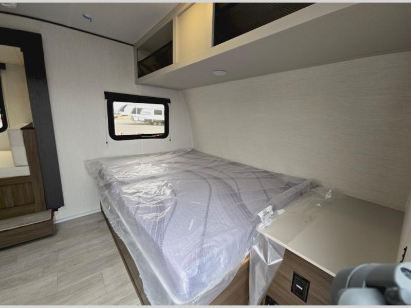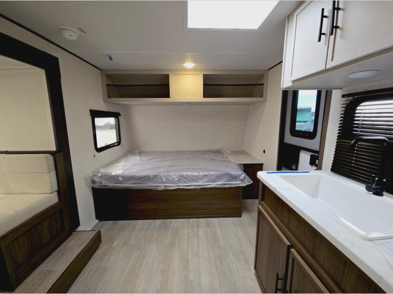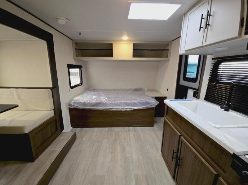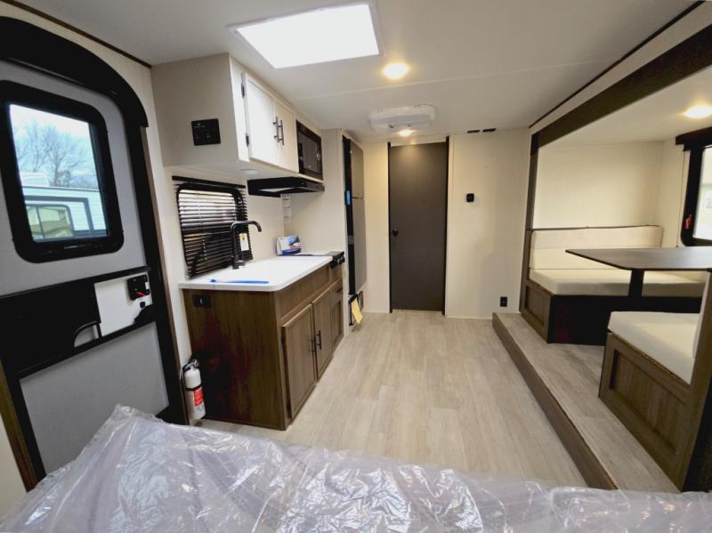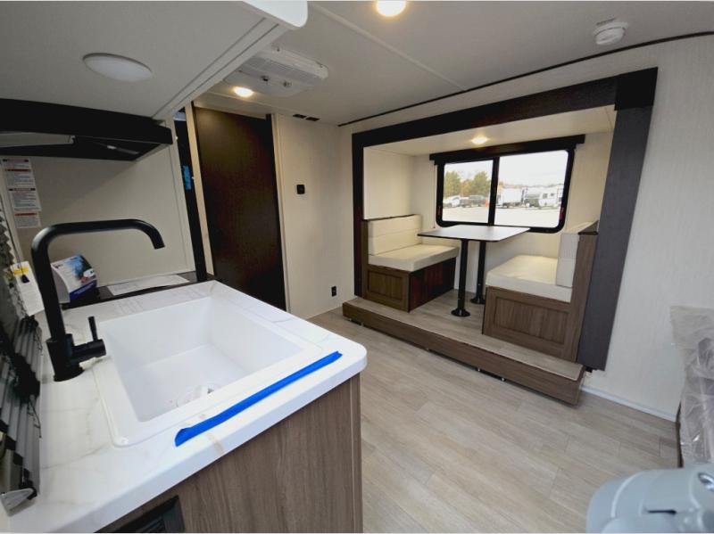 Enjoy a little more floor space in this trailer thanks to the dinette slide that can be utilized as a dining, gaming and/or sleeping space. The front camp queen bed offers overhead storage and a nightstand to keep your things tidy. The galley kitchen includes everything you need to make warm meals, and store leftovers in the 12V refrigerator. The rear bathroom offers privacy and convenience when changing and getting cleaned up, and there is also linen storage which is handy.