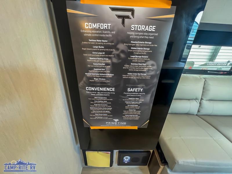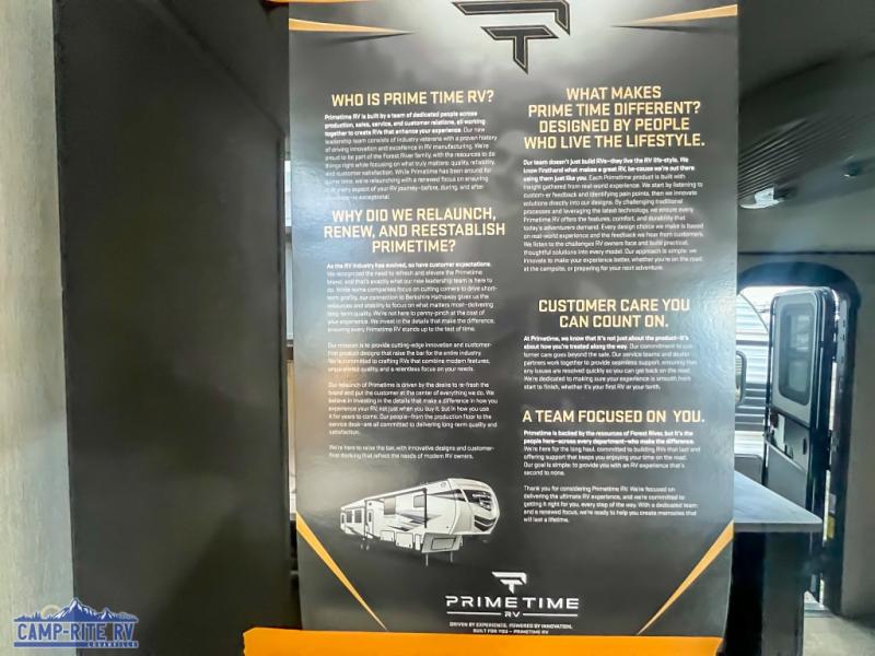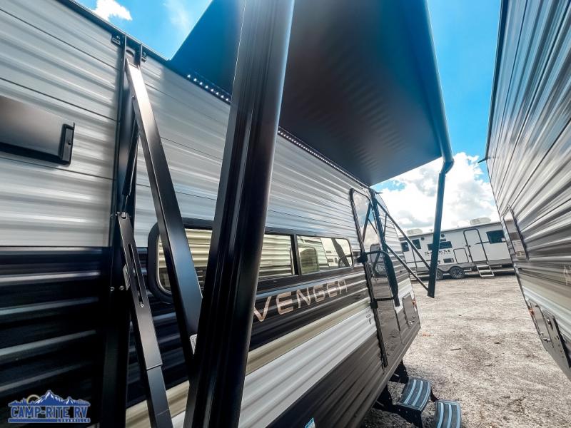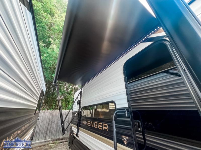 With any Avenger LT travel trailer by Prime Time, the exterior includes an aerodynamic smooth front metal, a front diamond plate for protection on the road, and two stabilizer jacks. There is also exclusive Everlast construction, a PVC roof membrane, and solar prep for the option to go off-grid. The interior offers seamless Carefree Congoleum flooring for easy cleanup and durability, pleated night shades throughout for privacy, a bottle opener, and residential extended ball bearing drawer guides.