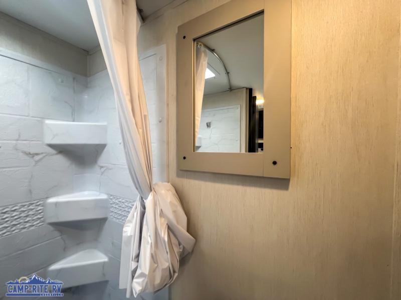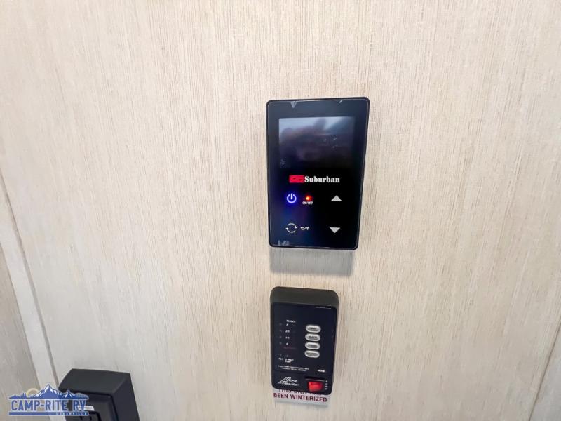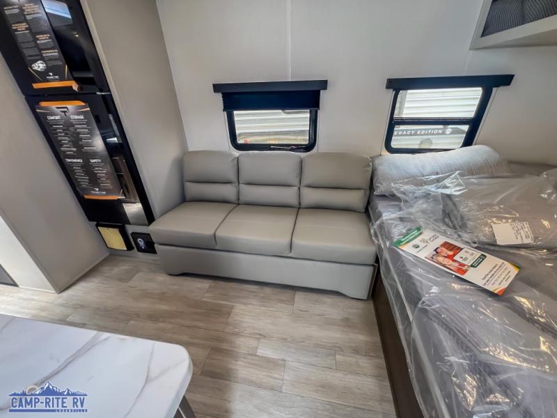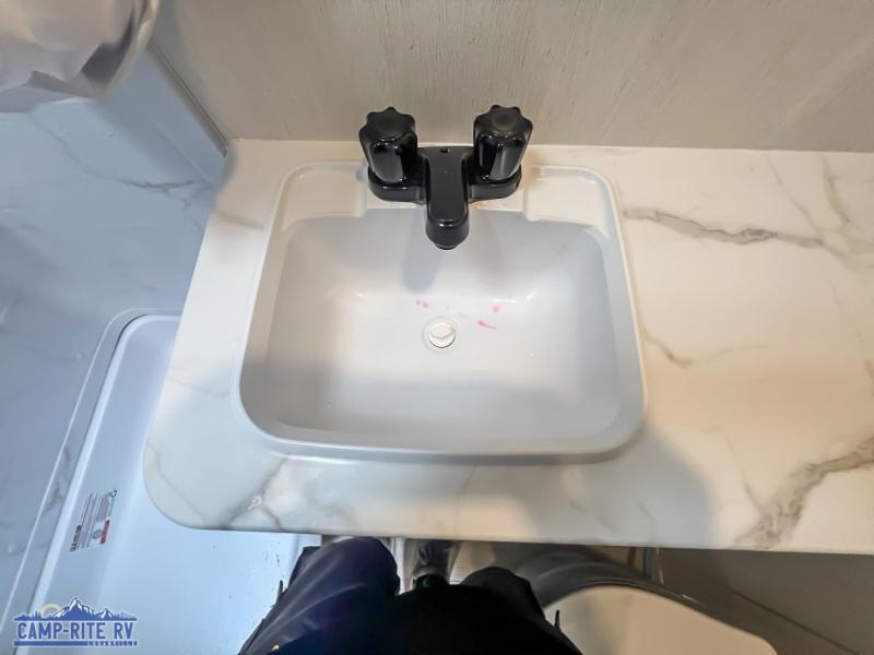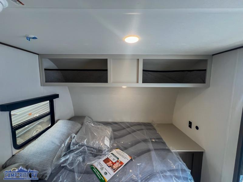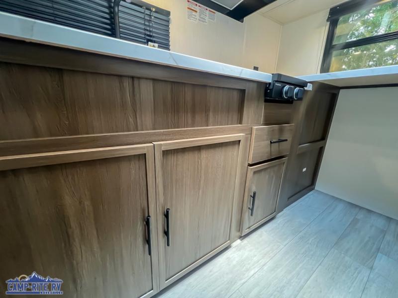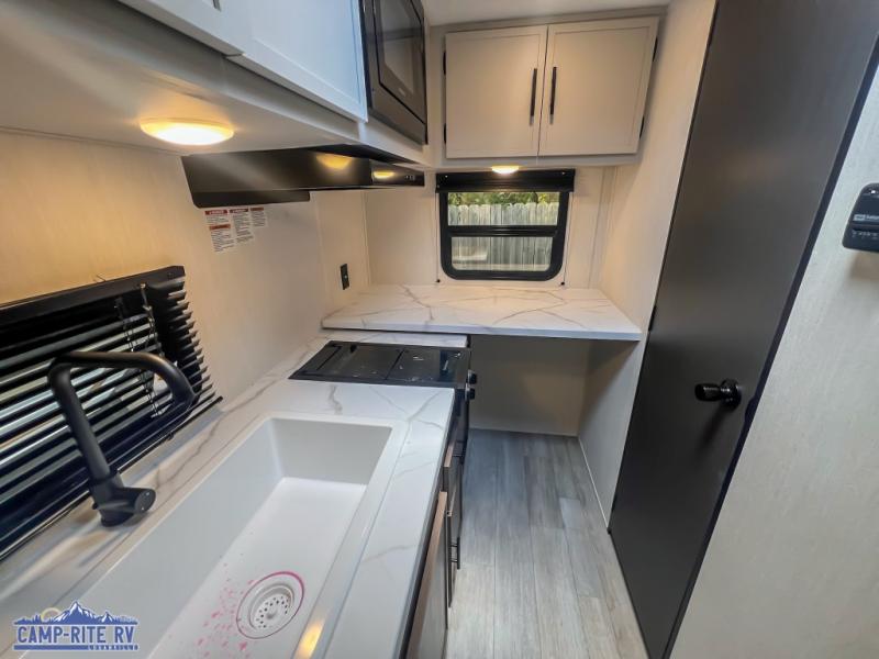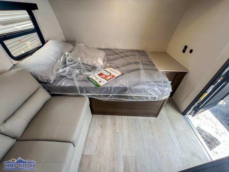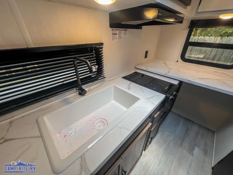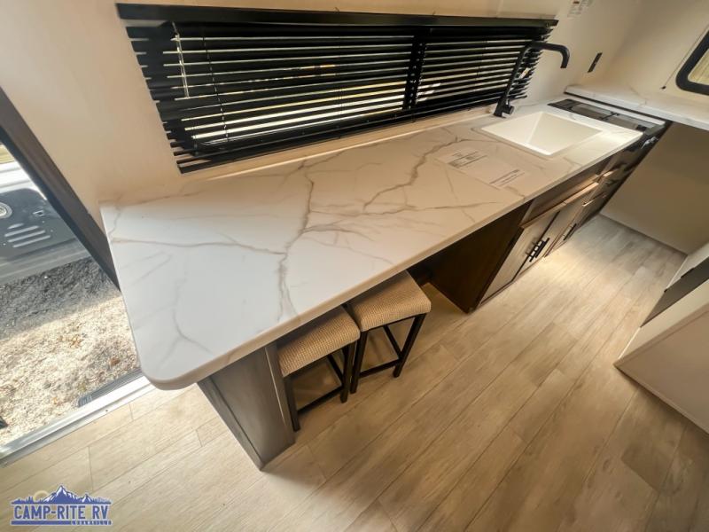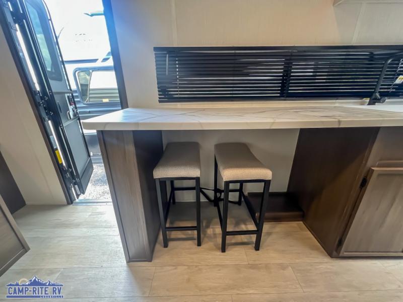 Camping in this travel trailer will be just what the doctor ordered! The rear corner kitchen includes ample counter space to prep meals, along with a desktop if you need to get some work done. The bartop with two stools will provide a place to dine together, and the sofa lets you relax in the evenings. Cook all of your meals on the two burner cooktop or in the electric microwave, and store your food in the 10.7 cu. ft. 12V refrigerator. A full bath lets you freshen up before bed, and the nightstand at the foot of the queen bed will keep your belongings tucked away!