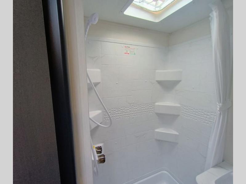 Camping in this travel trailer will be just what the doctor ordered! The rear corner kitchen includes ample counter space to prep meals, along with a desktop if you need to get some work done. The bartop with two stools will provide a place to dine together, and the sofa lets you relax in the evenings. Cook all of your meals on the two burner cooktop or in the electric microwave, and store your food in the 10.7 cu. ft. 12V refrigerator. A full bath lets you freshen up before bed, and the nightstand at the foot of the queen bed will keep your belongings tucked away!