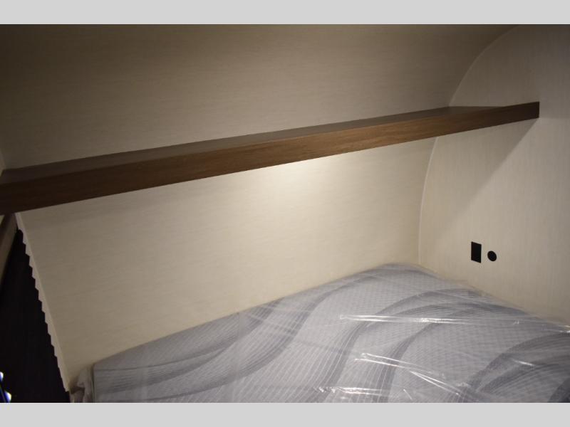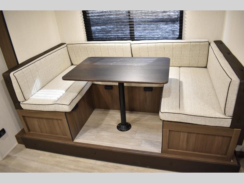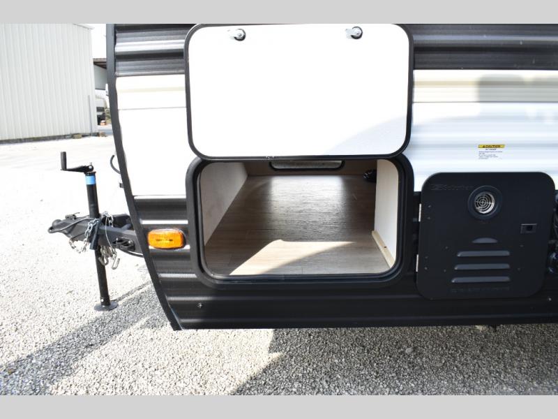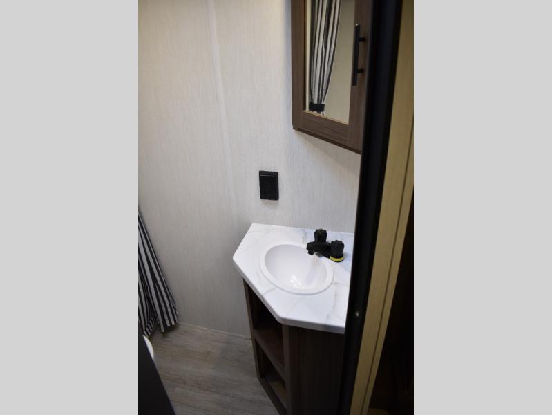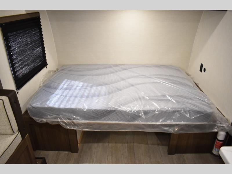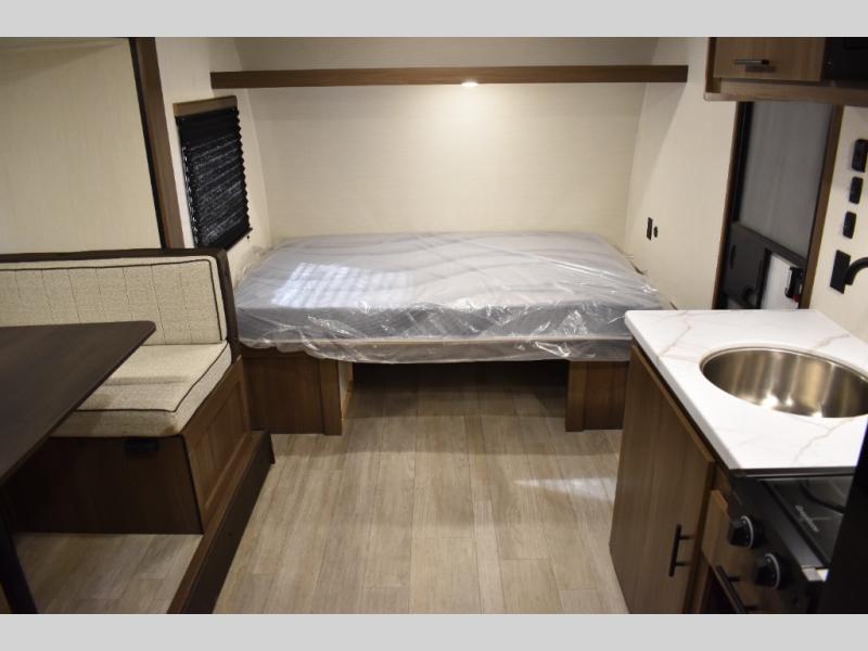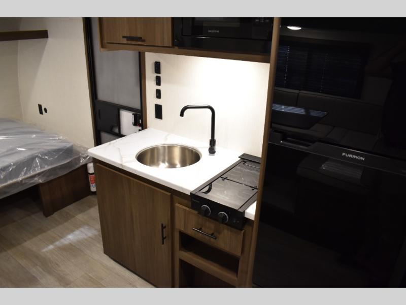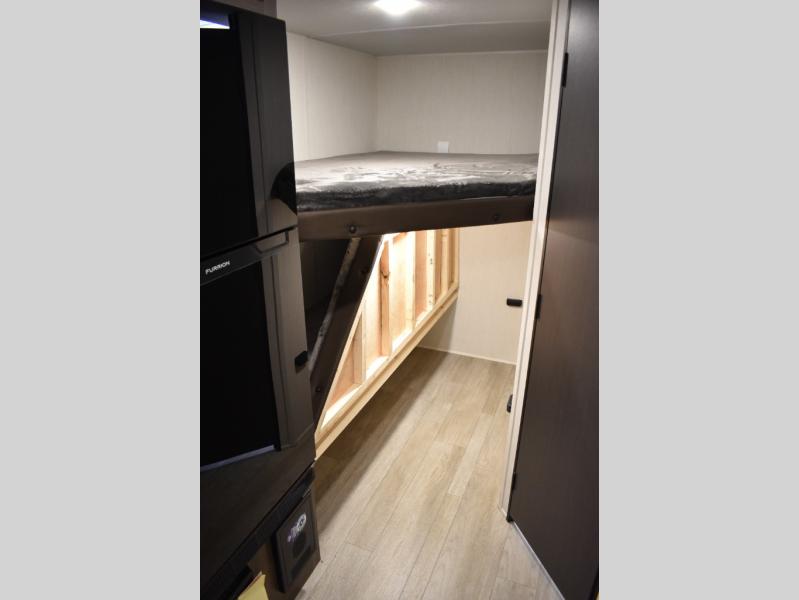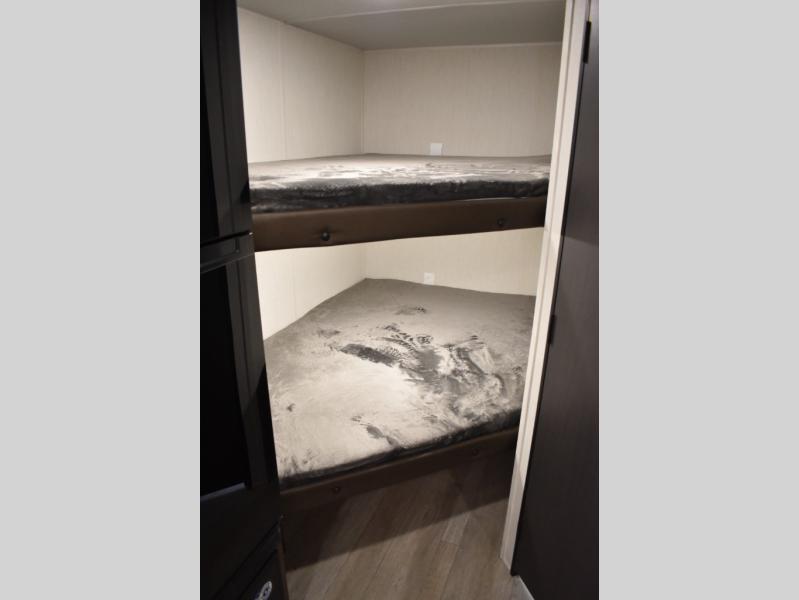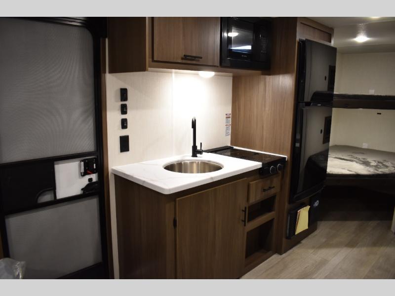 Go hiking, biking or exploring for new places when you have this trailer at the campgrounds! You will find sleeping for the family between the rear corner bunk beds, and the front bed with a with a shelf for your belongings and such. And even more can sleep on the dinette slide. You'll be delighted to cook in the kitchen on the two-burner stove, and there is a farmhouse sink for easy clean-up. The power awning provides a protected outdoor living area as you visit or make s'mores around the campfire.