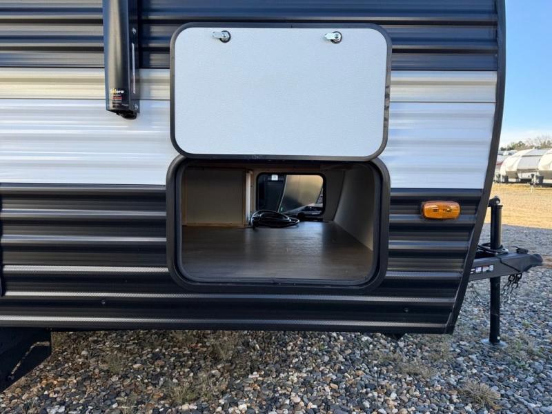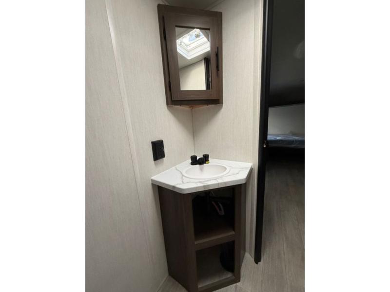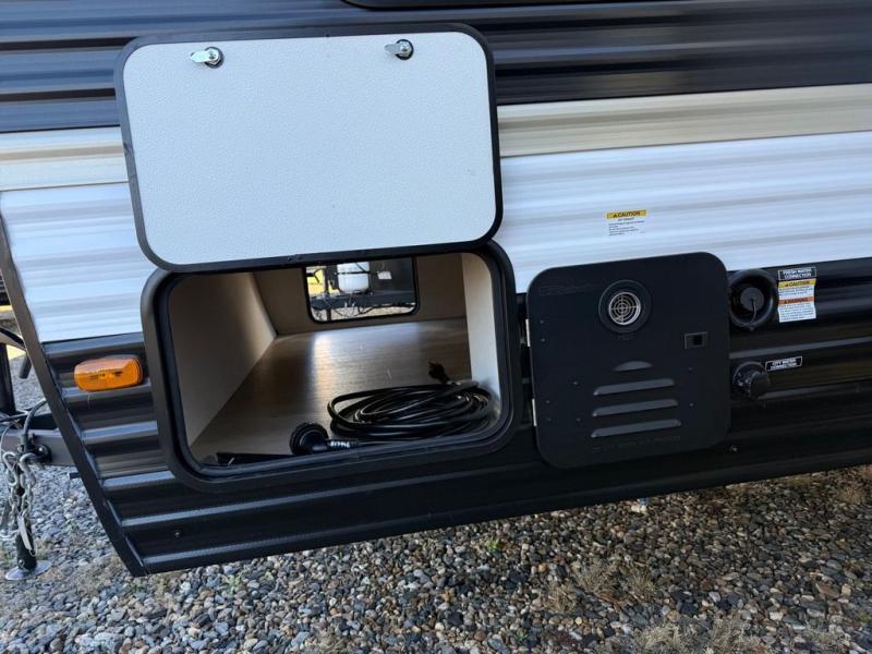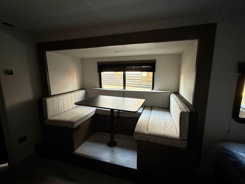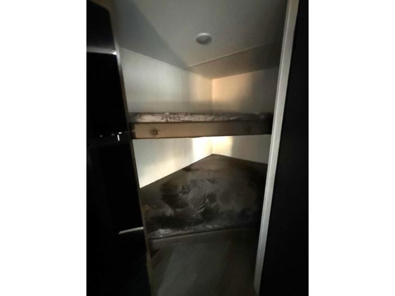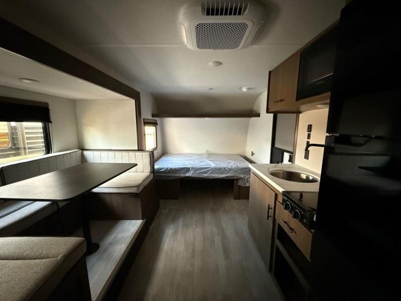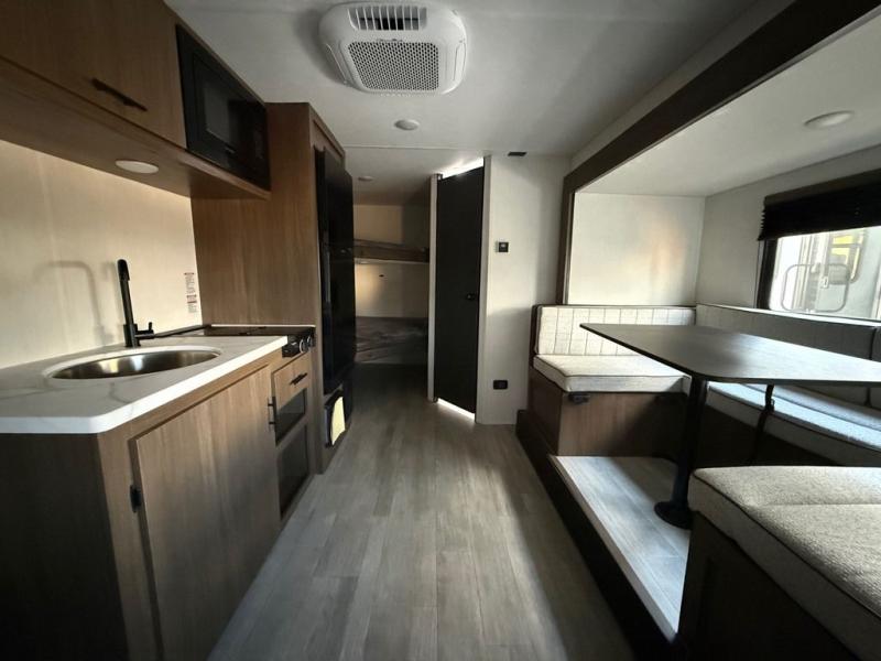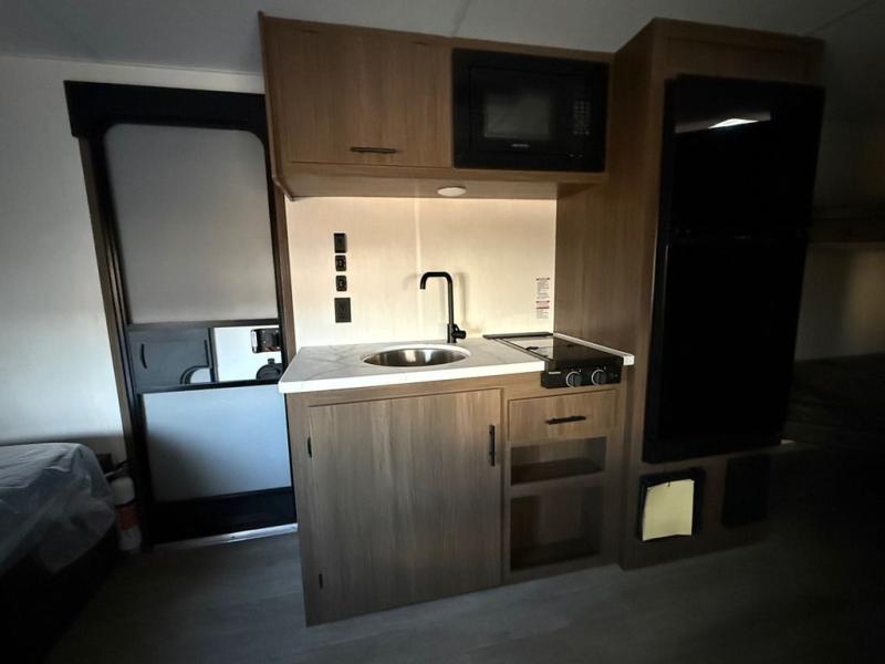 Go hiking, biking or exploring for new places when you have this trailer at the campgrounds! You will find sleeping for the family between the rear corner bunk beds, and the front bed with a with a shelf for your belongings and such. And even more can sleep on the dinette slide. You'll be delighted to cook in the kitchen on the two-burner stove, and there is a farmhouse sink for easy clean-up. The power awning provides a protected outdoor living area as you visit or make s'mores around the campfire.