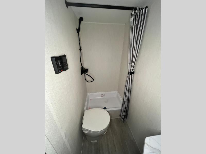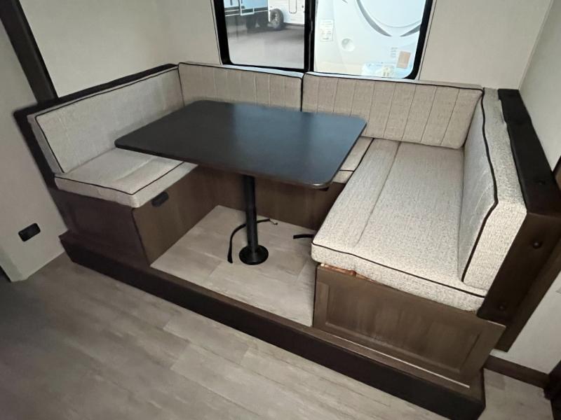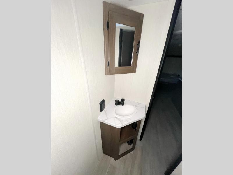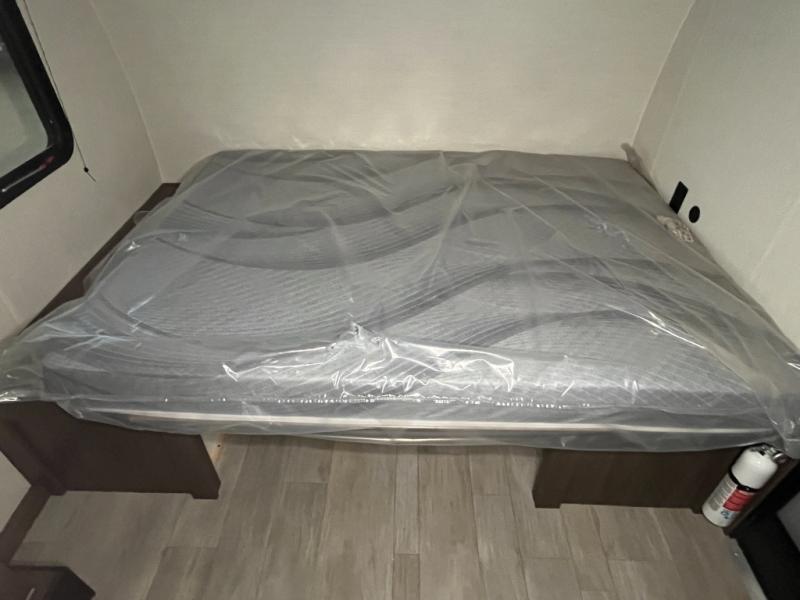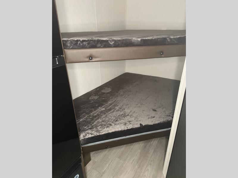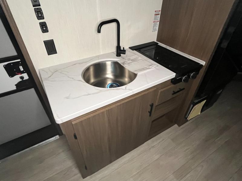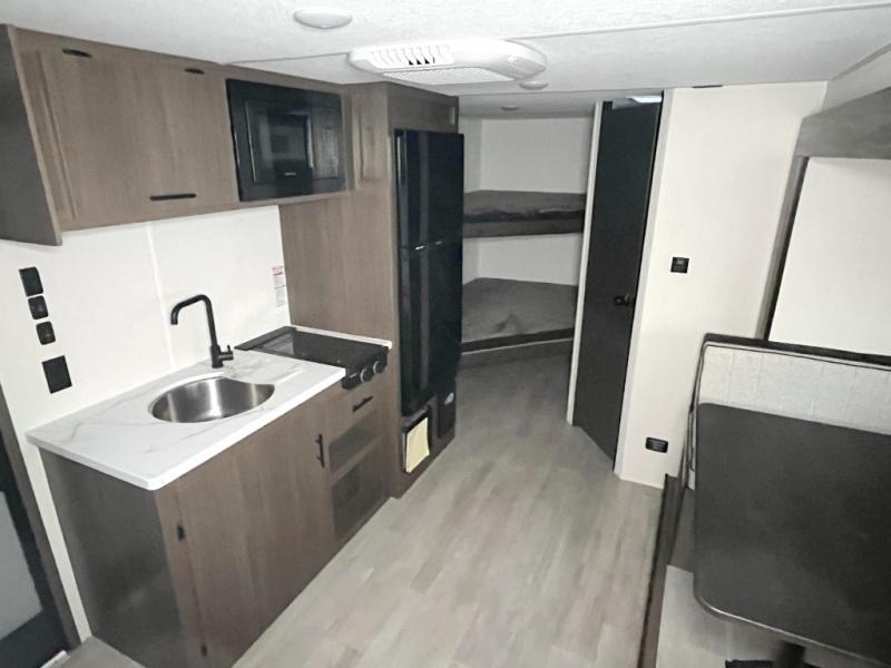 Go hiking, biking or exploring for new places when you have this trailer at the campgrounds! You will find sleeping for the family between the rear corner bunk beds, and the front bed with a with a shelf for your belongings and such. And even more can sleep on the dinette slide. You'll be delighted to cook in the kitchen on the two-burner stove, and there is a farmhouse sink for easy clean-up. The power awning provides a protected outdoor living area as you visit or make s'mores around the campfire.